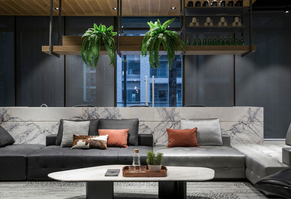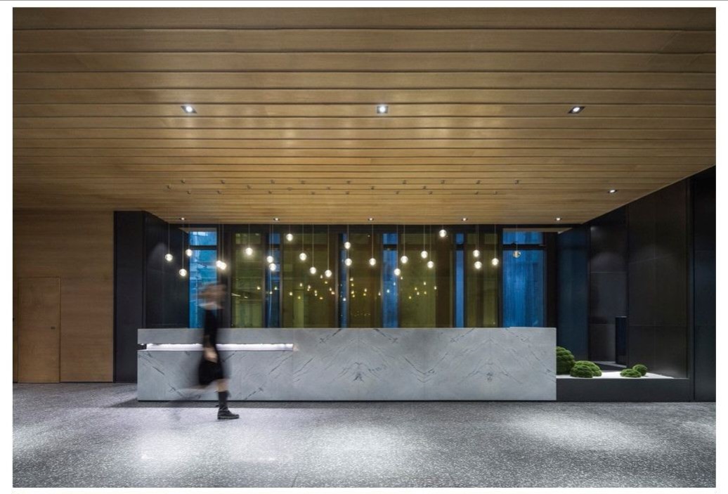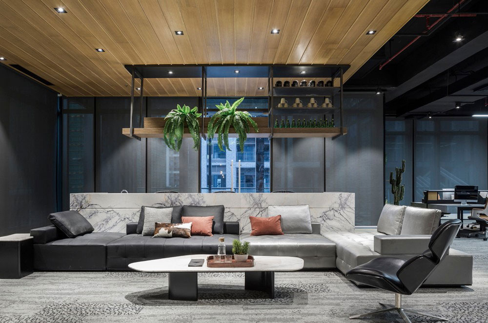 作为职场办公的门面担当,门厅以现代简约风格加自然元素组成。大面积的木、灰既能奠定空间稳健、深湛的基调,又能让人回归自然的灵犀;右侧前台低调而不失魄力,上方满含深意的圆形标志散发着一种卓然而端重的菁英格调,既宣扬律政领域的价值理念,又能展现品牌形象,增强访客记忆点。