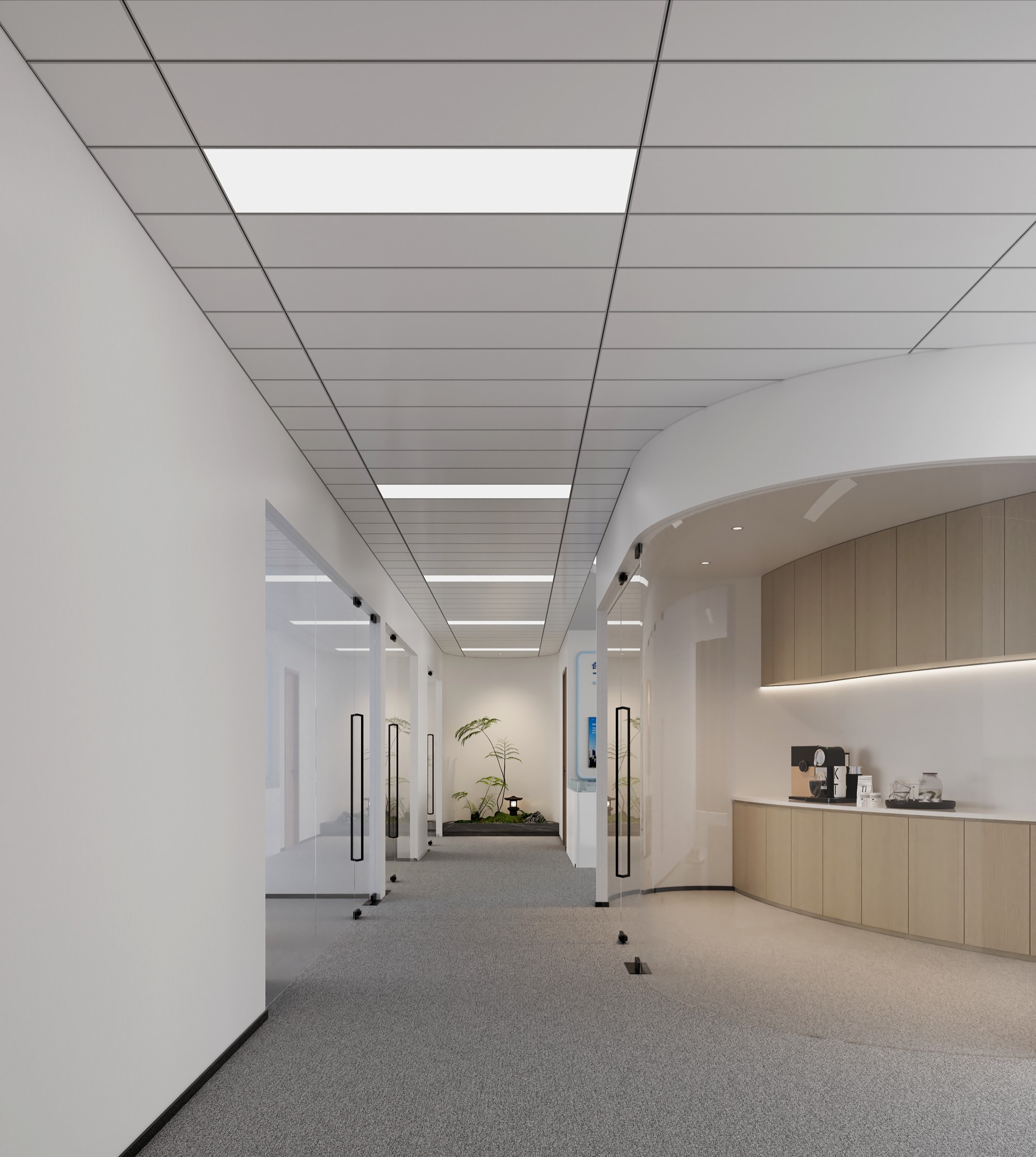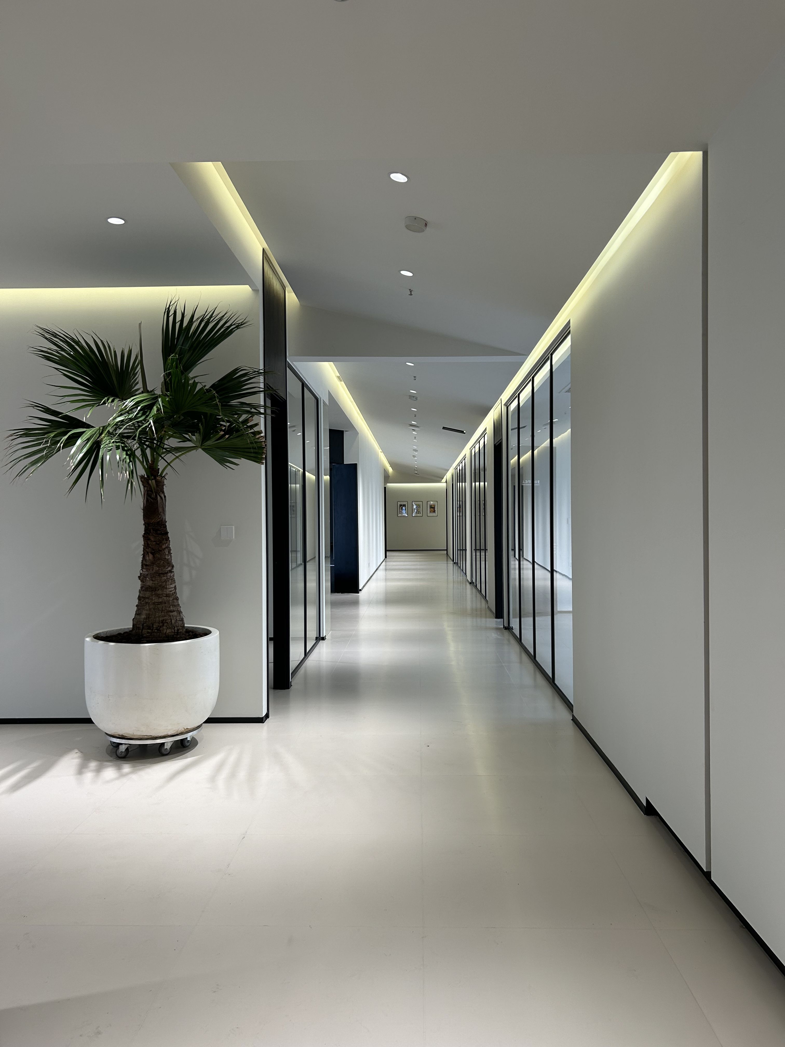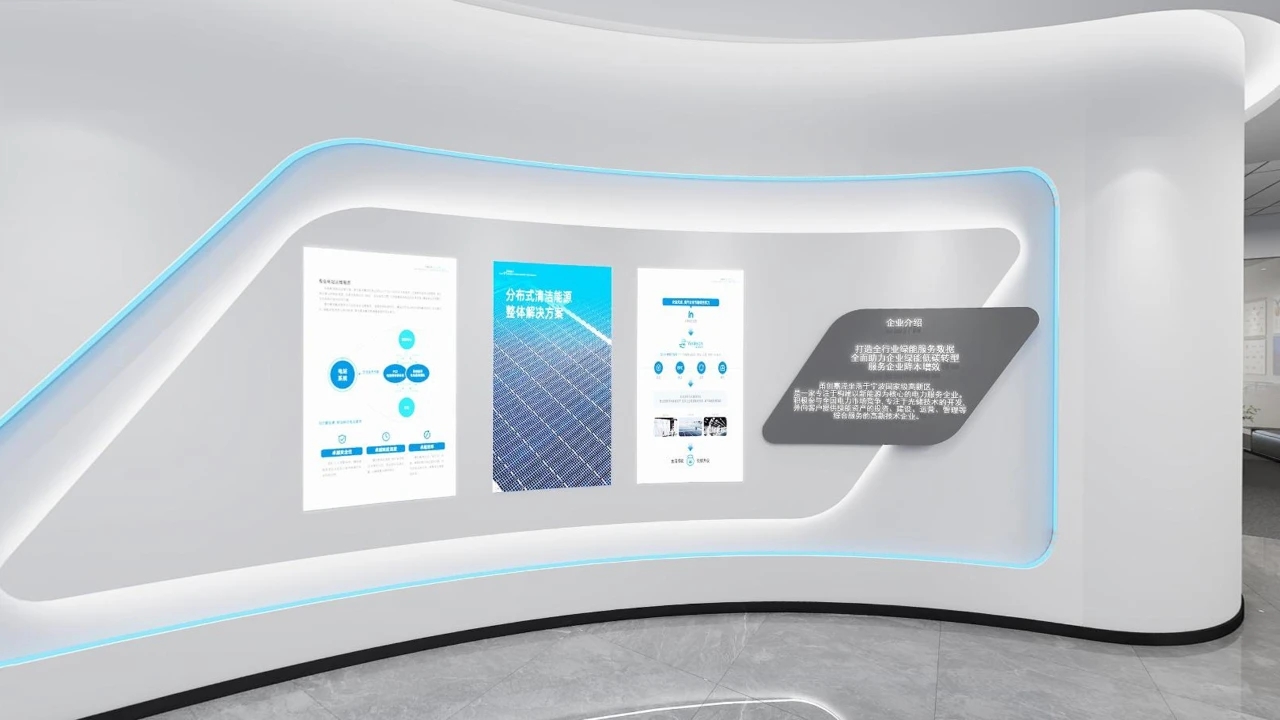 展厅作为前台的延展空间,风格色调继续保持一致。设计理念注重简约、科技感以及品牌展示。空间布局通透开放,利用线条灯带营造氛围,色彩上以蓝白相间为主色调。