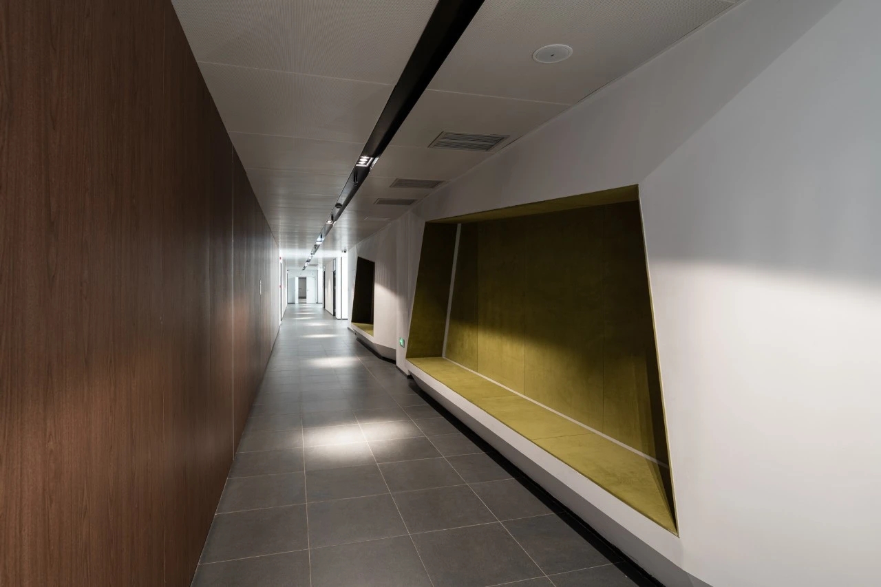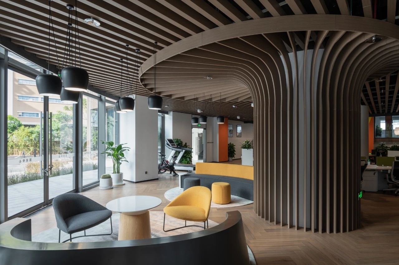 共享办公区内流动的天花弧线犹如叶脉一般,被紧紧联结并向上生长。餐厅区域设置孔雀蓝的铝制格栅,结合不同明度的灰色地砖、沉稳的木饰面以及形状奇特的灯具,各种利落流畅的线条运用其中,形成彼此呼应而又统一的美感。