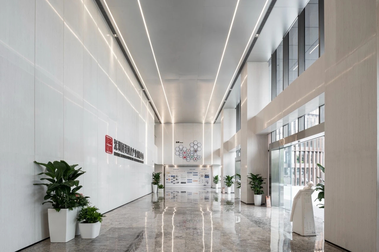 首层大堂的挑高空间运用大面积的灰白色调,形成视觉上的延伸,突出场所的宽敞透亮,大理石、铝板和不锈钢等材料的组合点缀,呈现简洁现代的空间氛围。