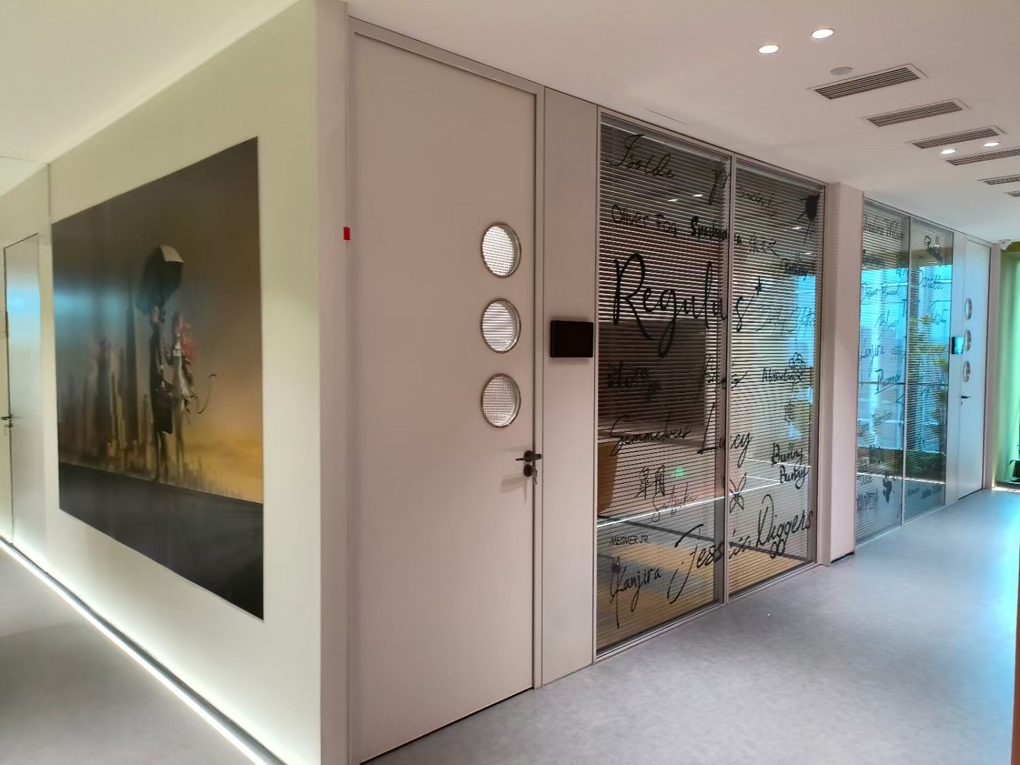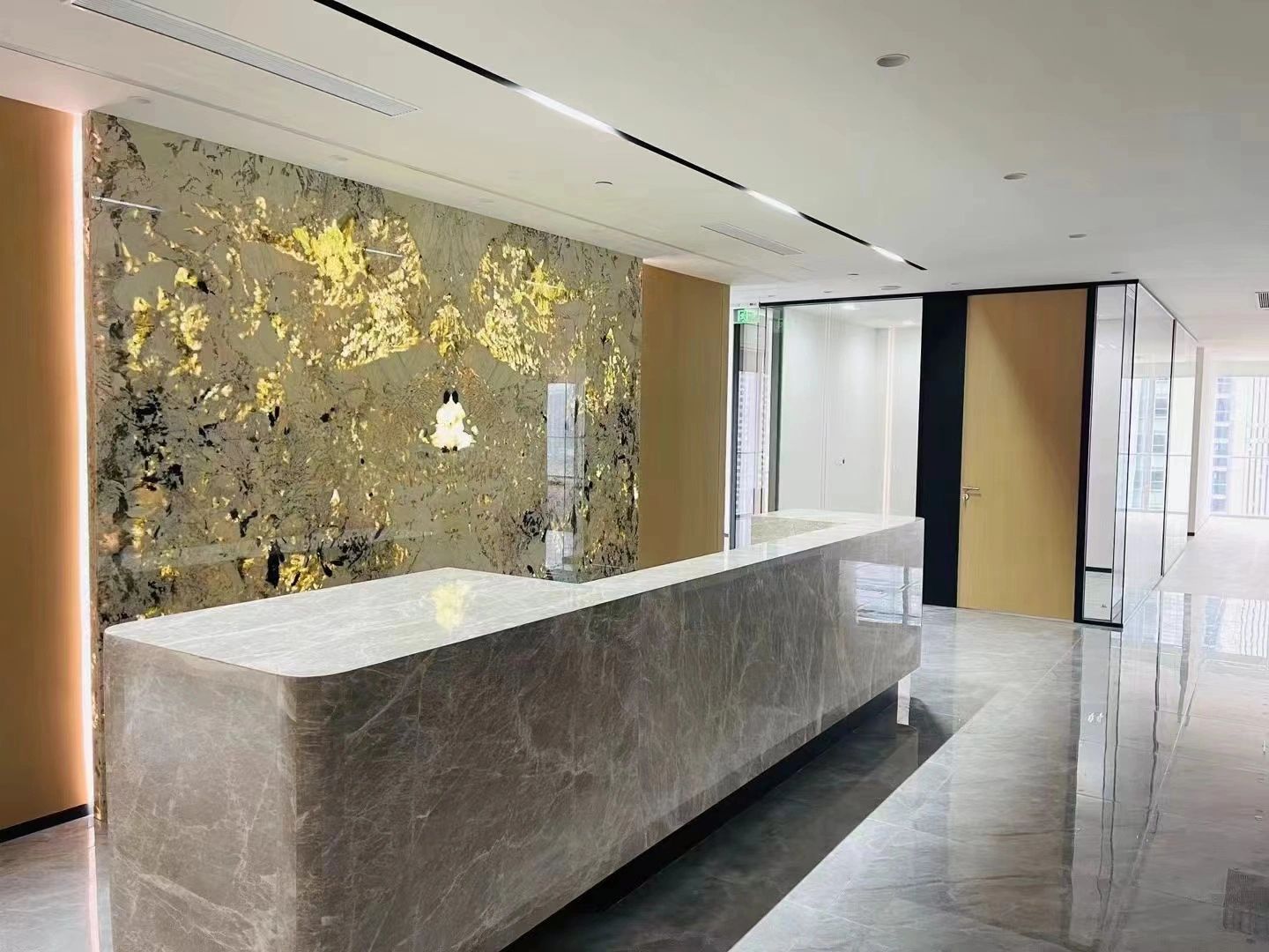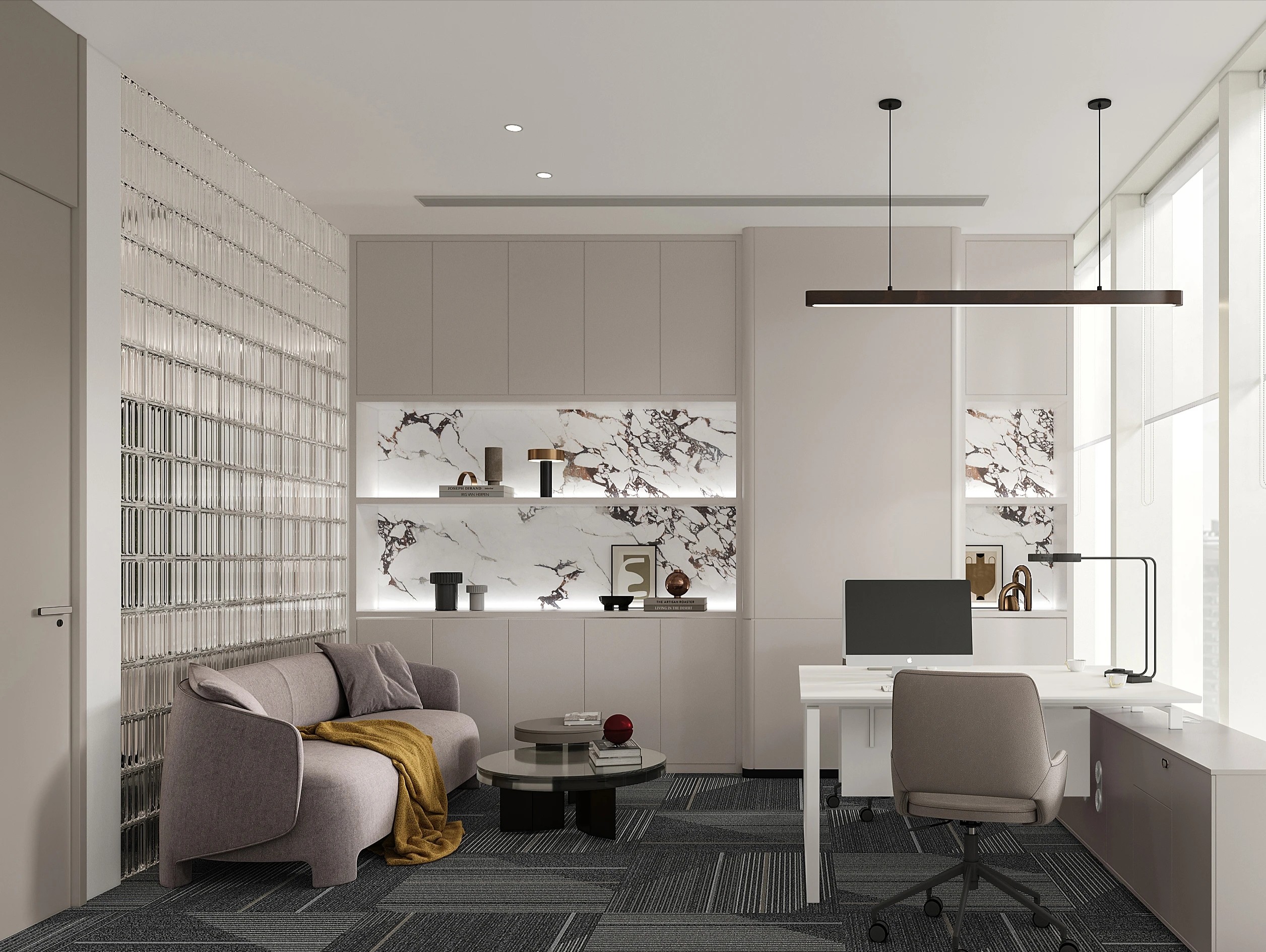 灰色地毯的使用可以降低地面的反光,也能中和空间的白色色调,让整体看起来更加协调。无缝玻璃则可以增加办公室的艺术氛围,同时也能打破办公室材质的单一,让空间看起来更加年轻跳跃,而鎏金大理石裂纹则可以增加办公室的气质,为空间赋予时尚改高级的氛围。