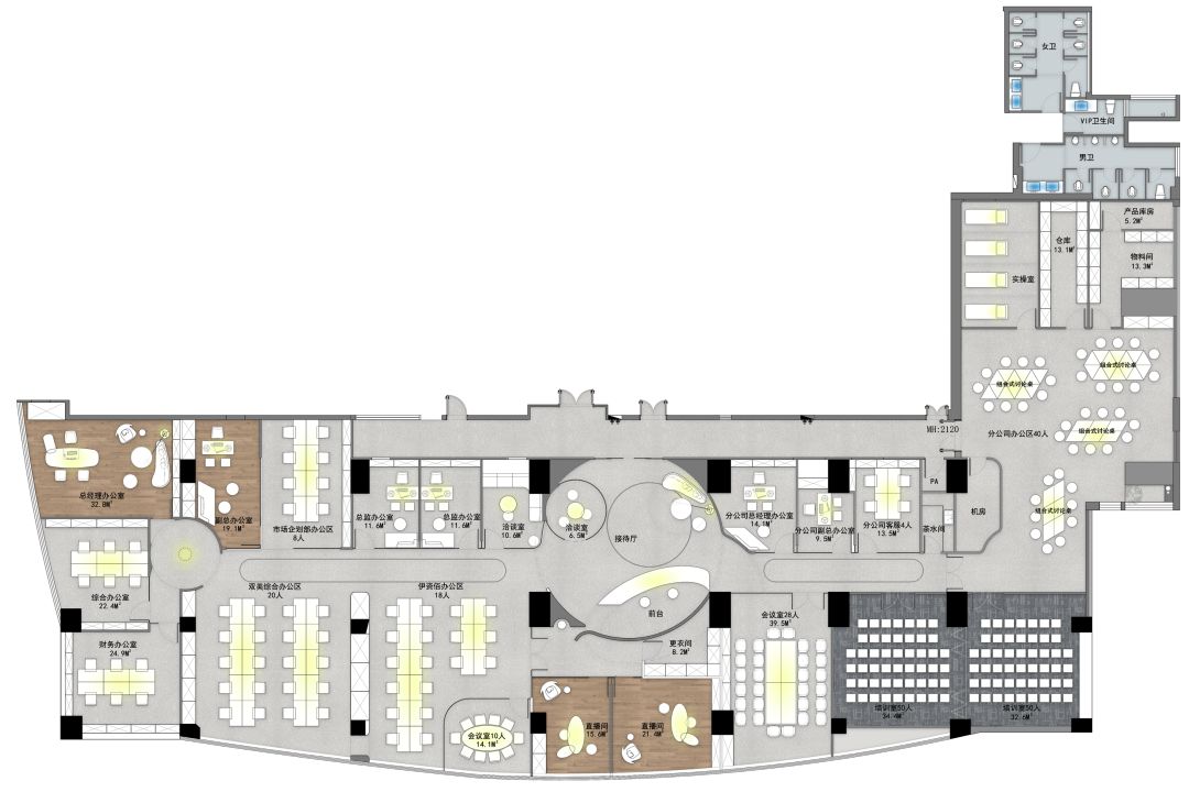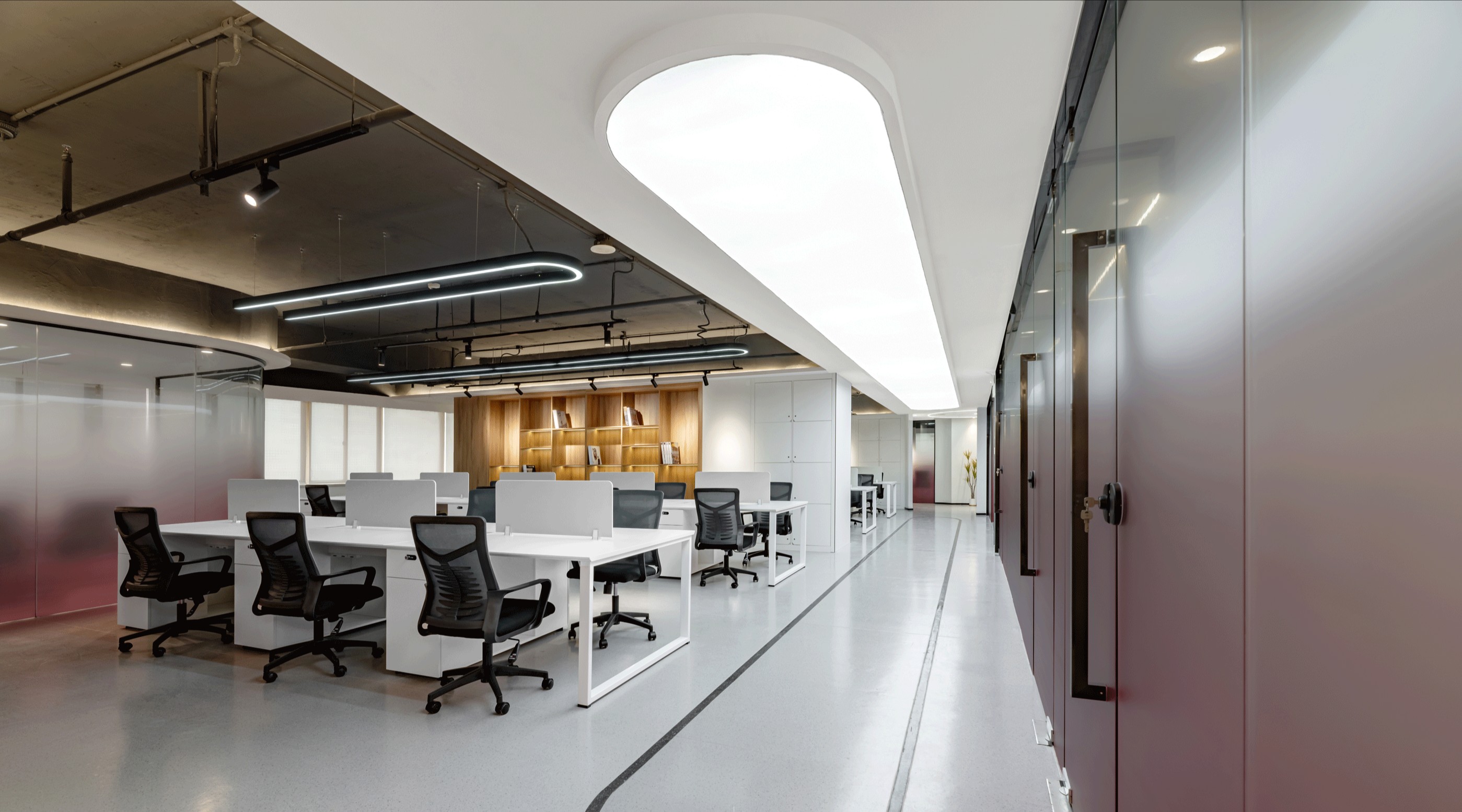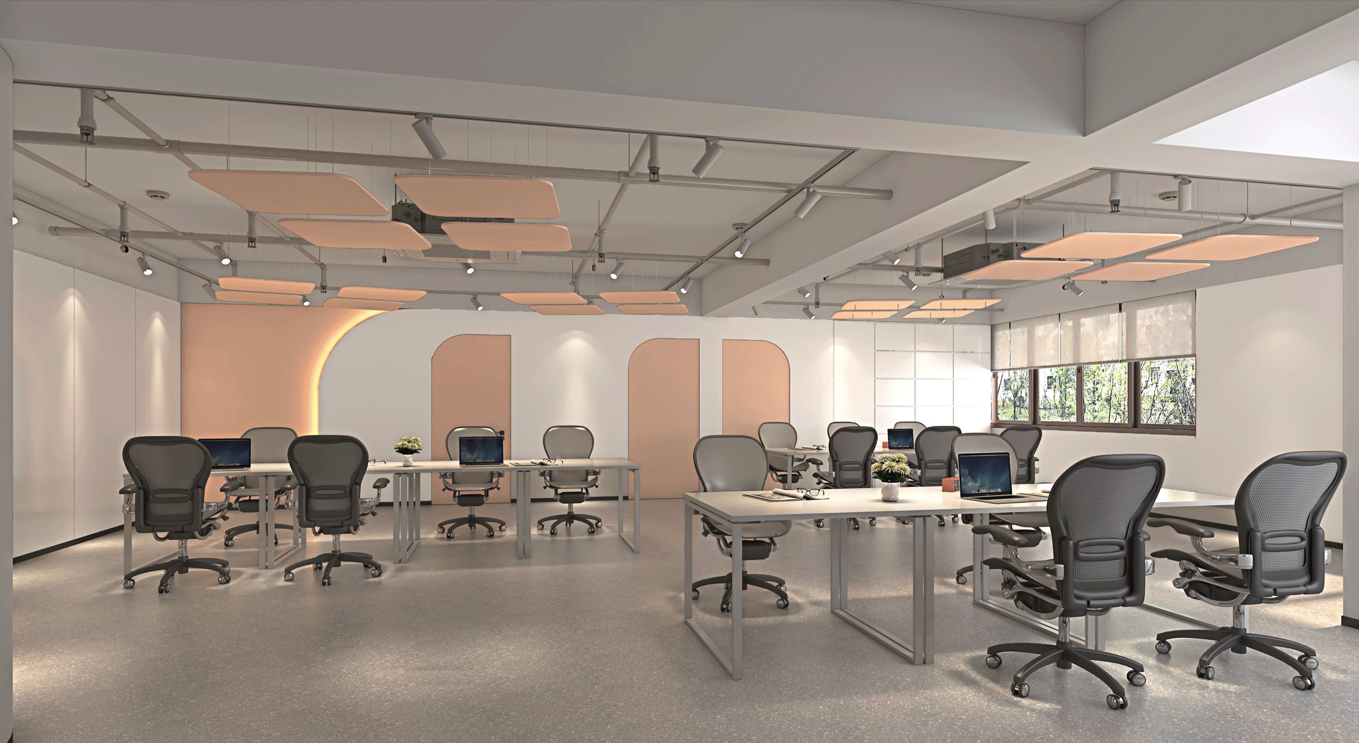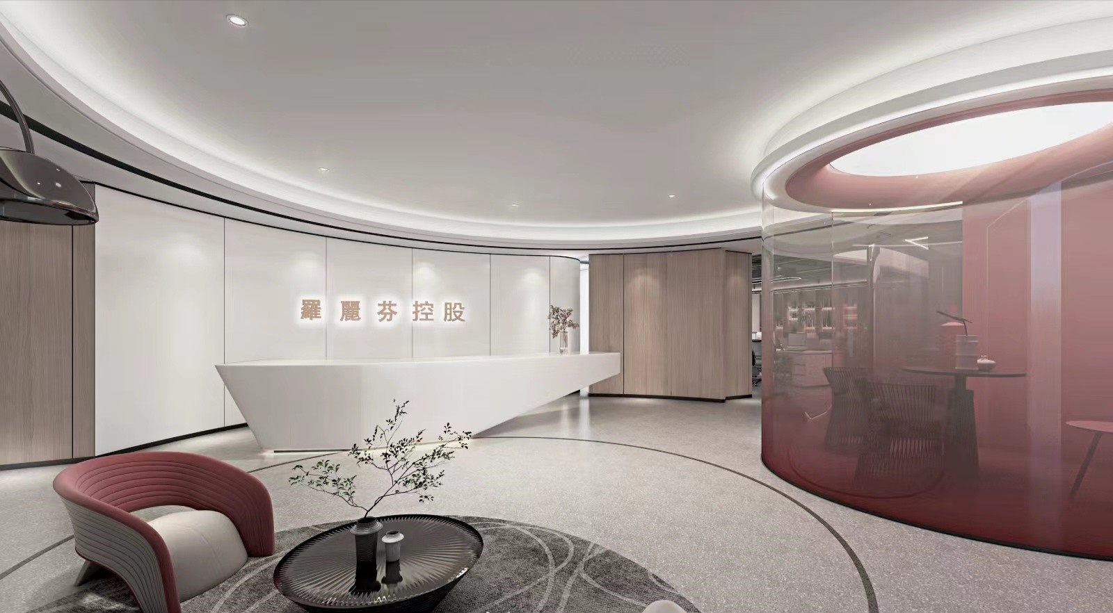 入口的细节,一进门的科技感,全景式交互让人瞬间沉浸其中,光以曲线的形式在天花游动。联结起空间的关系,同时运用弧形玻璃打造洽谈室,仿佛如遨游太空的船舱,提升空间的流动性和科技感。进门处的洽谈室和办公区的会议室均使用了渐变玻璃,颜色由紫红色向透明过渡,呼应罗丽芬LOGO。 开放办公区以自然感为主,给人以放松愉悦的办公环境,过道天花采用椭圆形透光膜照明,灯膜与地板的弧线相互呼应。来到多功能办公空间,办公IP以从事医美相关行业人群为主,开放的空间搭配轻巧的办公桌,可为后续培训或是聚会做出改变,空间元素上采用裸粉色加上具有女性代表的弧度,让空间更具柔美感。