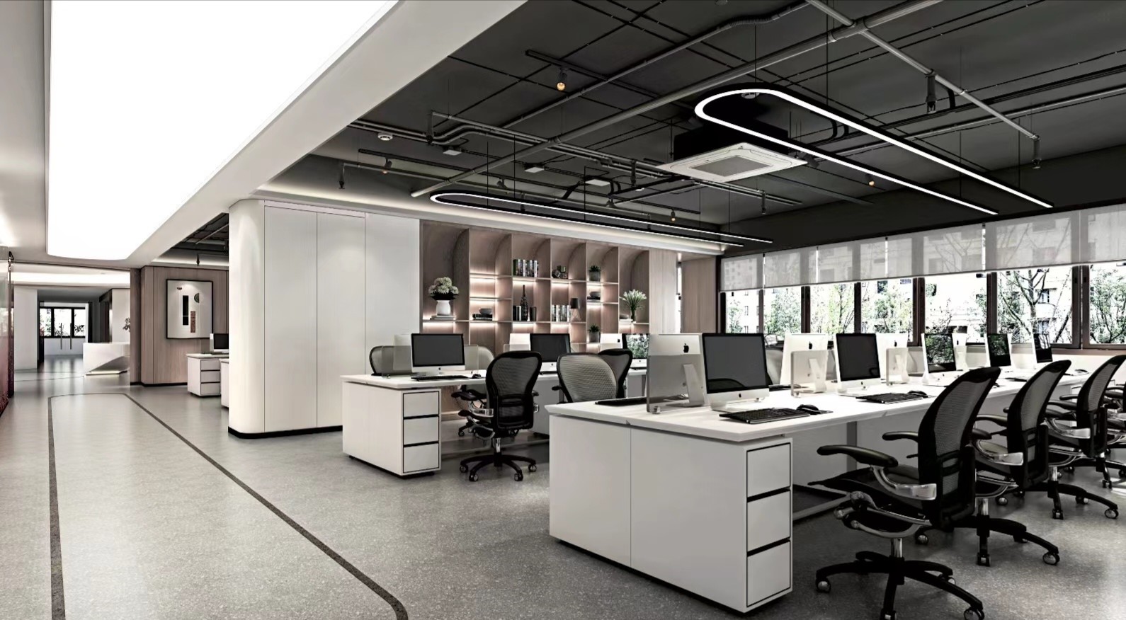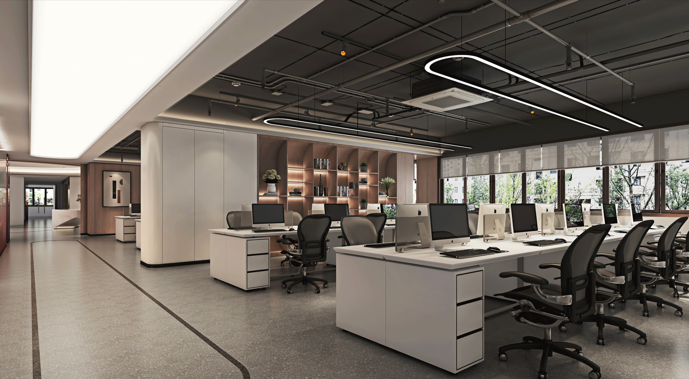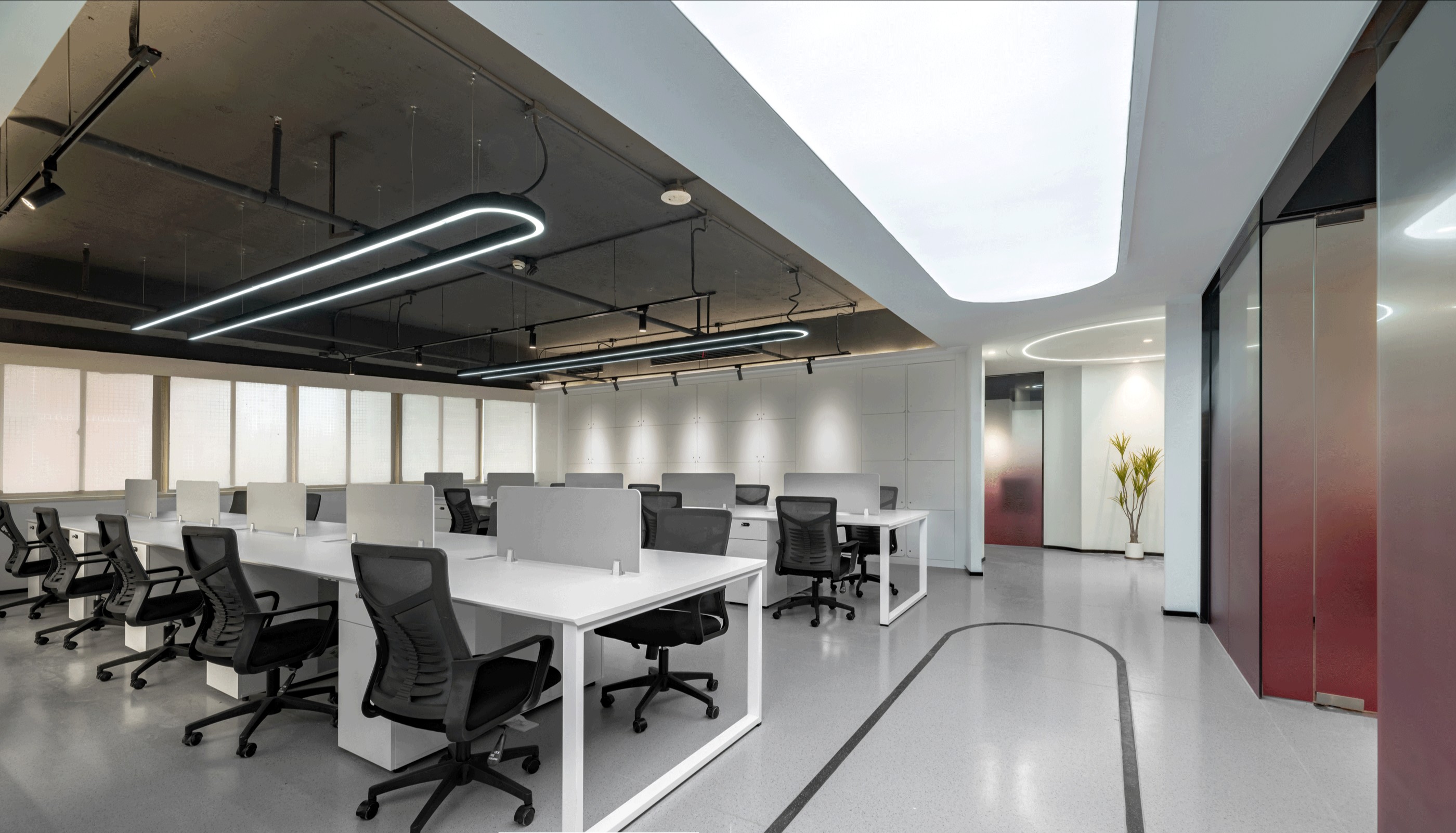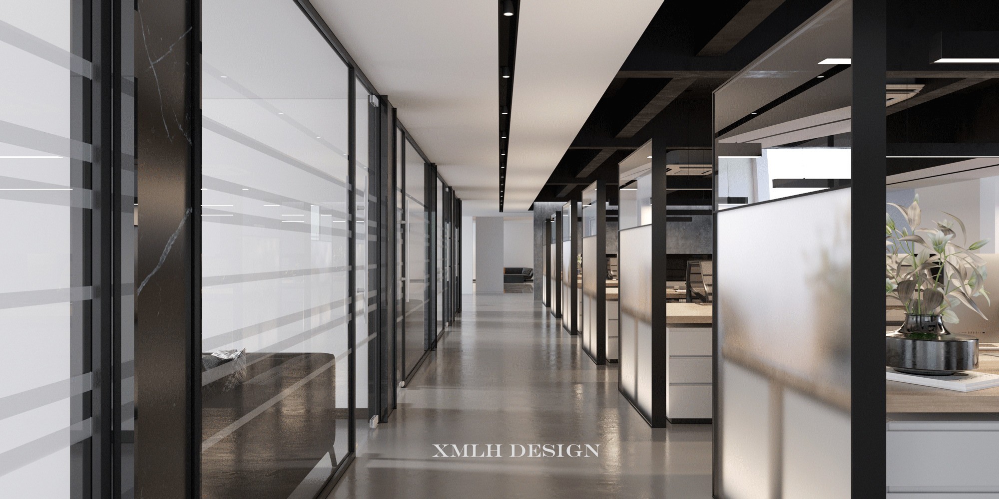 入口的细节,一进门的科技感,全景式交互让人瞬间沉浸其中,光以曲线的形式在天花游动。联结起空间的关系,同时运用弧形玻璃打造洽谈室,仿佛如遨游太空的船舱,提升空间的流动性和科技感。进门处的洽谈室和办公区的会议室均使用了渐变玻璃,颜色由紫红色向透明过渡,呼应罗丽芬LOGO。 开放办公区以自然感为主,给人以放松愉悦的办公环境,过道天花采用椭圆形透光膜照明,灯膜与地板的弧线相互呼应。来到多功能办公空间,办公IP以从事医美相关行业人群为主,开放的空间搭配轻巧的办公桌,可为后续培训或是聚会做出改变,空间元素上采用裸粉色加上具有女性代表的弧度,让空间更具柔美感。