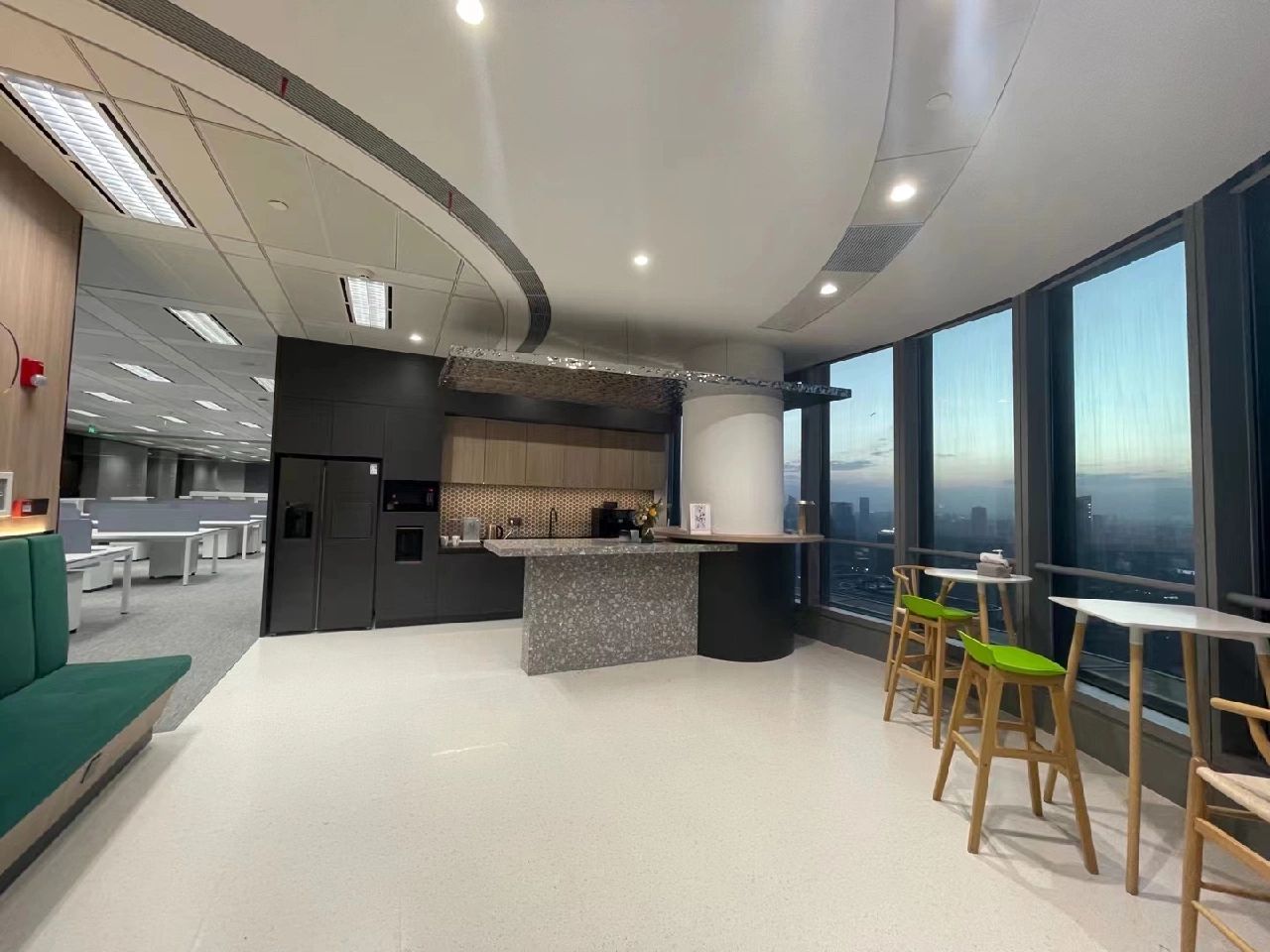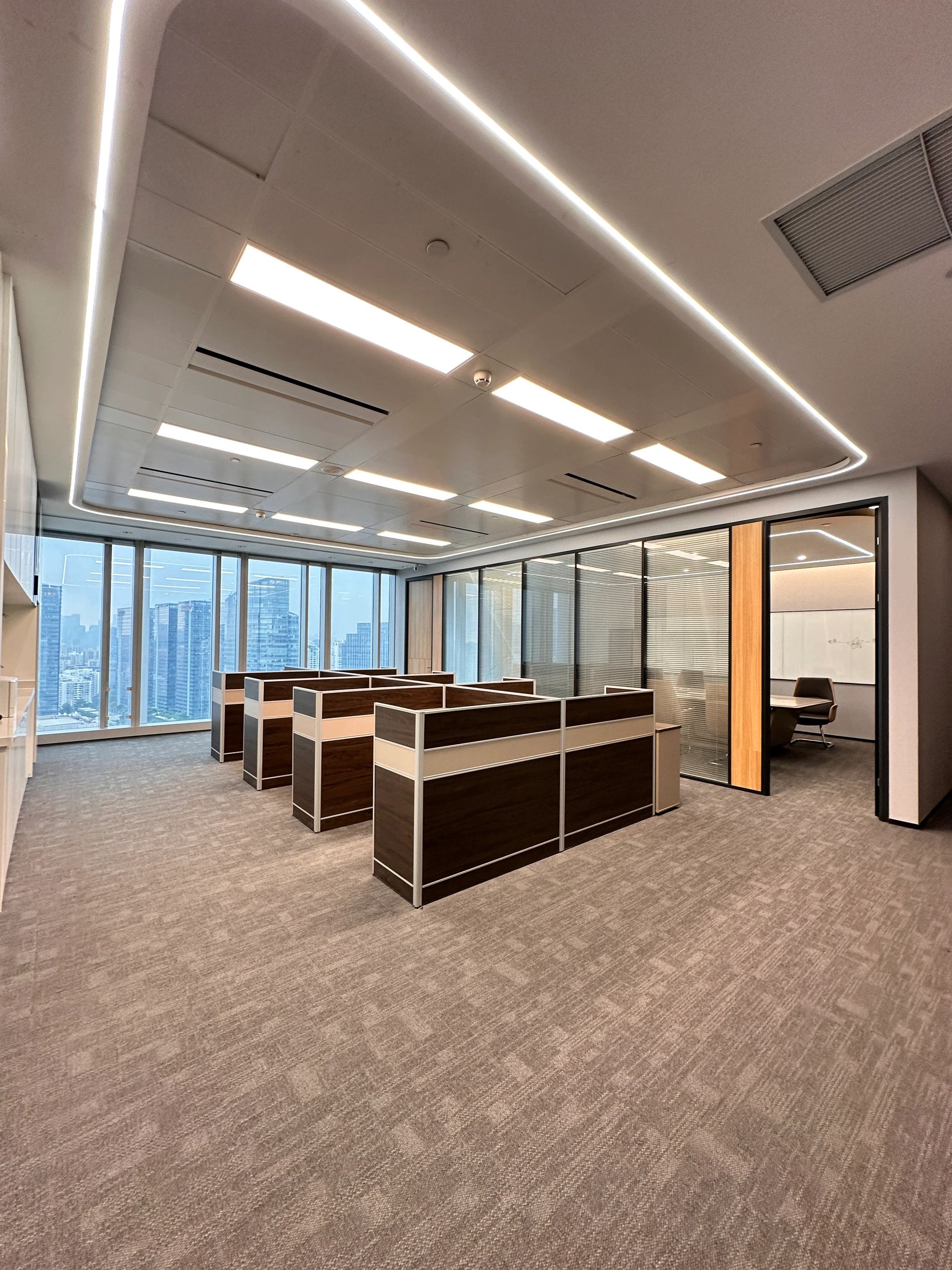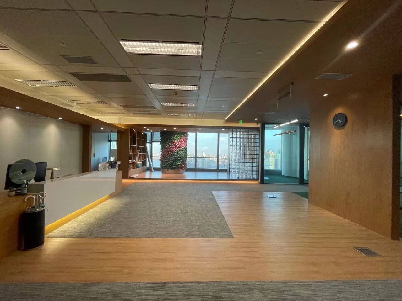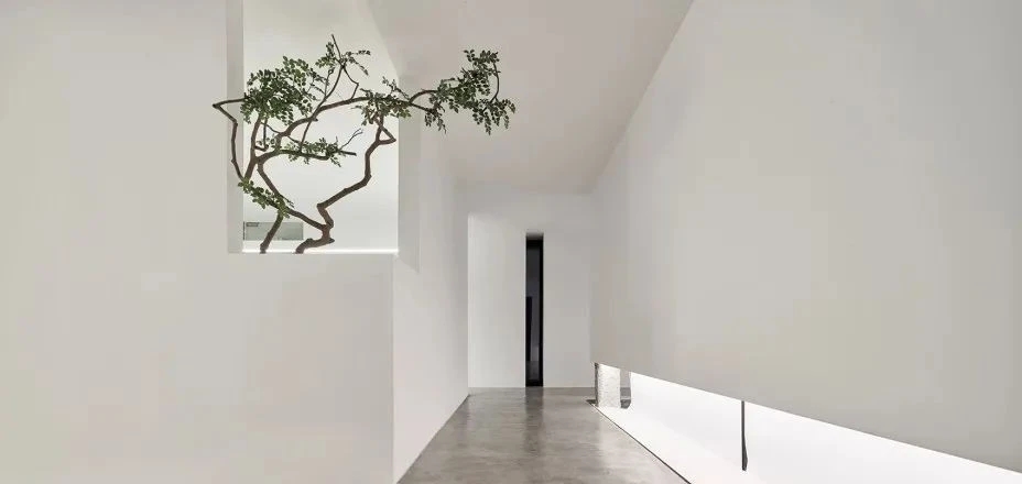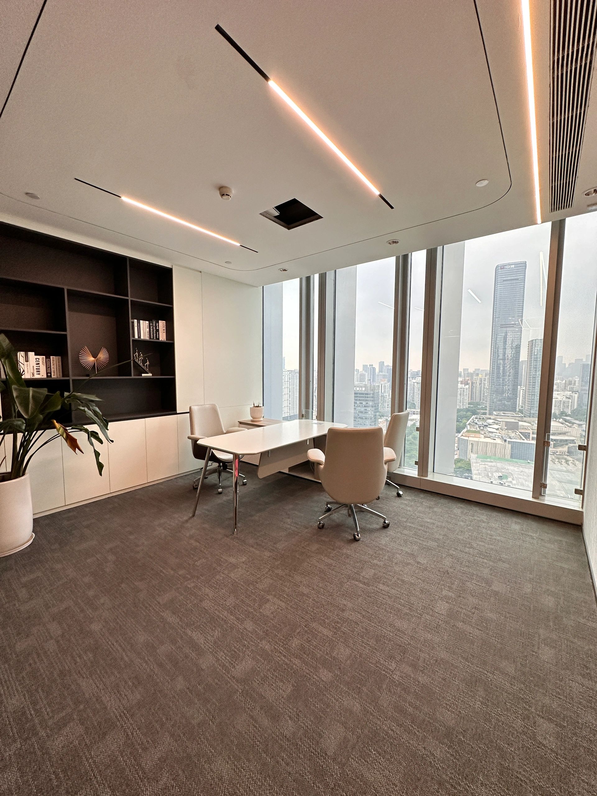 入口的细节,一进门的科技感,全景式交互让人瞬间沉浸其中,光以曲线的形式在天花游动。联结起空间的关系,同时运用弧形玻璃打造洽谈室,仿佛如遨游太空的船舱,提升空间的流动性和科技感。进门处的洽谈室和办公区的会议室均使用了渐变玻璃,颜色由紫红色向透明过渡,呼应罗丽芬LOGO。 开放办公区以自然感为主,给人以放松愉悦的办公环境,过道天花采用椭圆形透光膜照明,灯膜与地板的弧线相互呼应。来到多功能办公空间,办公IP以从事医美相关行业人群为主,开放的空间搭配轻巧的办公桌,可为后续培训或是聚会做出改变,空间元素上采用裸粉色加上具有女性代表的弧度,让空间更具柔美感。