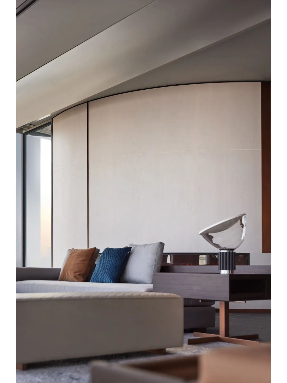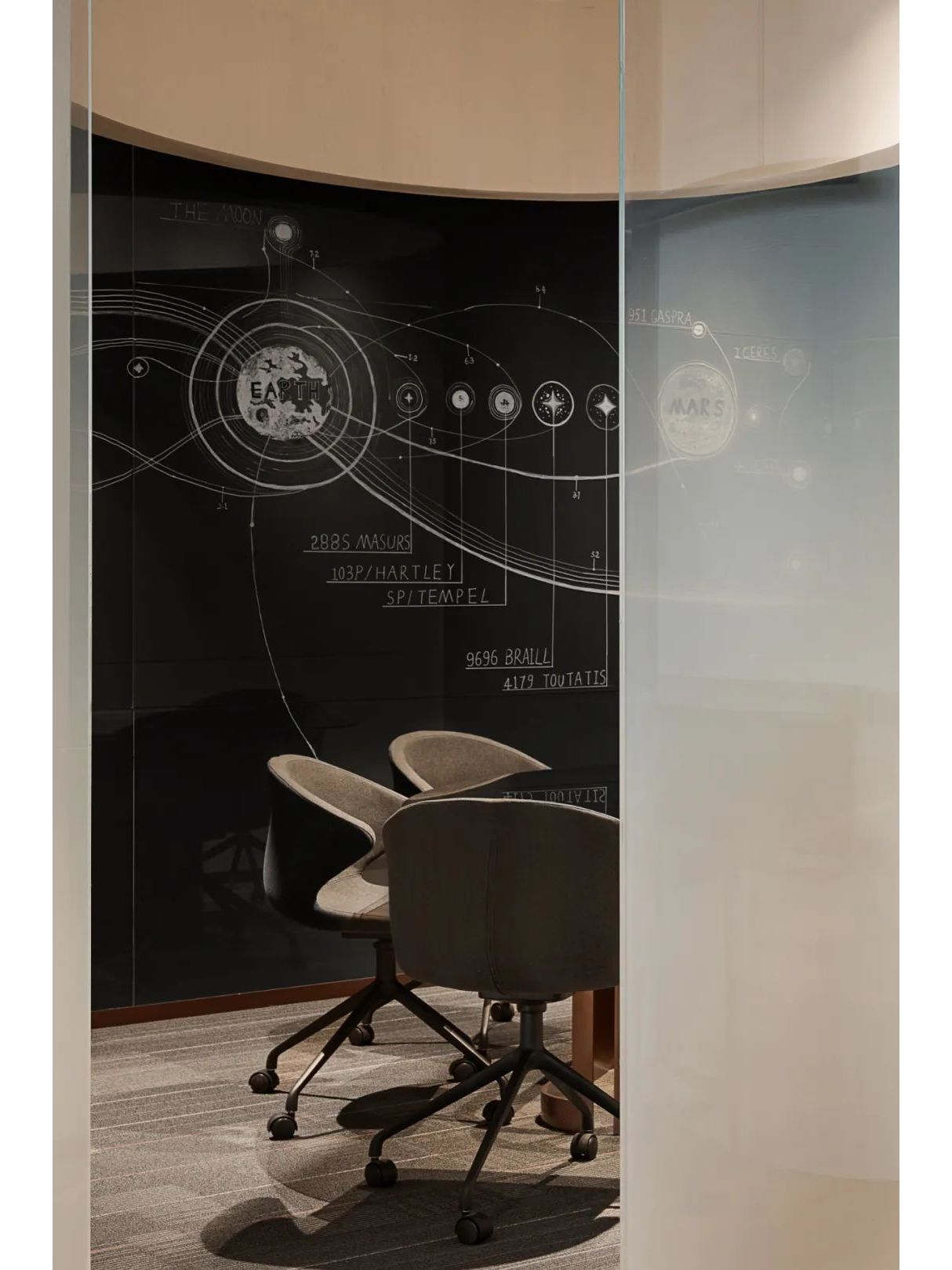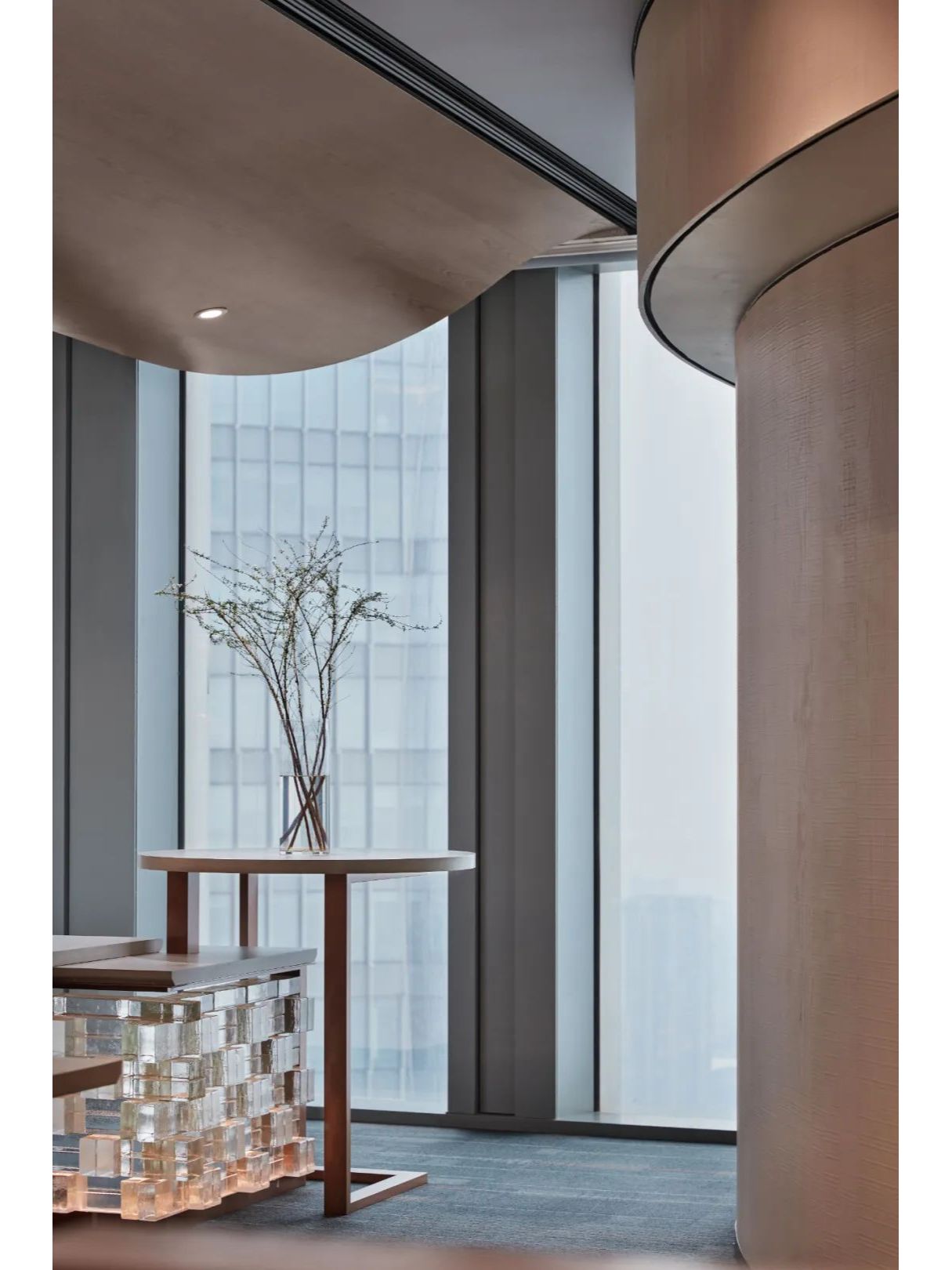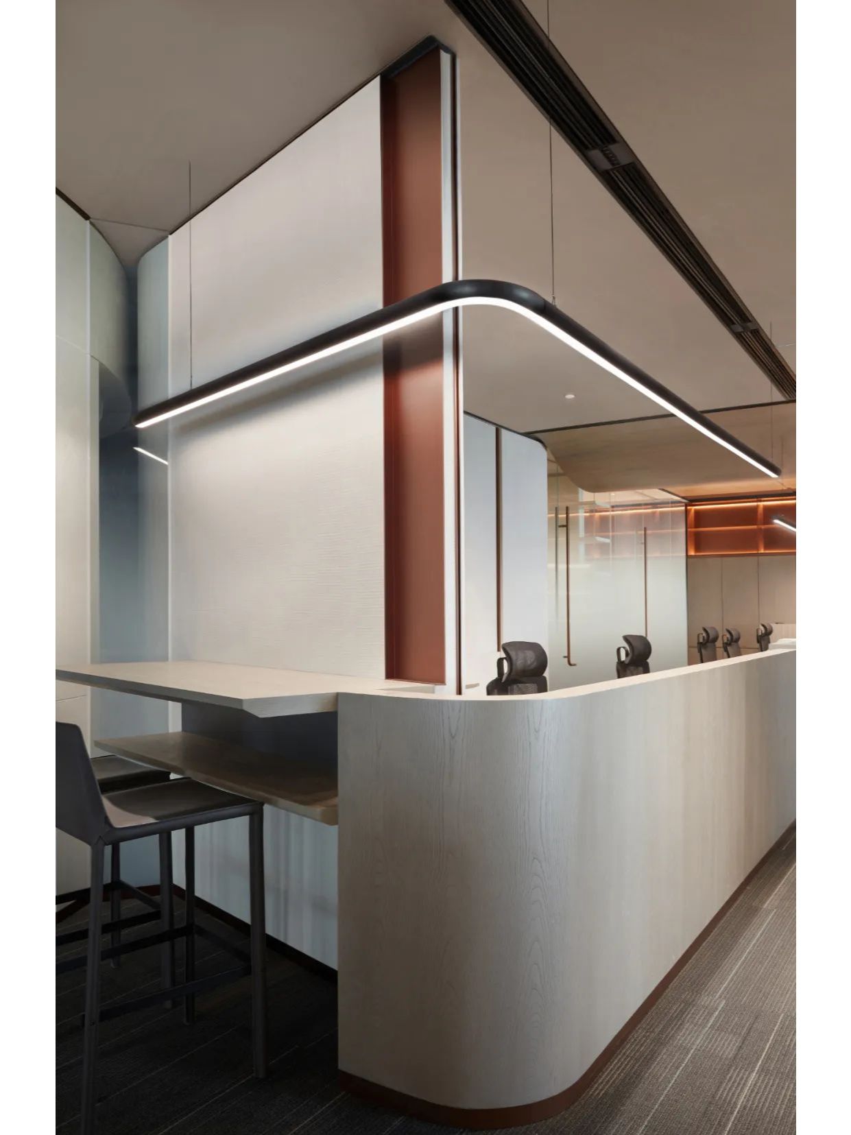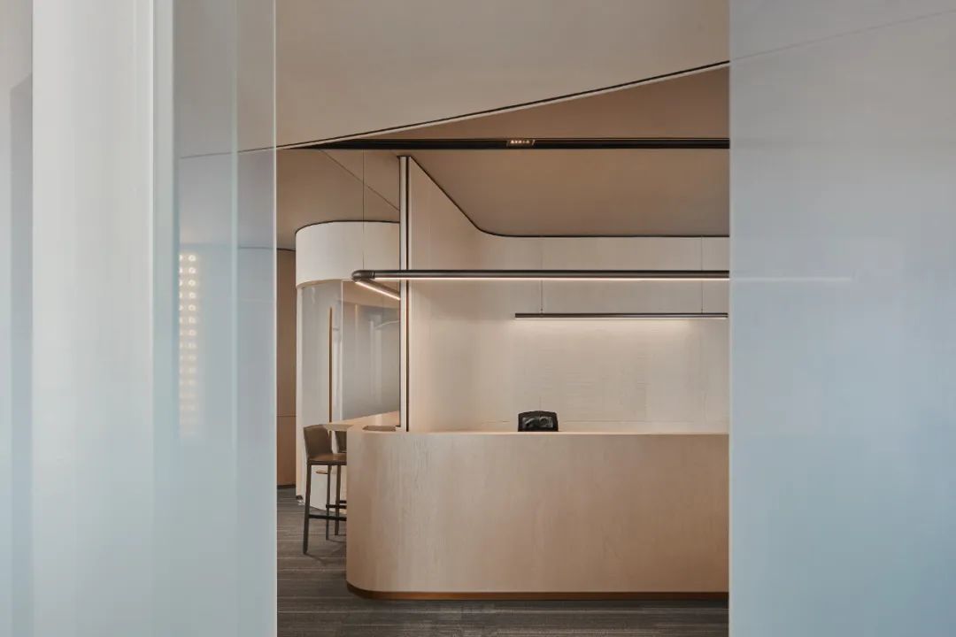 空间充斥着弧形,设计师将重要枢纽设计为一个圆柱空间,即独立又与整体机构融为一体,成为一个动线枢纽,一个视觉焦点。