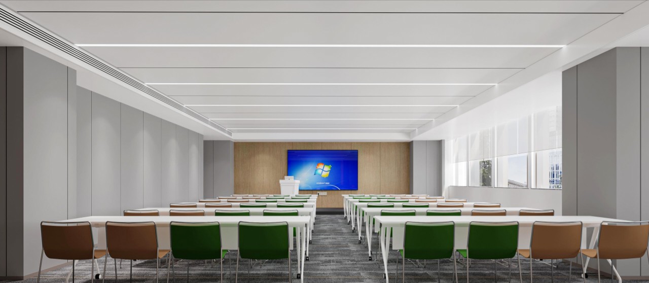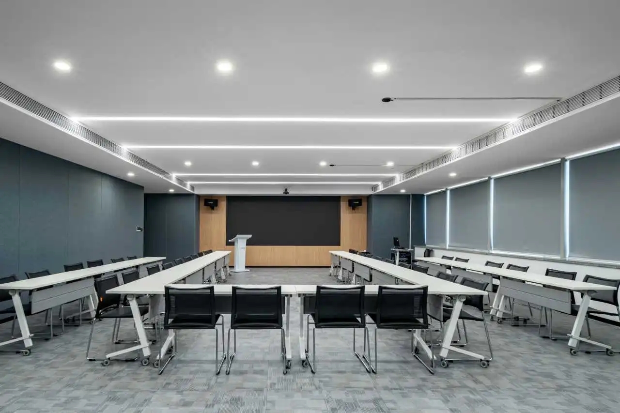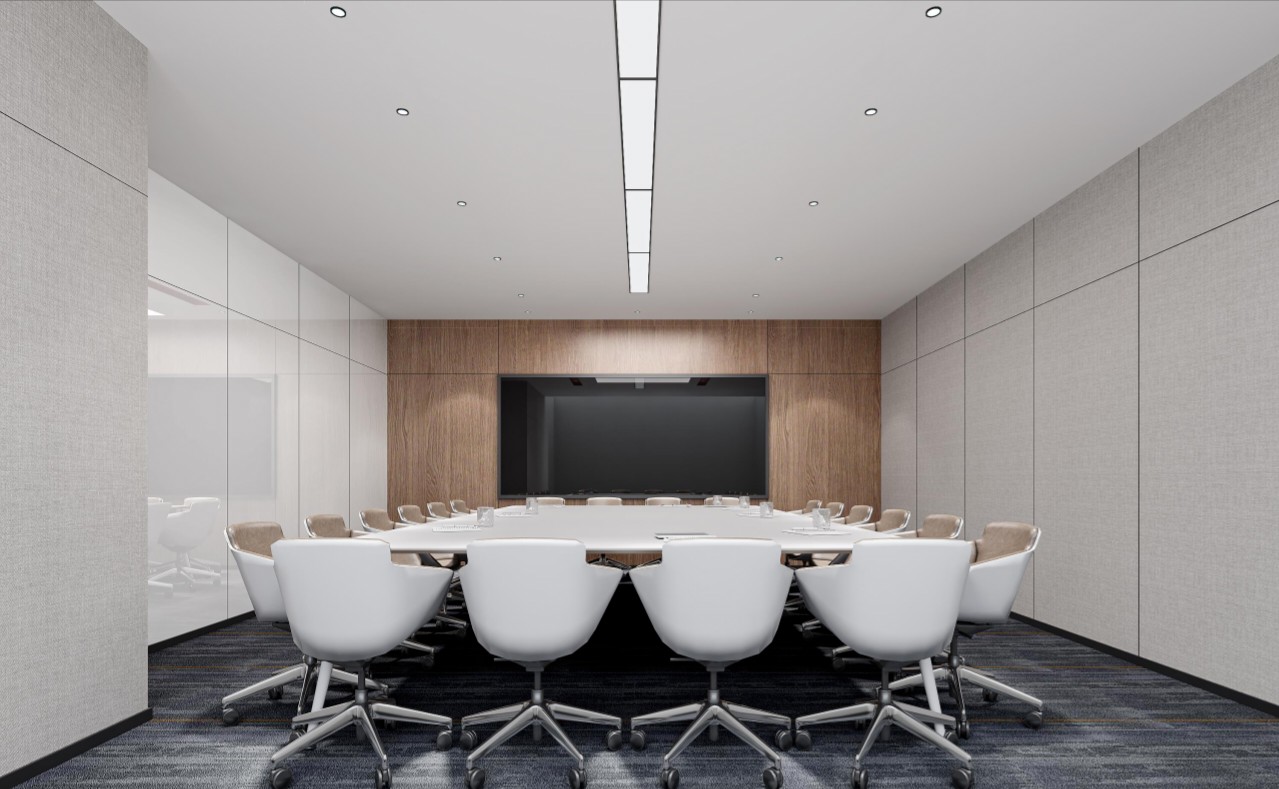 会议室保留办公区的风格设计,没有被框起的限制,重置了办公空间的距离感,实现了各功能区的融合延展,在规整有序的排列之中,可以看见的是人与人的高效交流合作。