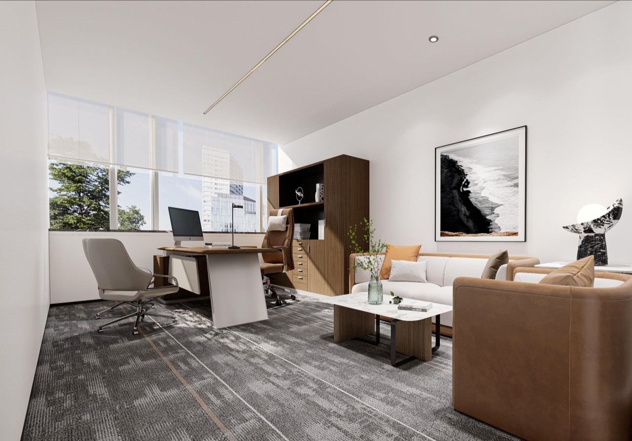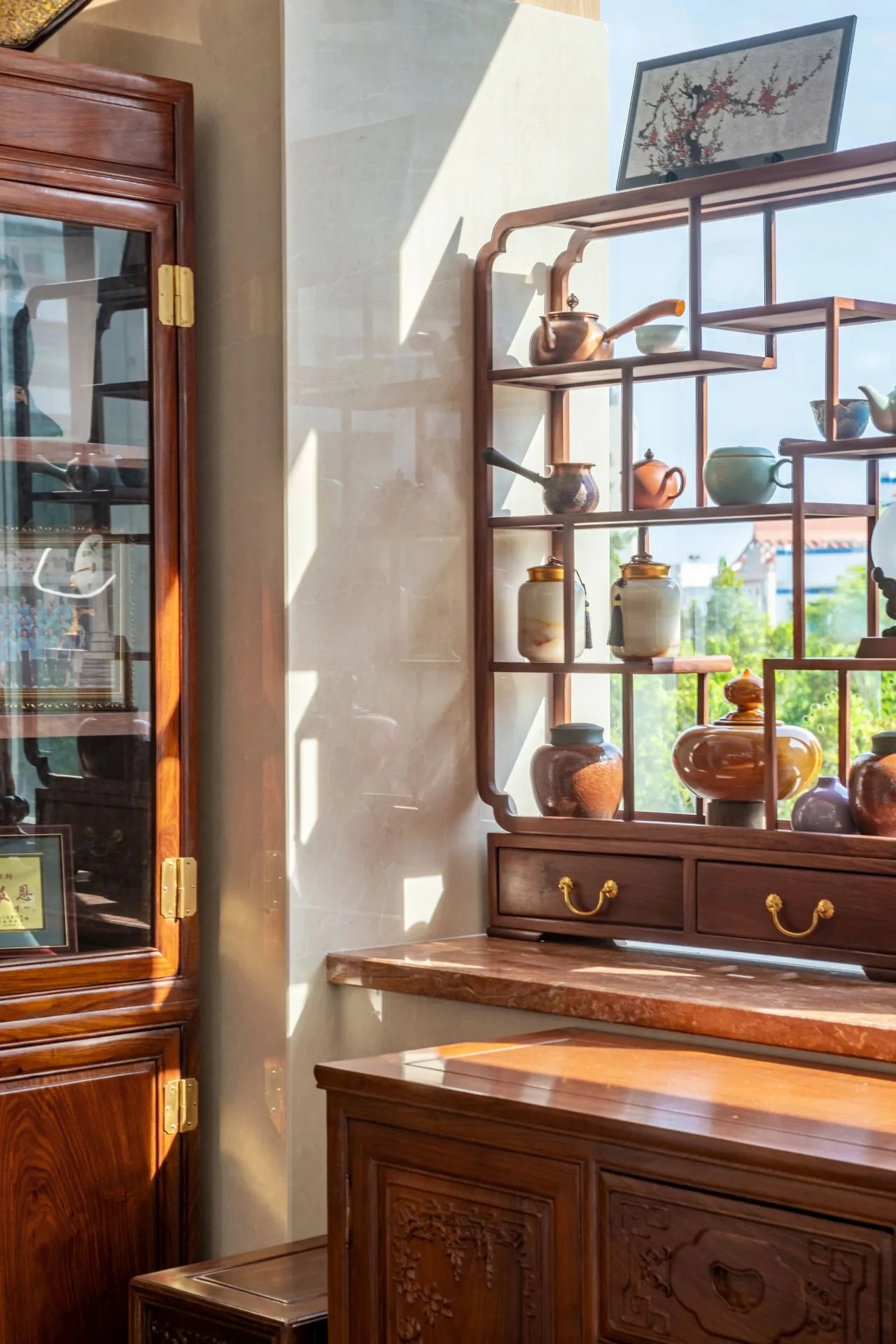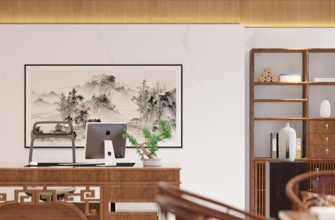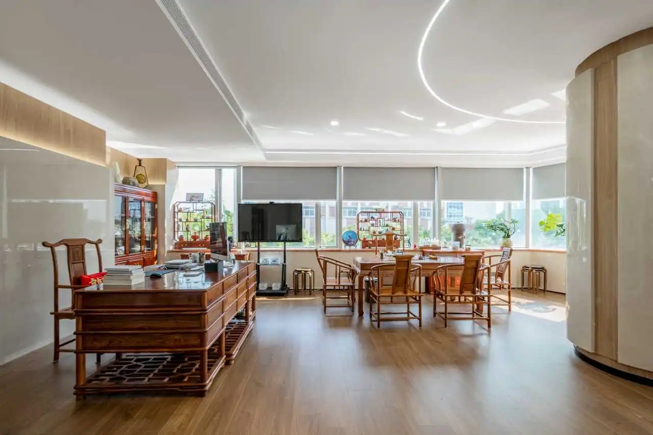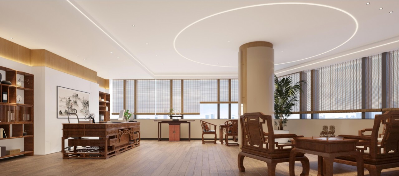 董事长办公室,结合客户需求打造中式风,中式复古调性中蕴含商务的沉稳气息,没有太多造作的修饰与约束,温润木材与气质石材的融合其中,平和内敛的空间情绪随之流淌。