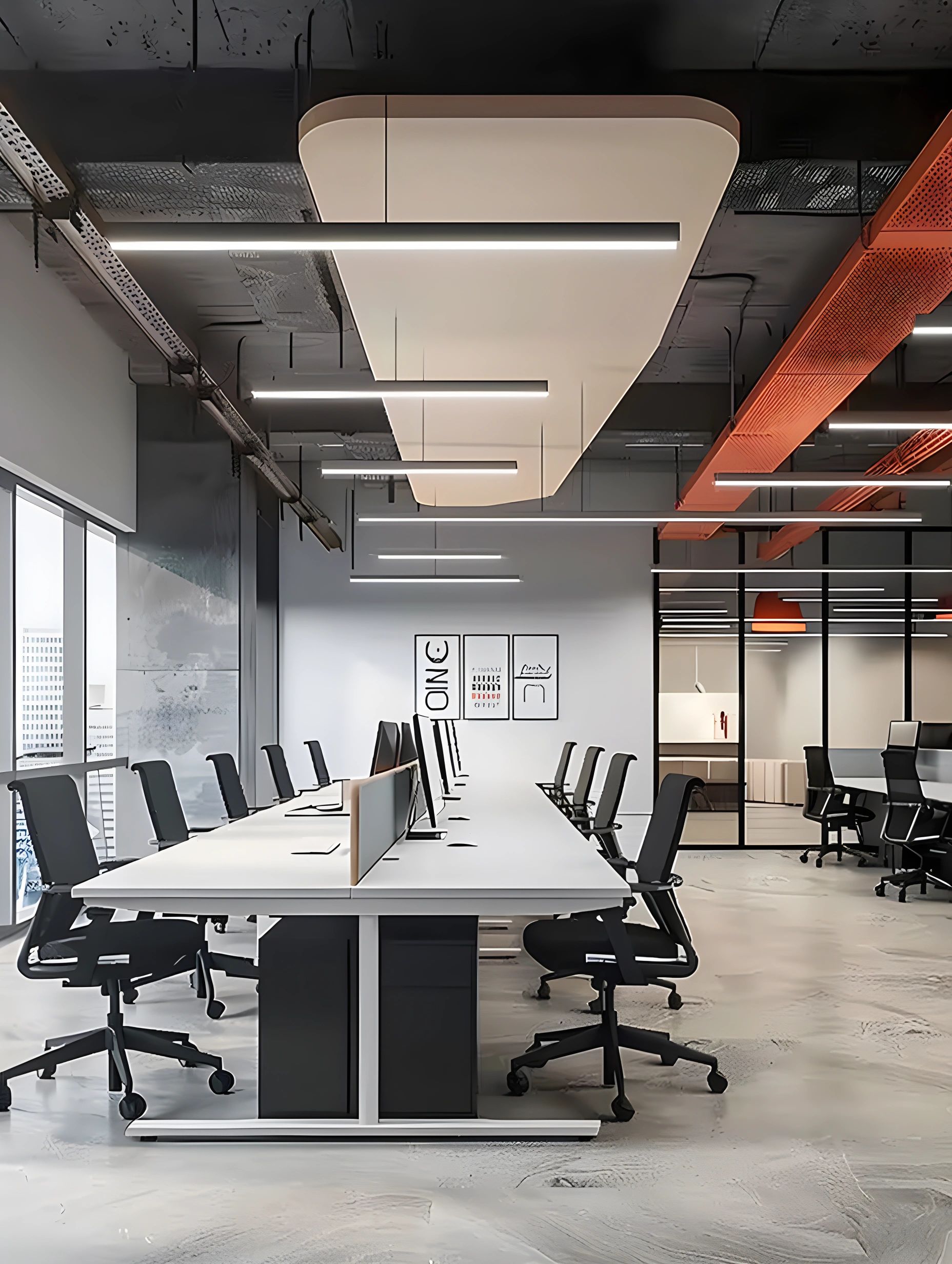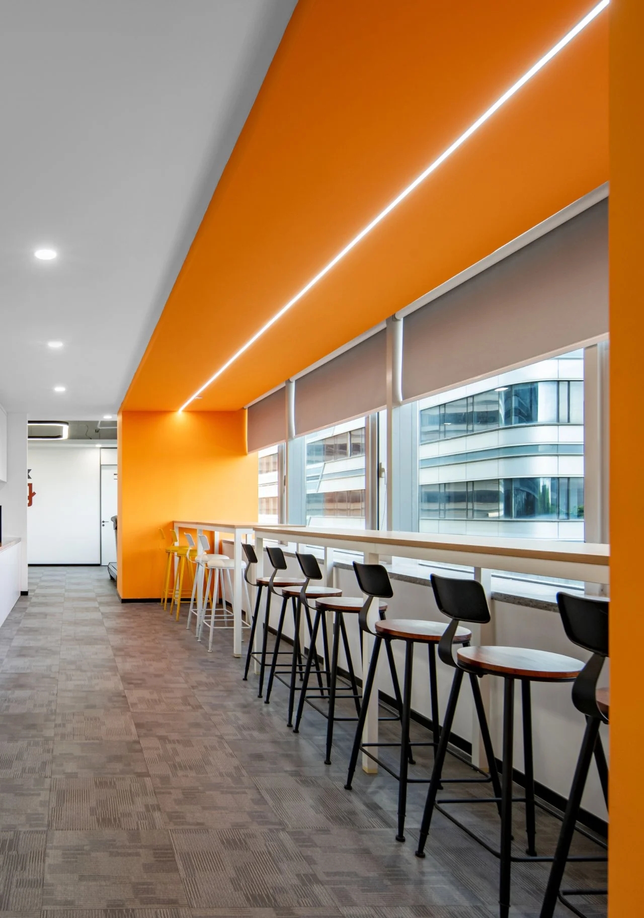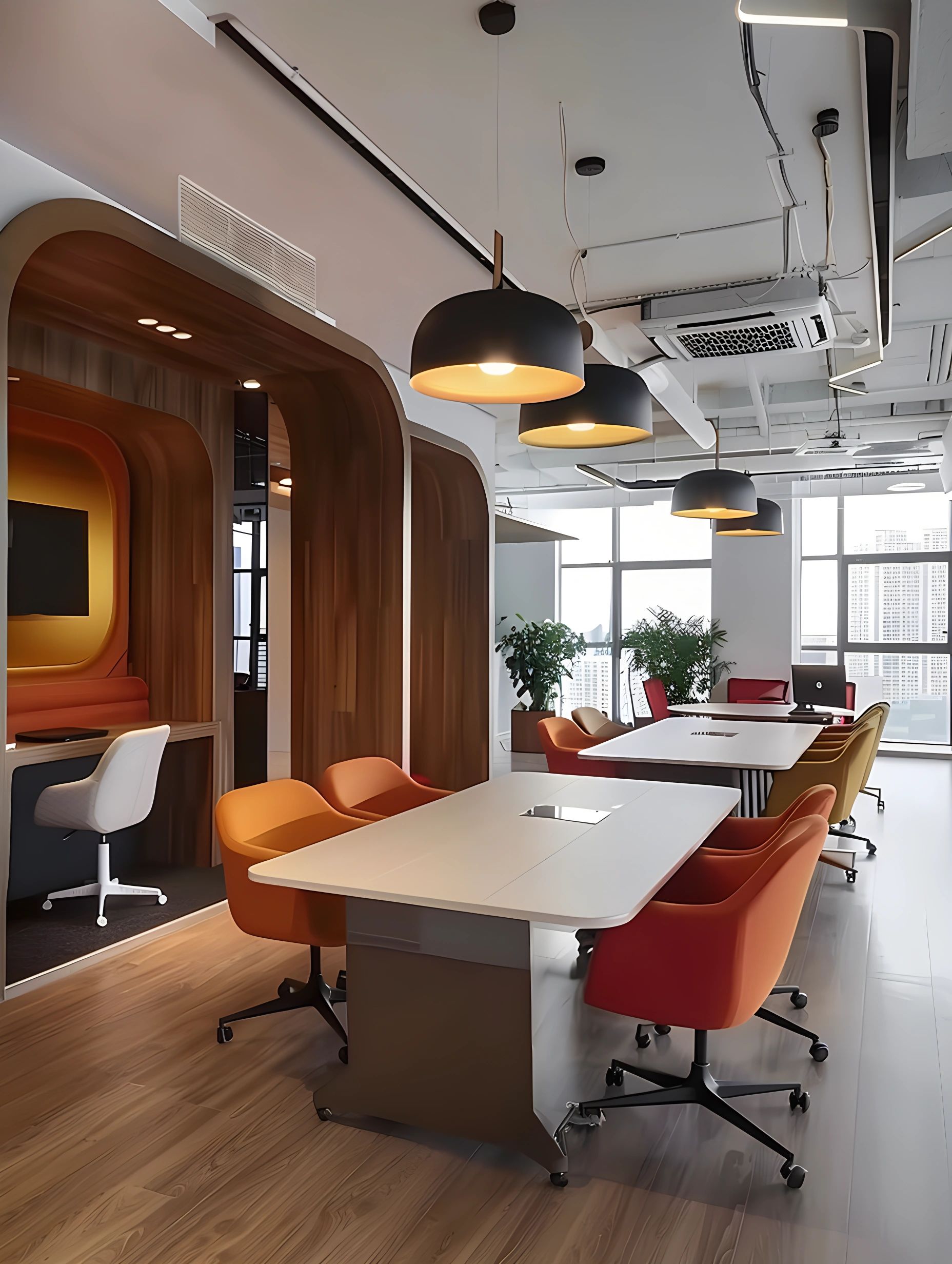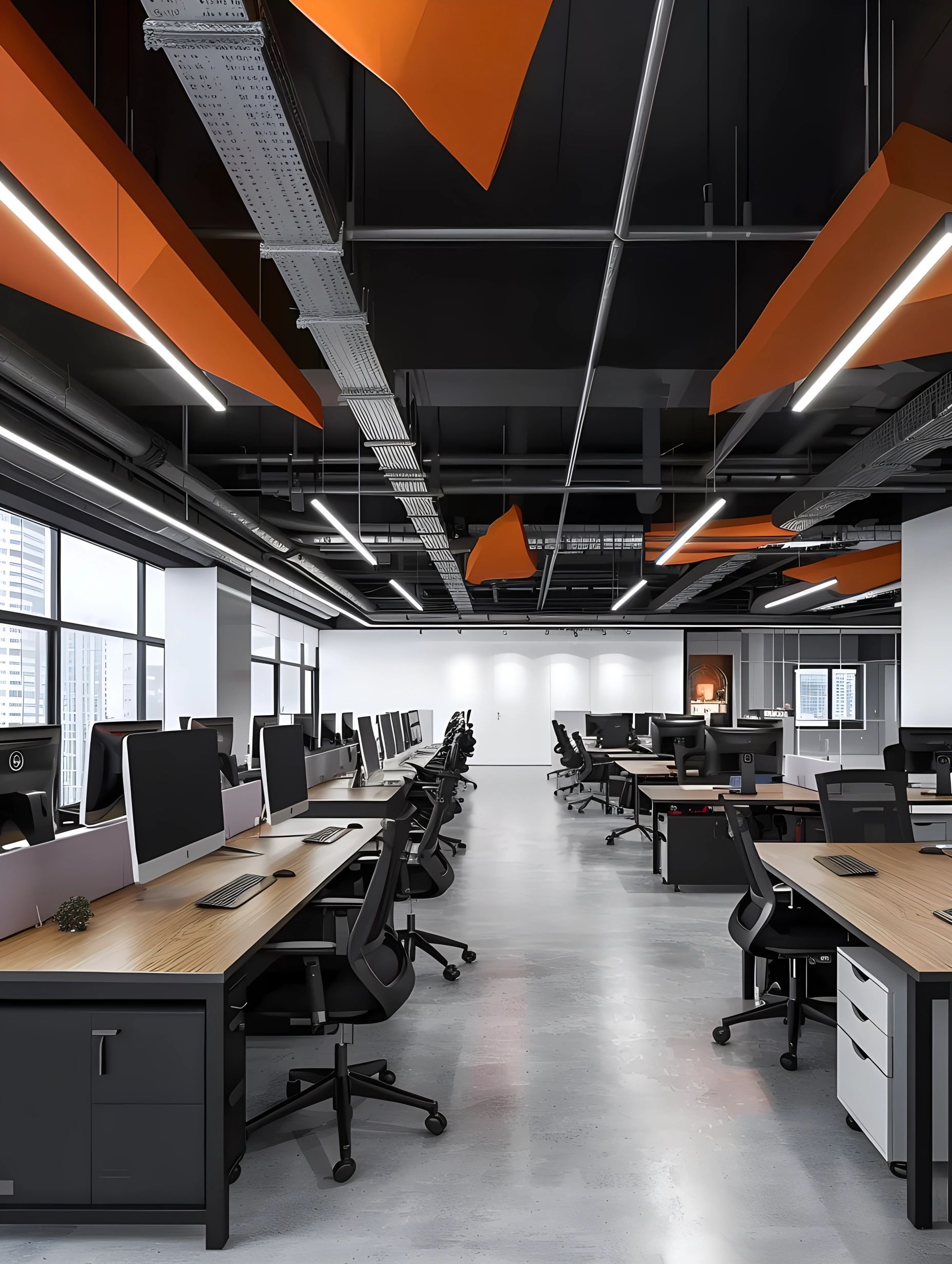 办公空间内以开放式的设计,强调人与人之间的交流合作,鼓励没有界限感的思想碰撞。白灰木的空间之中,橙色跃入眼前,加深企业形象。