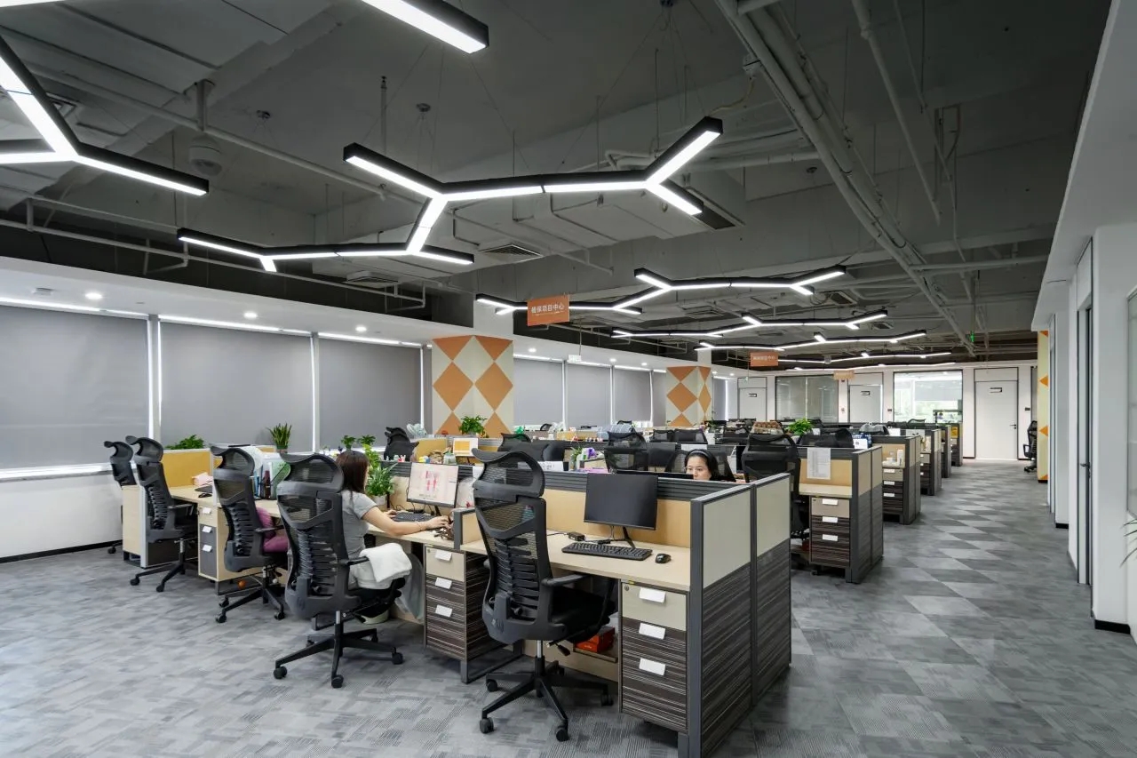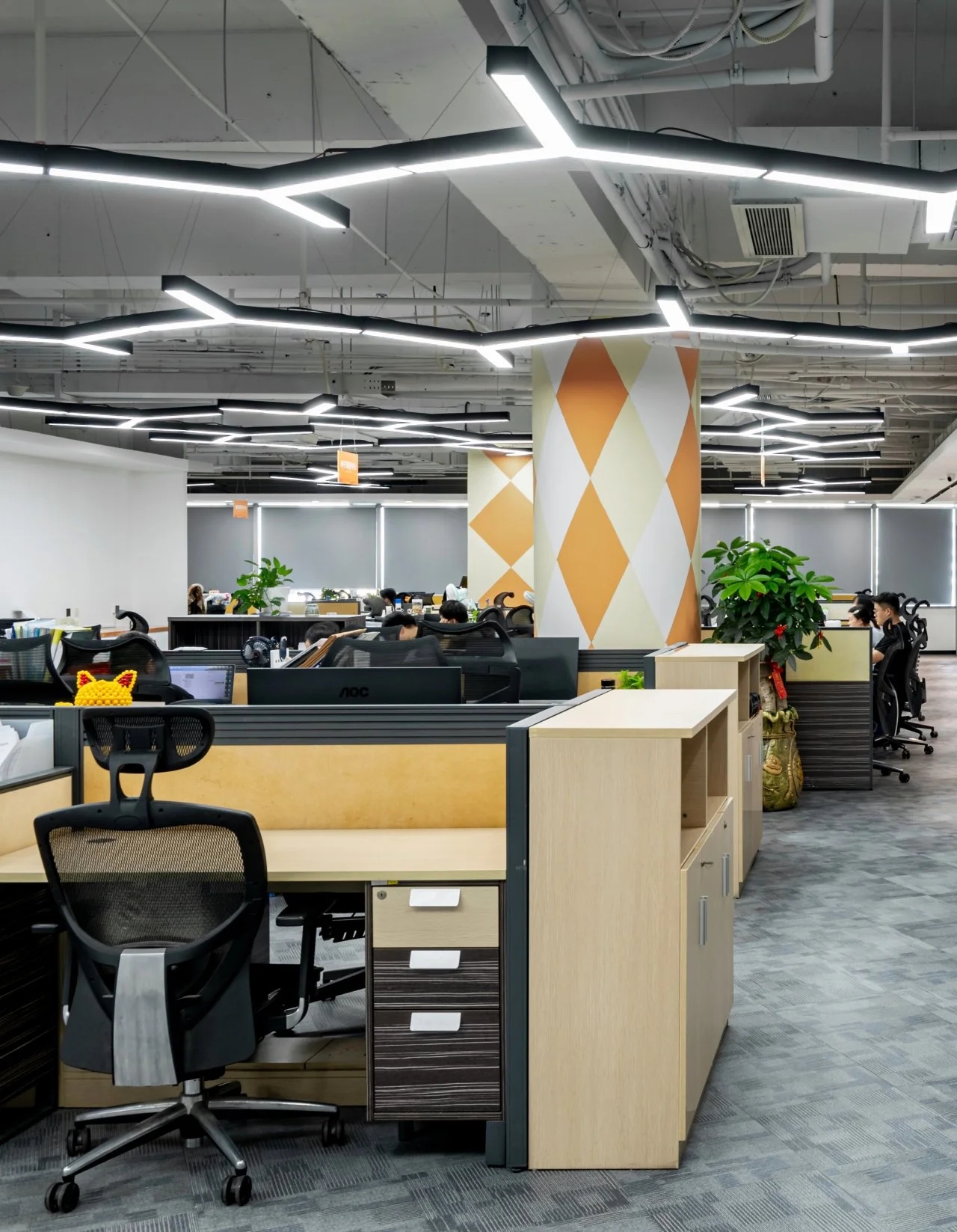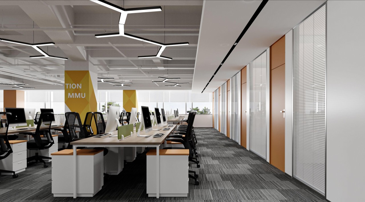 办公空间内以开放式的设计,强调人与人之间的交流合作,鼓励没有界限感的思想碰撞。白灰木的空间之中,橙色跃入眼前,加深企业形象。