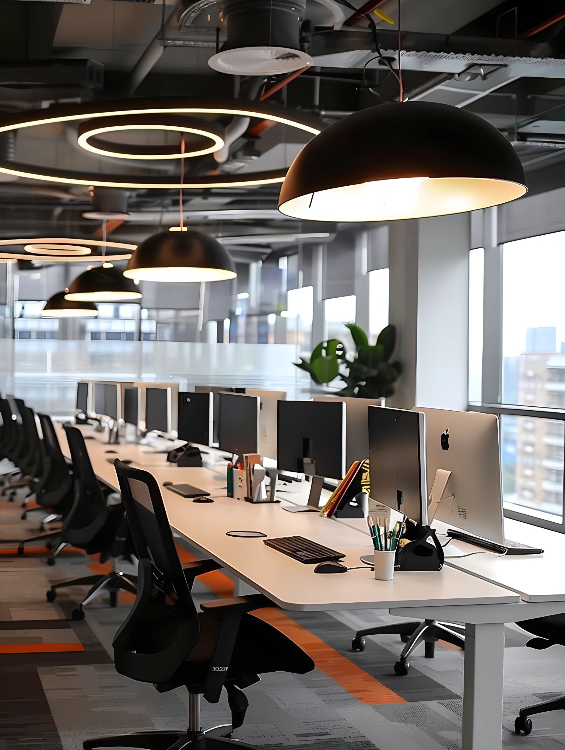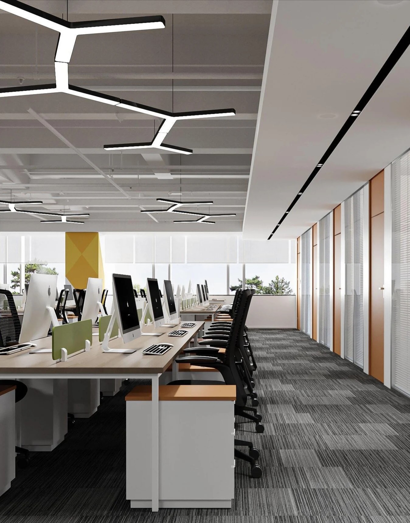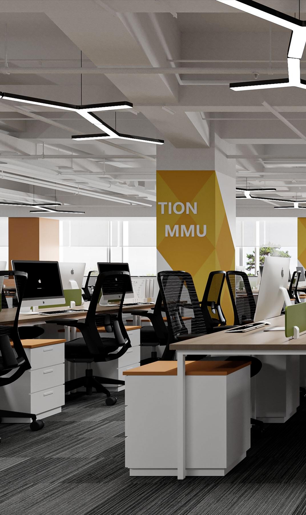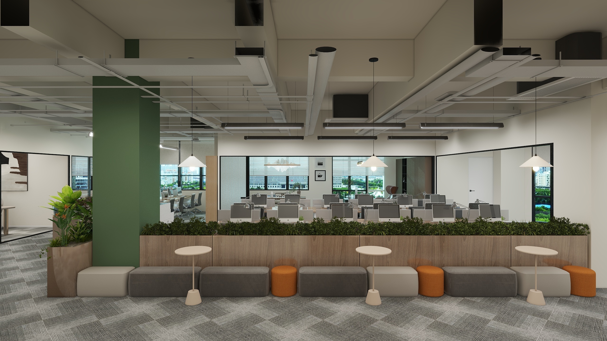 办公空间内以开放式的设计,强调人与人之间的交流合作,鼓励没有界限感的思想碰撞。白灰木的空间之中,橙色跃入眼前,加深企业形象。