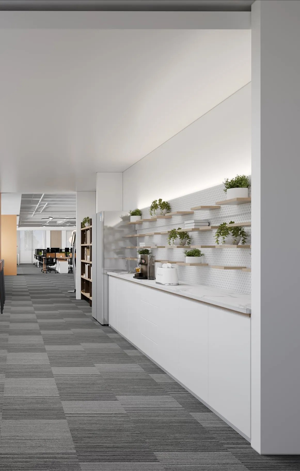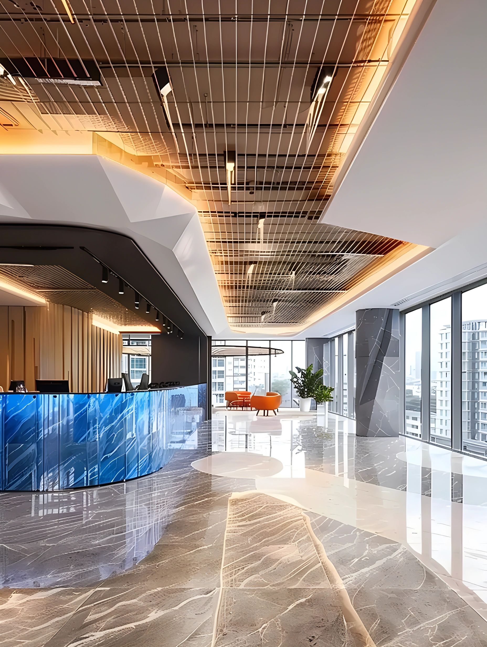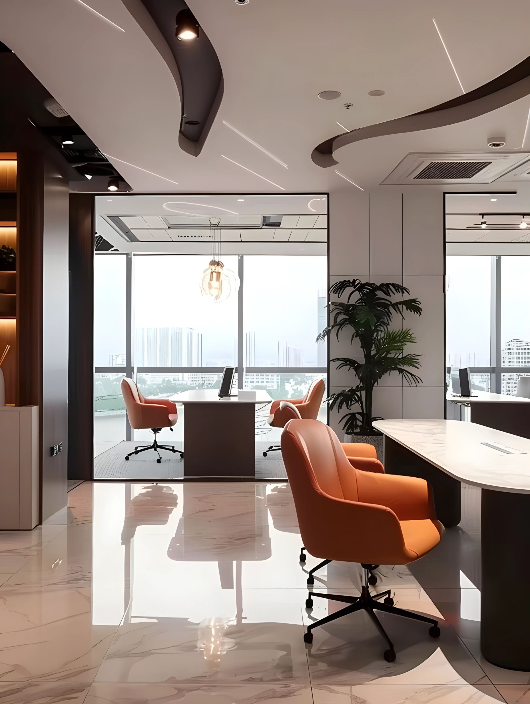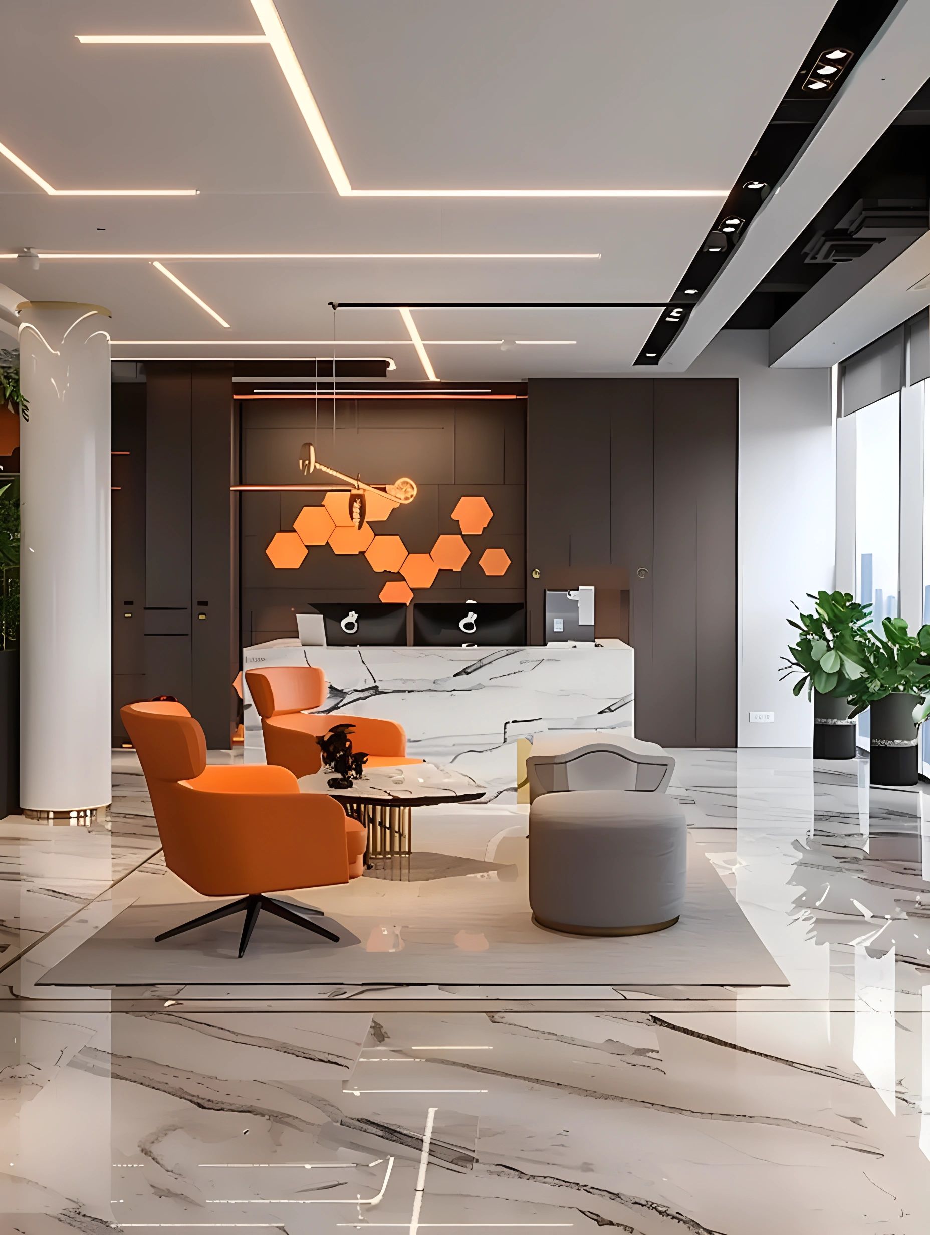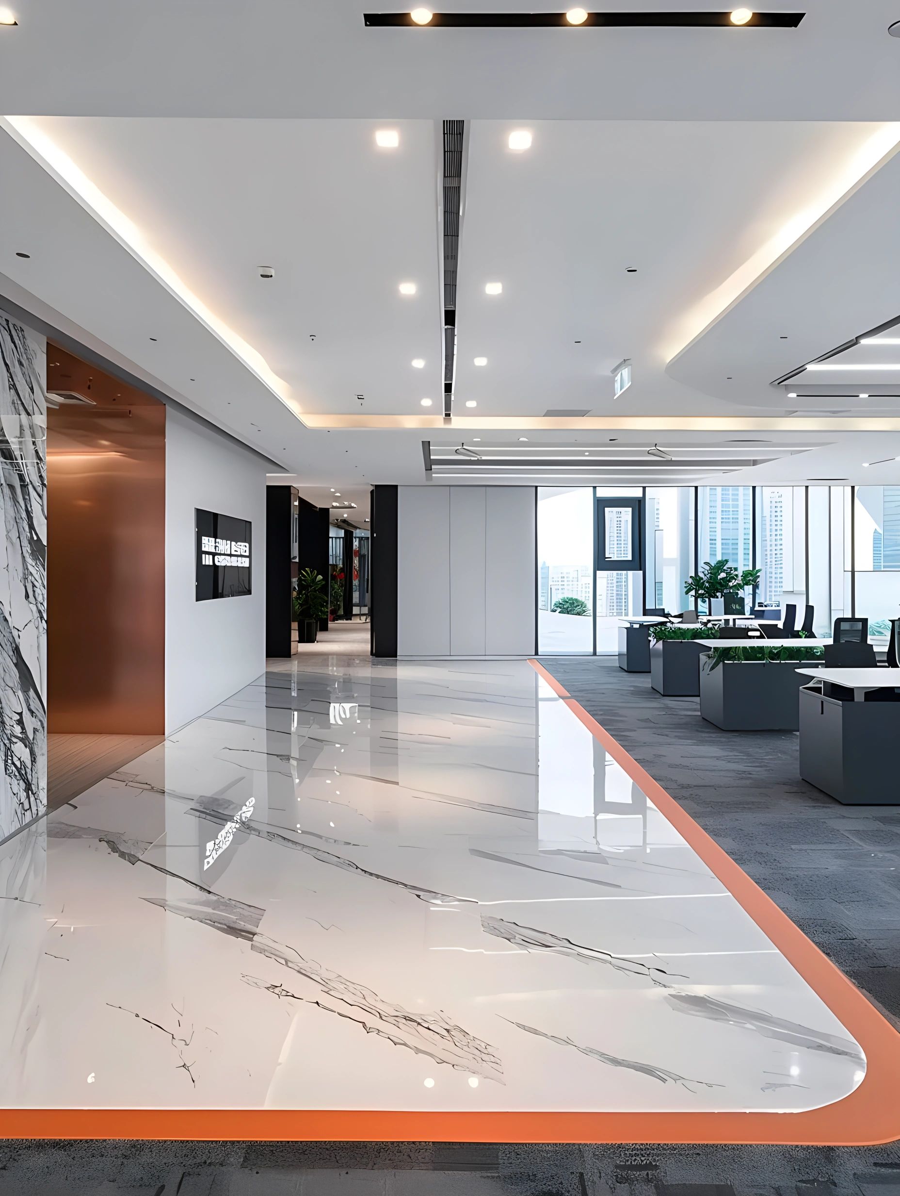 步入公司,一抹橙色掀开新篇章,跟随着光影的线条进行延展,空间借由形体、线条、材质的形式组合来表现,以“面向未来,百年生长”的姿态,散发流动的生命气息。整个空间柔和纯净,轻盈而明亮,沉稳的灰白,平和而舒适,共同打造现代商务感空间。同时,缀入明亮的品牌橙色,打破了空间的平静,营造温暖、积极的氛围。