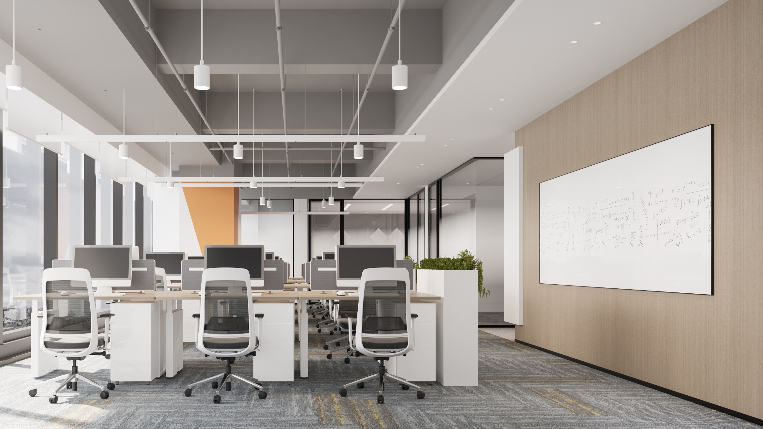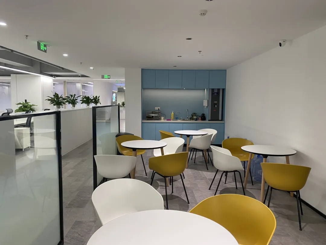 开放式布局增进流动和连通感。会议室位于幕墙旁边,开放式咖啡吧及材料室位于正中央。不同高度的体量加强了空间的纵深感与延展性。开敞灵活的中央区域以超大的“月球”灯为中心,配备模块化家具,可进行多种灵活组装,而舒适的休闲区和壁龛则为团队协作提供了非正式的舒适空间。