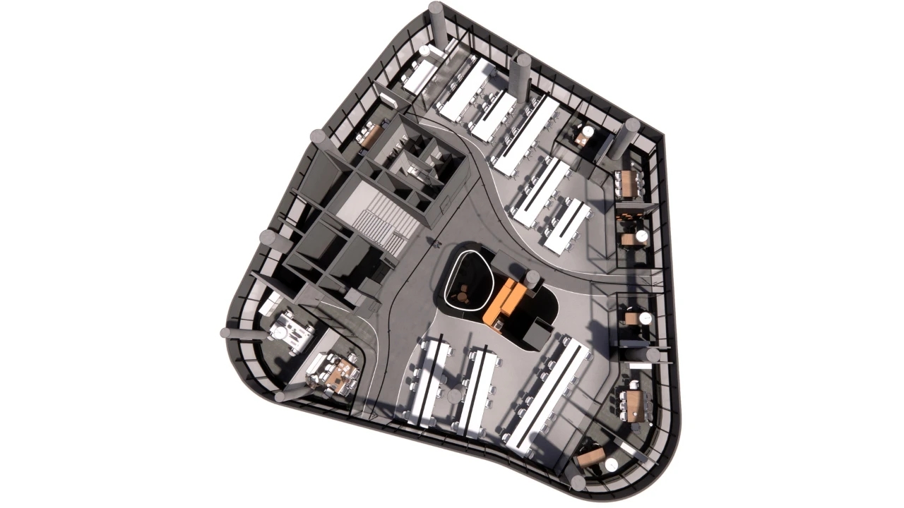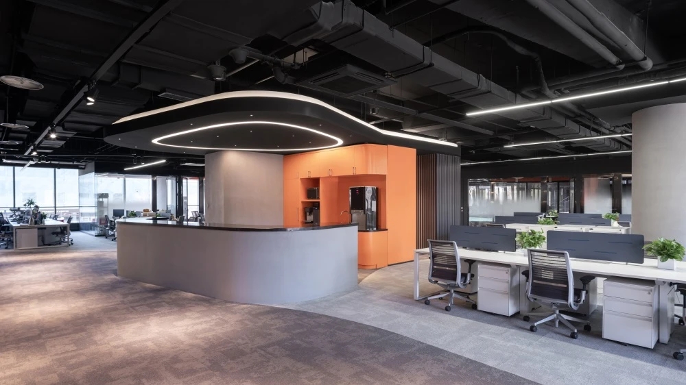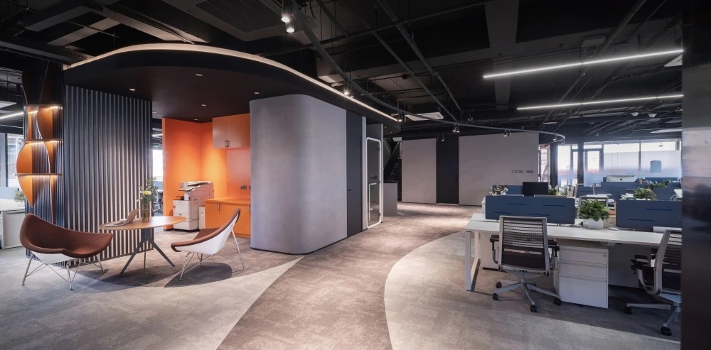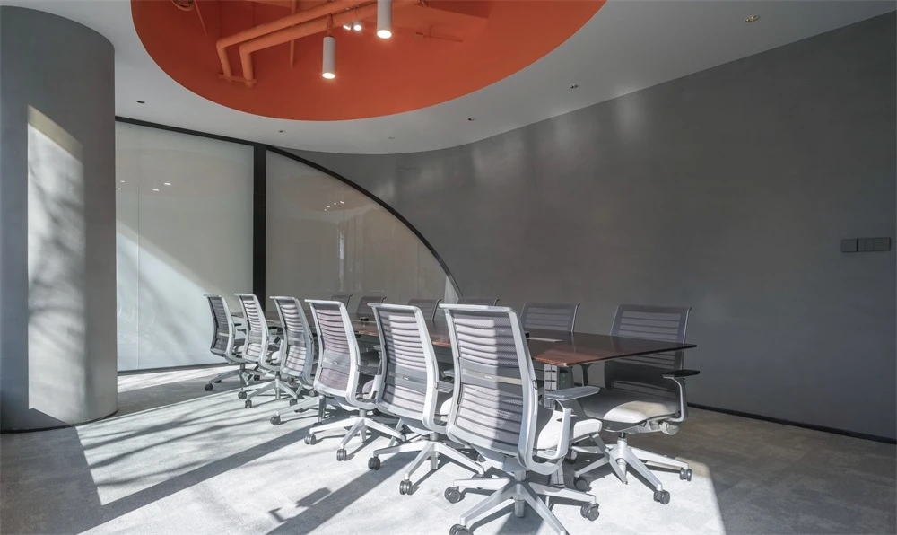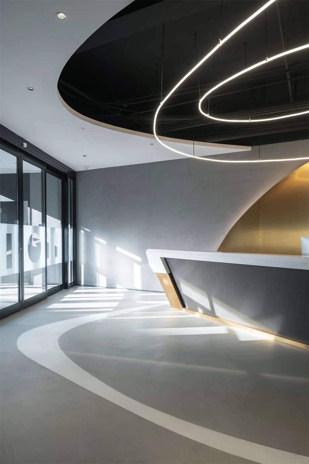 2F 作为整栋建筑中最主要的办公区域,我们希望设计可以打破固有刻板的办公空间印象,运用非线性的顶面与地面取代实体分割元素对空间进行区分。空间整体色调以黑灰色系为主,中部为开敞办公区,相对独立的办公室、会议室则被布置在采光较好的建筑沿线侧。