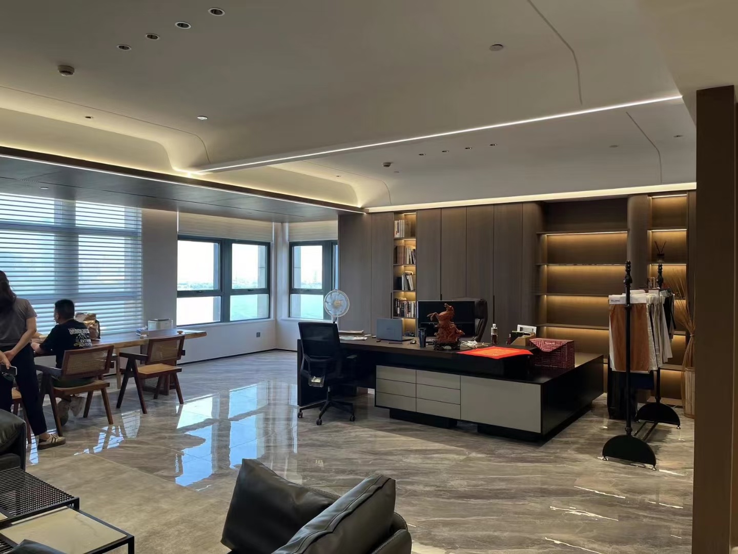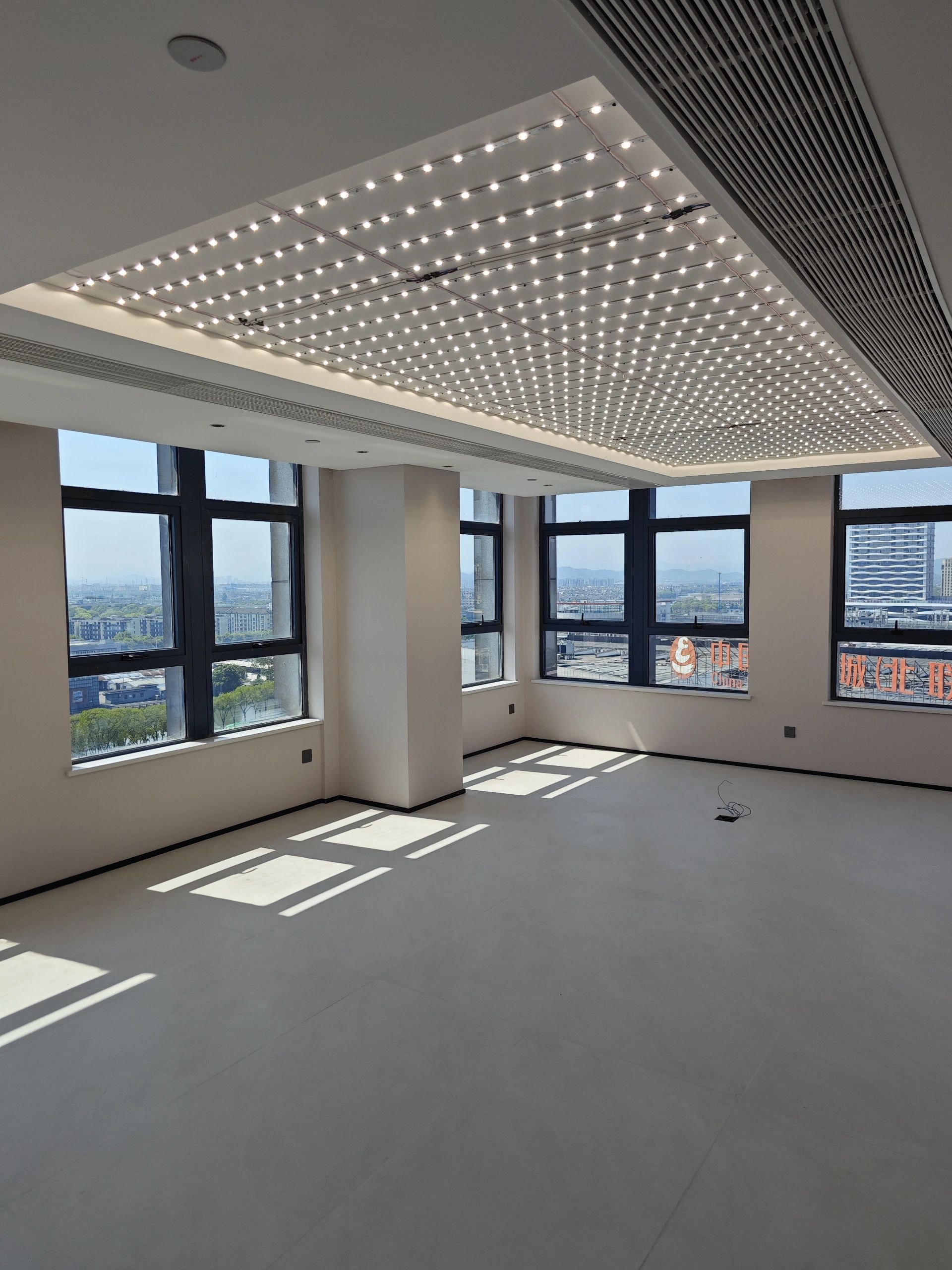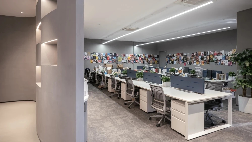 2F 作为整栋建筑中最主要的办公区域,我们希望设计可以打破固有刻板的办公空间印象,运用非线性的顶面与地面取代实体分割元素对空间进行区分。空间整体色调以黑灰色系为主,中部为开敞办公区,相对独立的办公室、会议室则被布置在采光较好的建筑沿线侧。