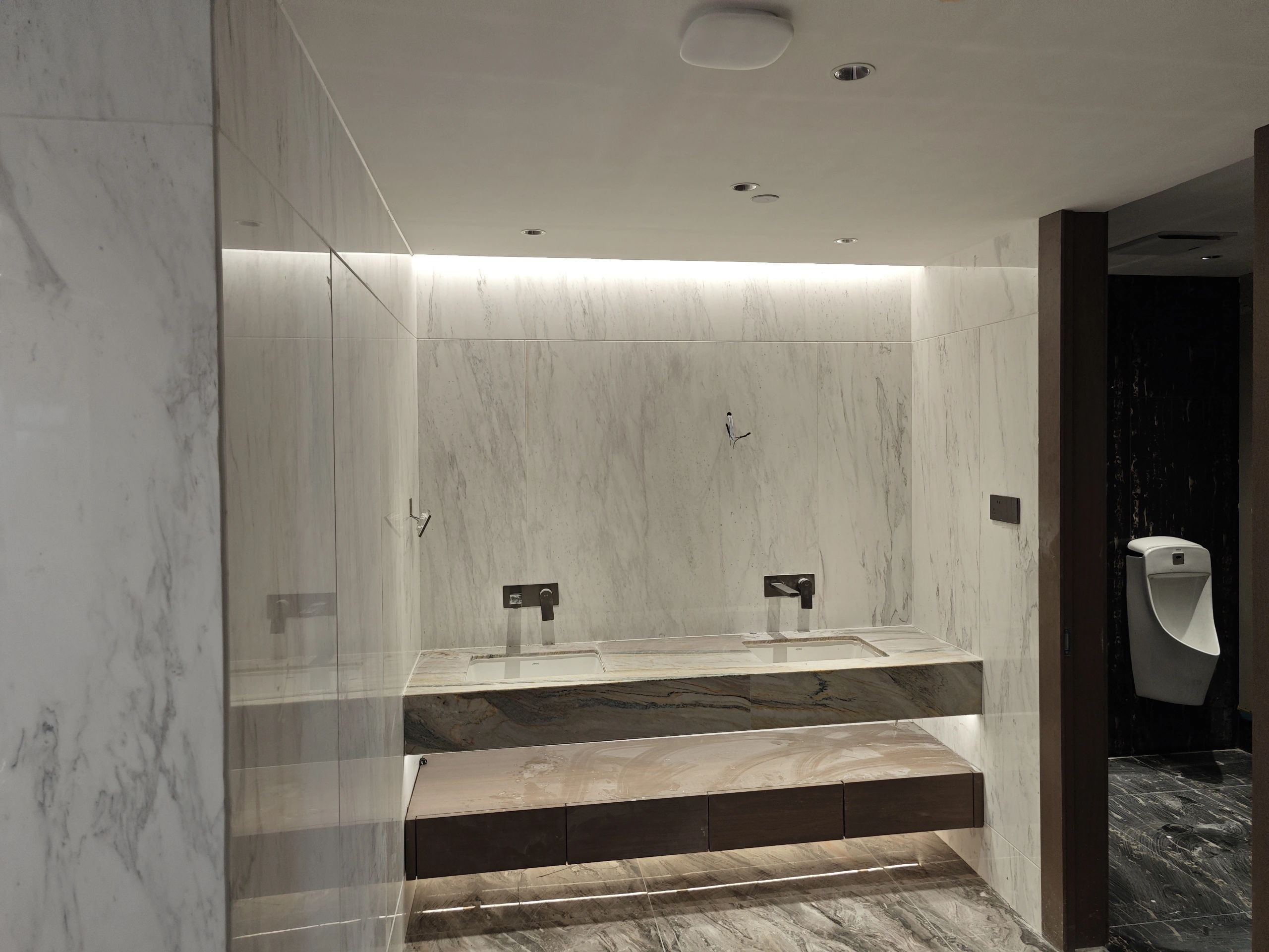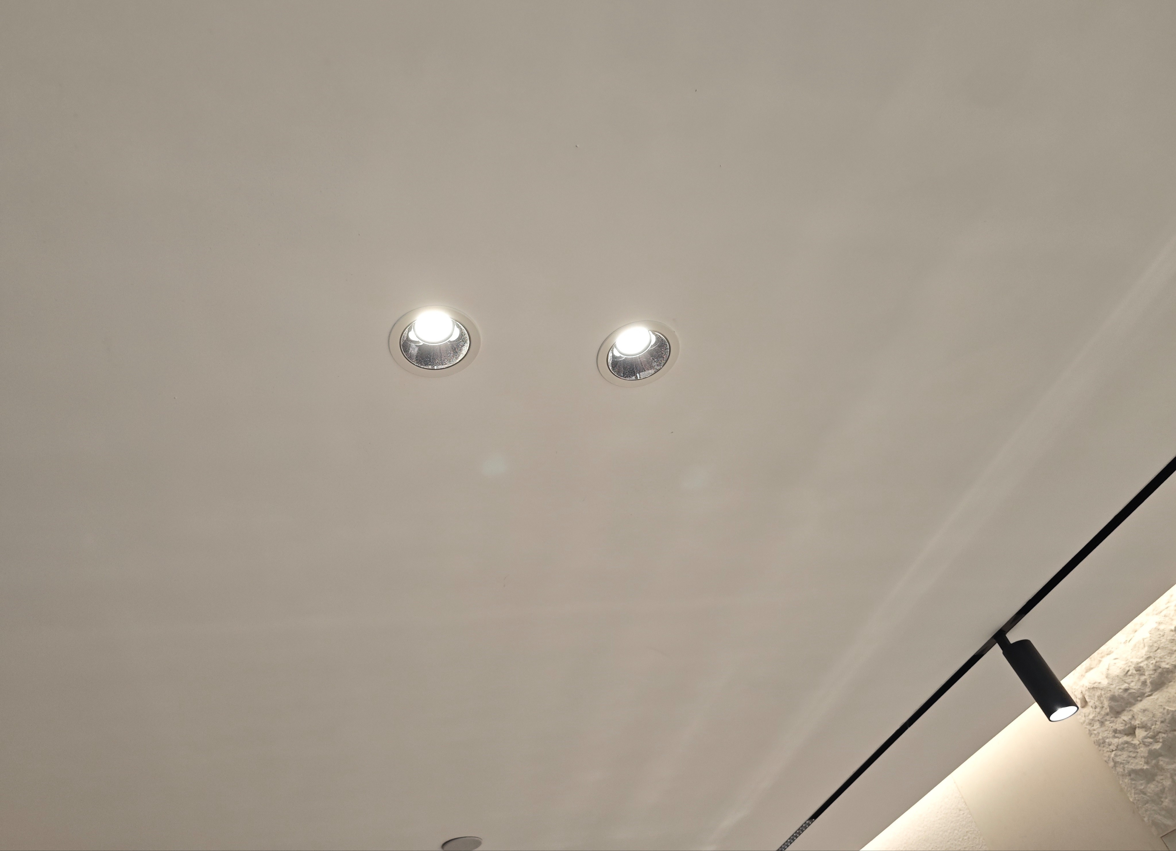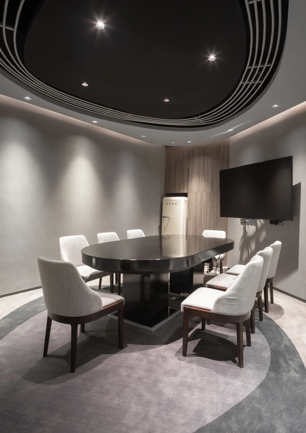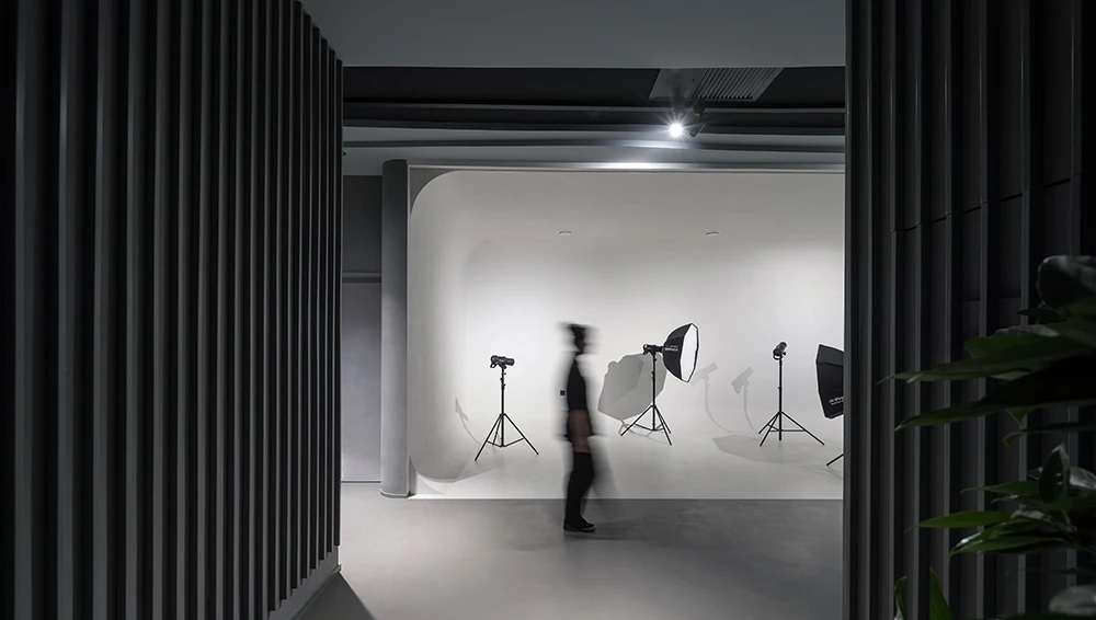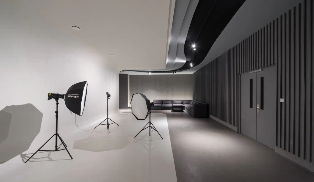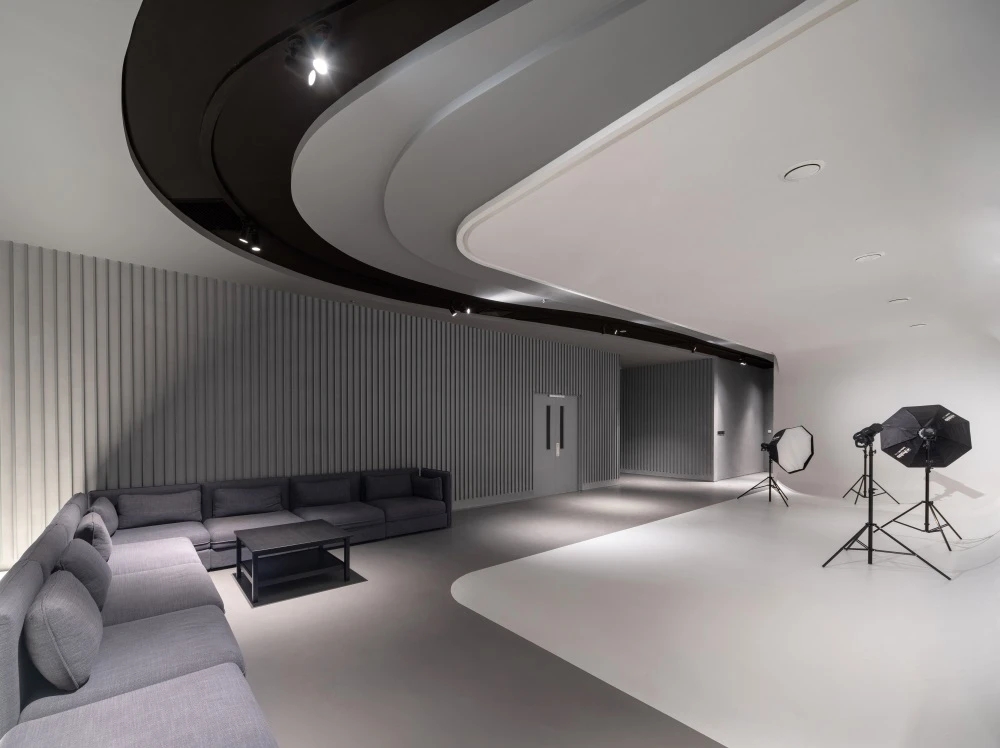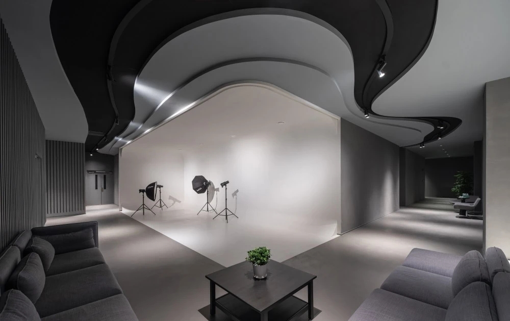 白色带弧形的墙面给予了空间最大的自由度,营造舒适的拍摄环境,并实现摄影空间与休憩空间的完美转换。采用曲线吊顶,部分外露黑色管道,与上层风格一致的同时,兼具空间引导性。多变的灯光和材质在丰富空间的同时,强调光影效果,烘托出场景感。
