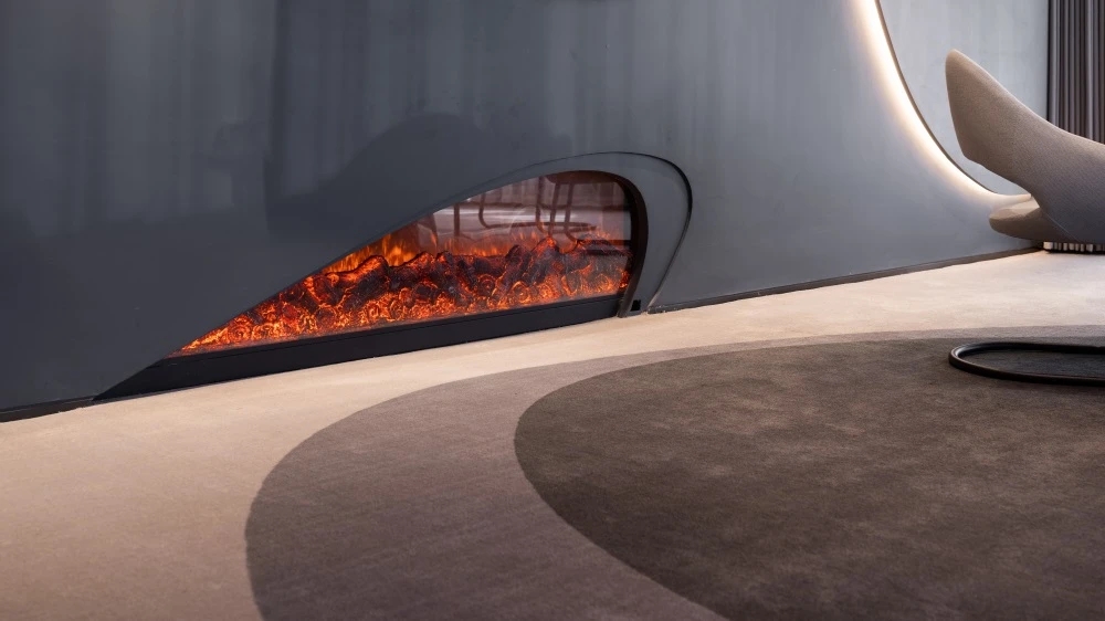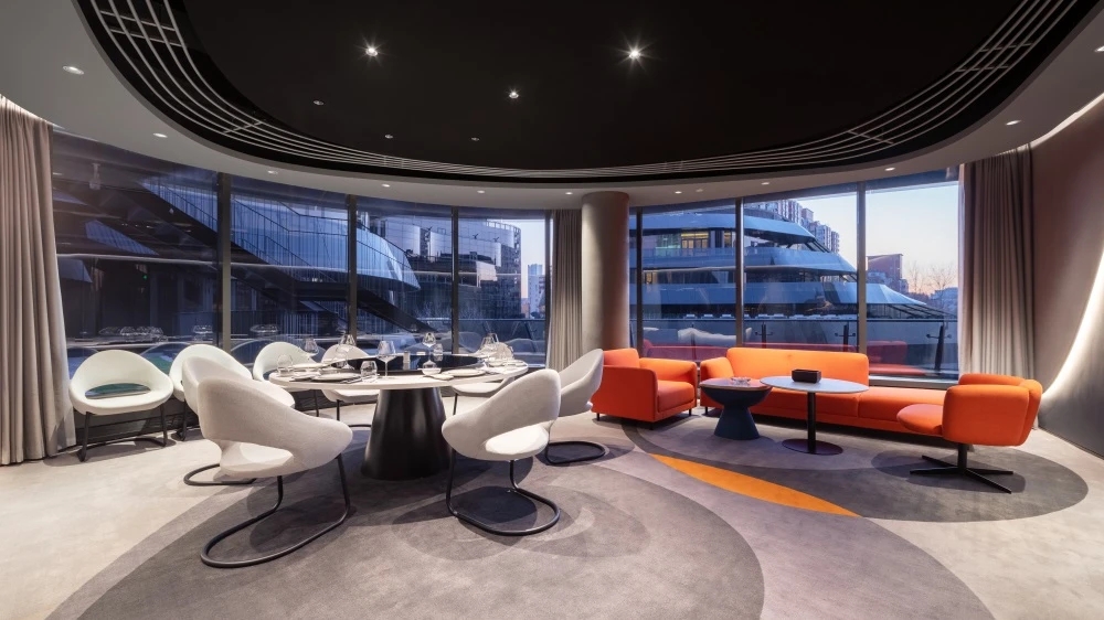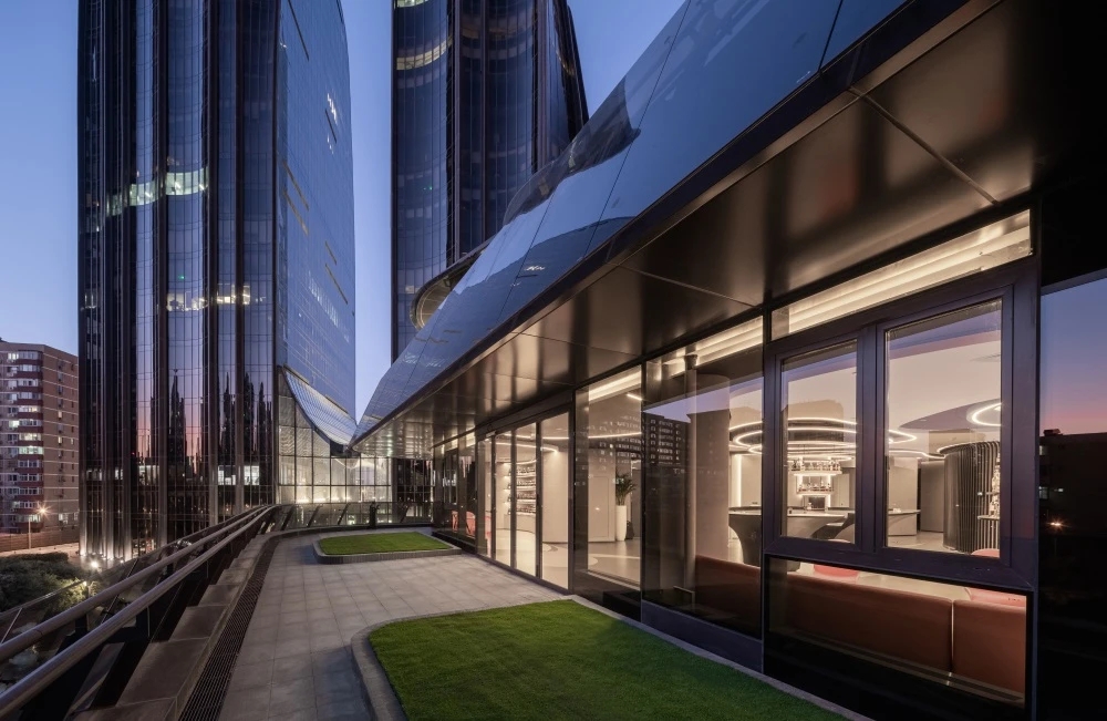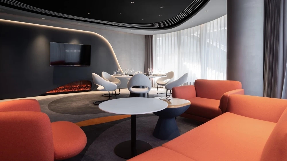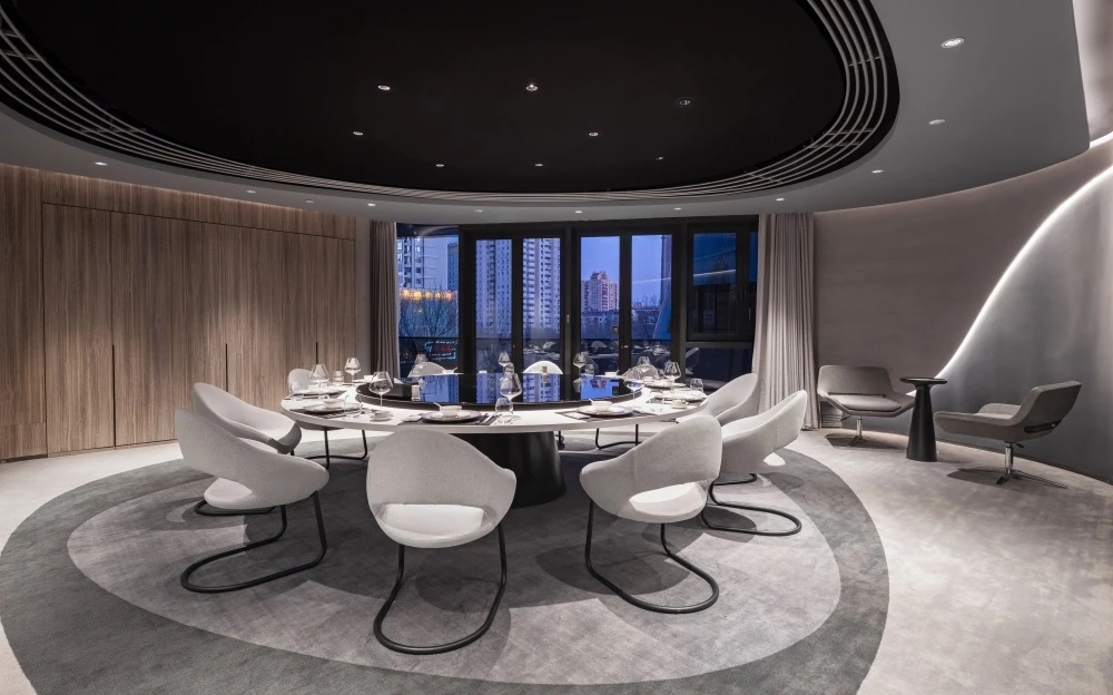 小包间顶部星光般的灯光与餐桌旁温暖的壁炉,营造出犹如傍晚在森林里与星空和篝火为伴的惬意时刻。傍晚时分,在建筑曲线交错的露台上闲谈小憩,仿若置身于空中花园一般的自然氛围中,欣赏未来山水意境;室内空间与公共空间相互融合、共生。