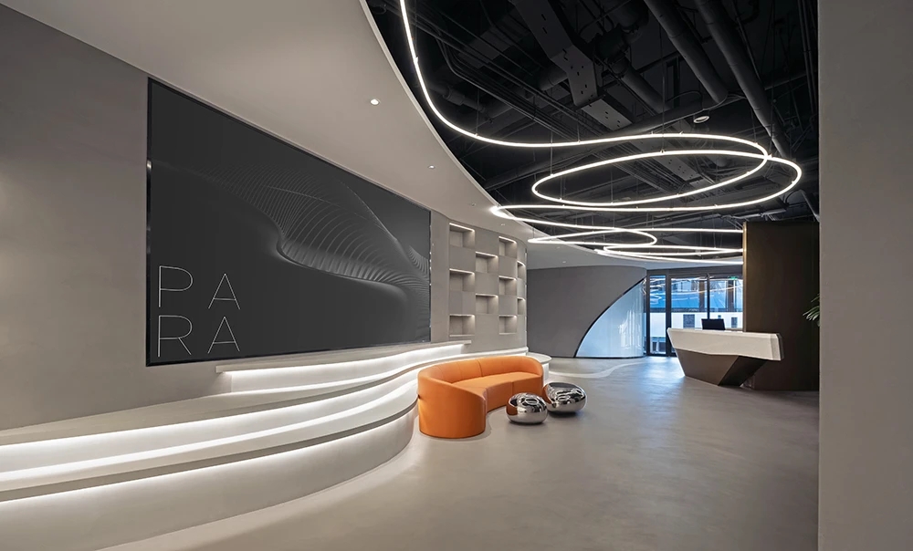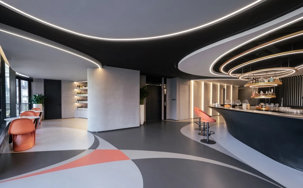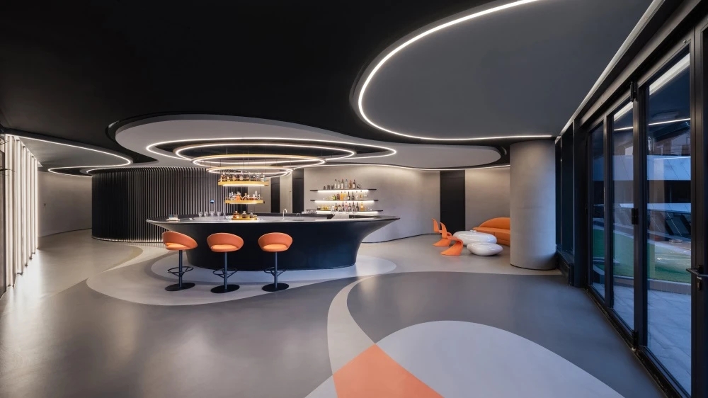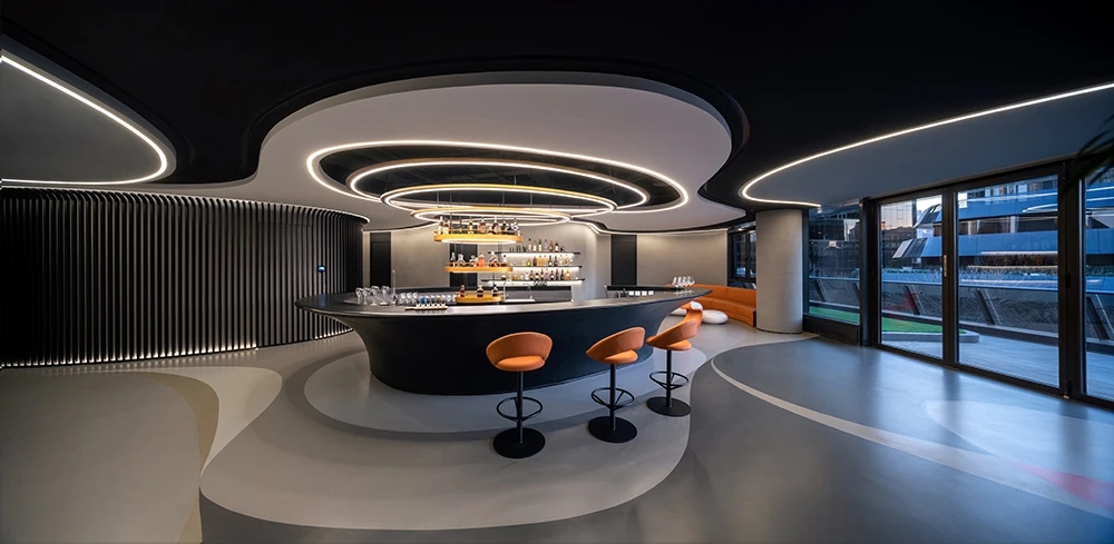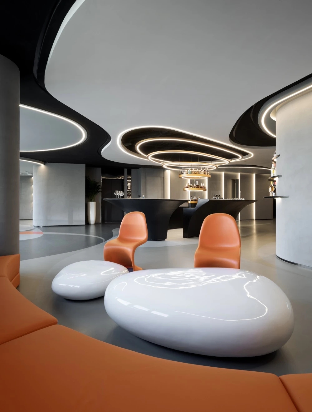 非线性的曲线纳米水泥地面连接前台及多功能展示区,展台开放包容、层叠连续,橘色的沙发作为点缀,使区域兼顾休憩、会客等功能。背景墙的展台可双面使用,在展示物品的同时,还可用作背面水吧的收纳。通往二层楼梯旁自由曲线状的展台与接待空间形成视觉上的连续性,线性的元素与曲线的灯带产生碰撞,精致的吊顶与裸露的管道等不同元素都极大地强化了视觉张力。