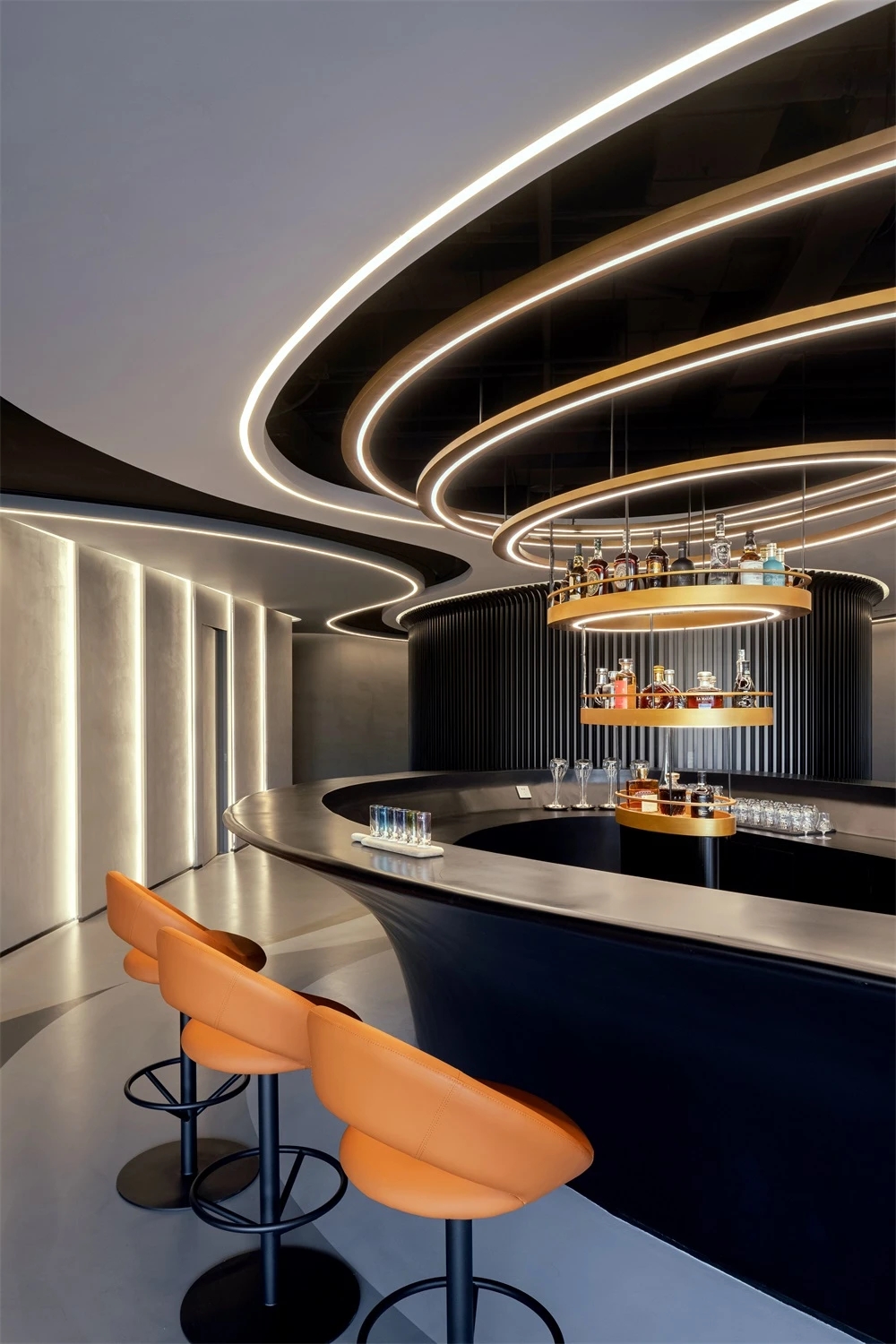 在设计上,通过对顶面、墙面、地面与线性灯带等元素整体性地考量,来模糊空间既有的边界感,塑造有机形态。从顶面到地面如瀑布般倾泻而下的黄铜酒架,与高反光无缝一体的黑色吧台相碰撞,形成了微妙的平衡。