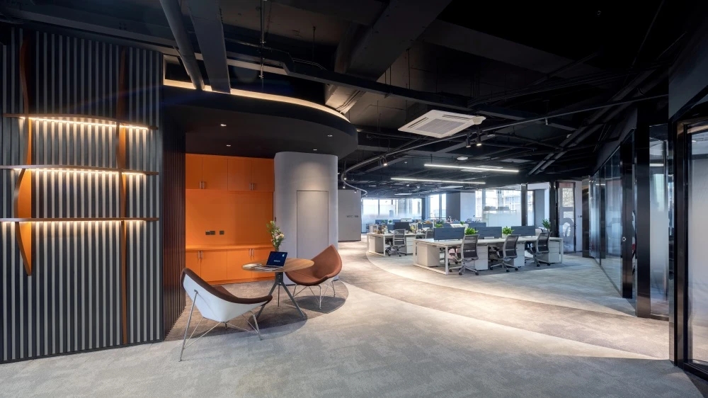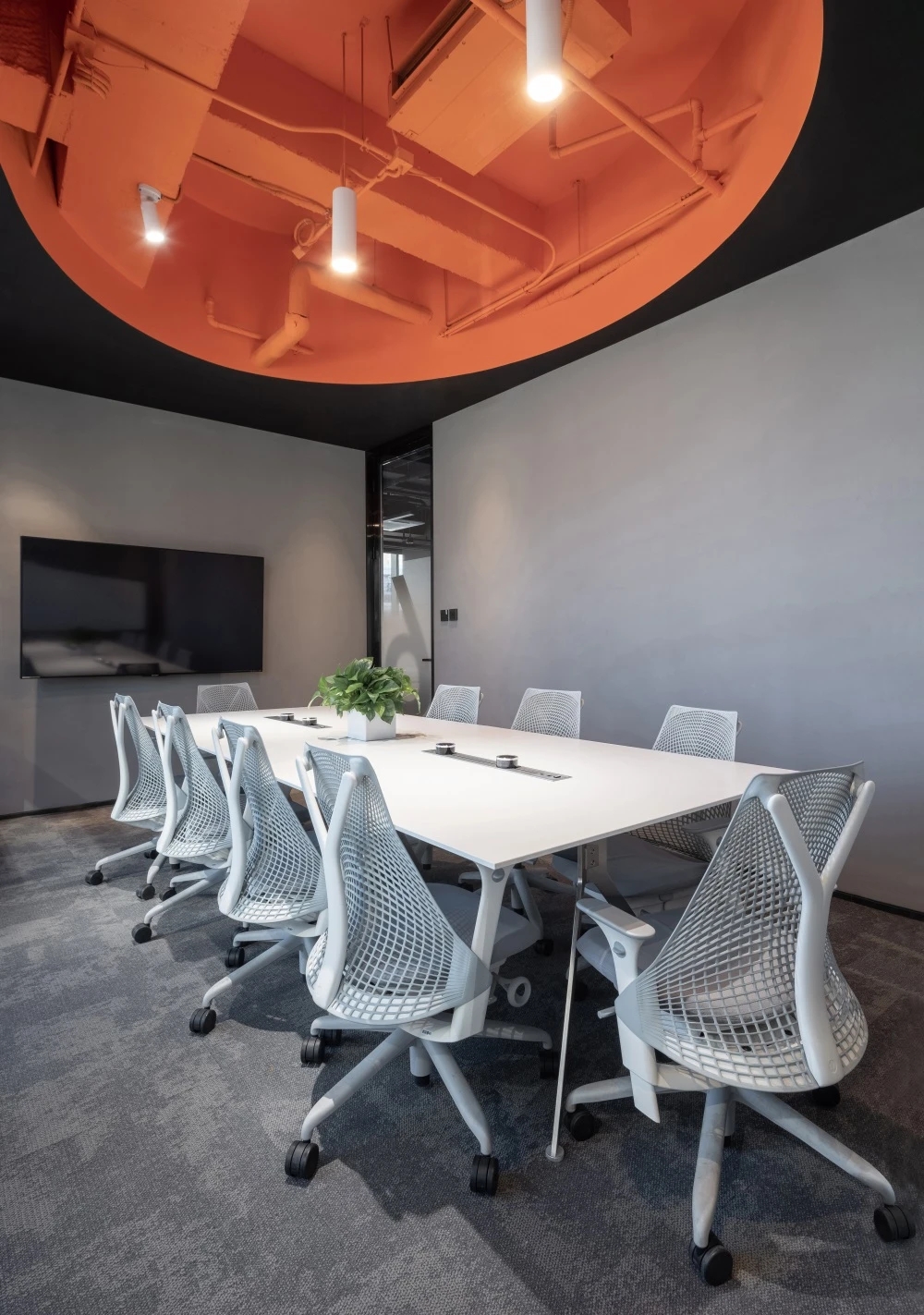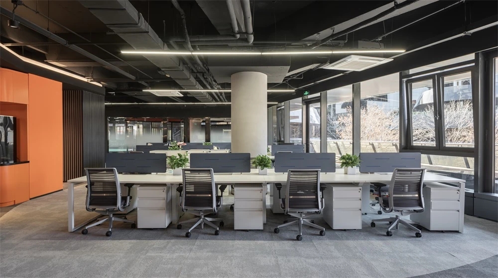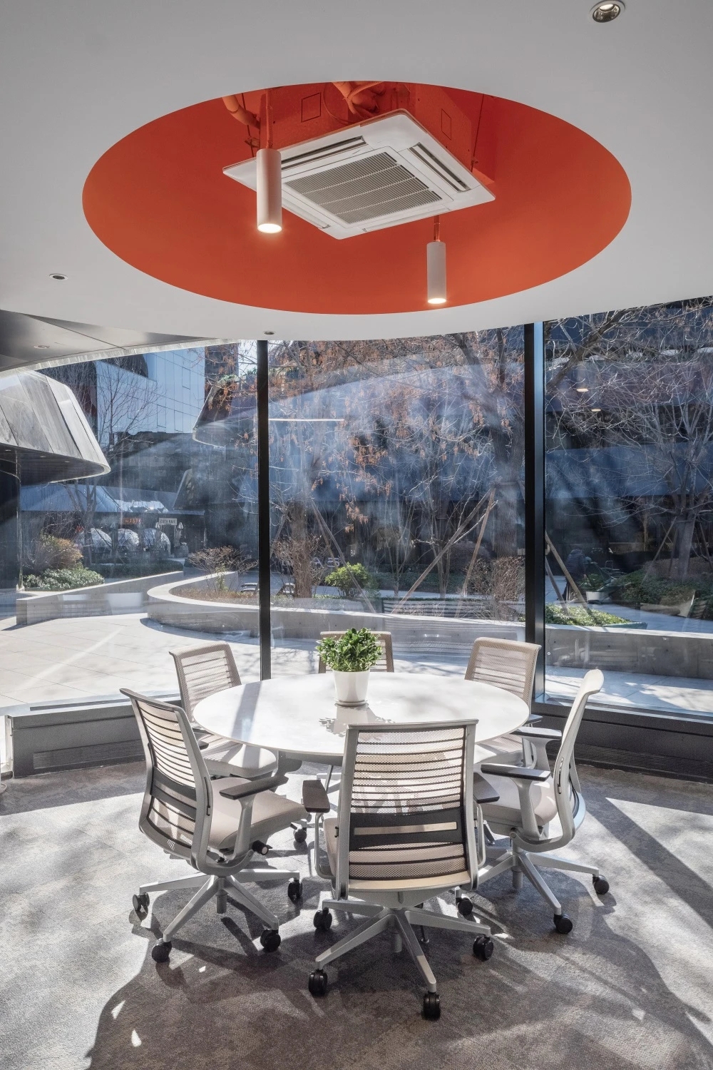 双层玻璃隔断配以黑色金属框架,空间分区明确又互相连通。原建筑层高并不高,且整体开敞部分面积较大,为了使空间达到更舒适的高宽比例尺度,我们保留了原始的建筑结构、设备并将其统一为黑色;选取公共空间的核心做局部吊顶,使其成为整个开放空间中的高光部分,为员工交流、休憩提供场所。