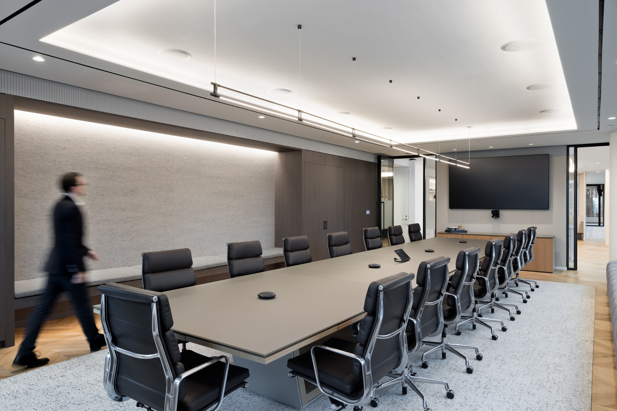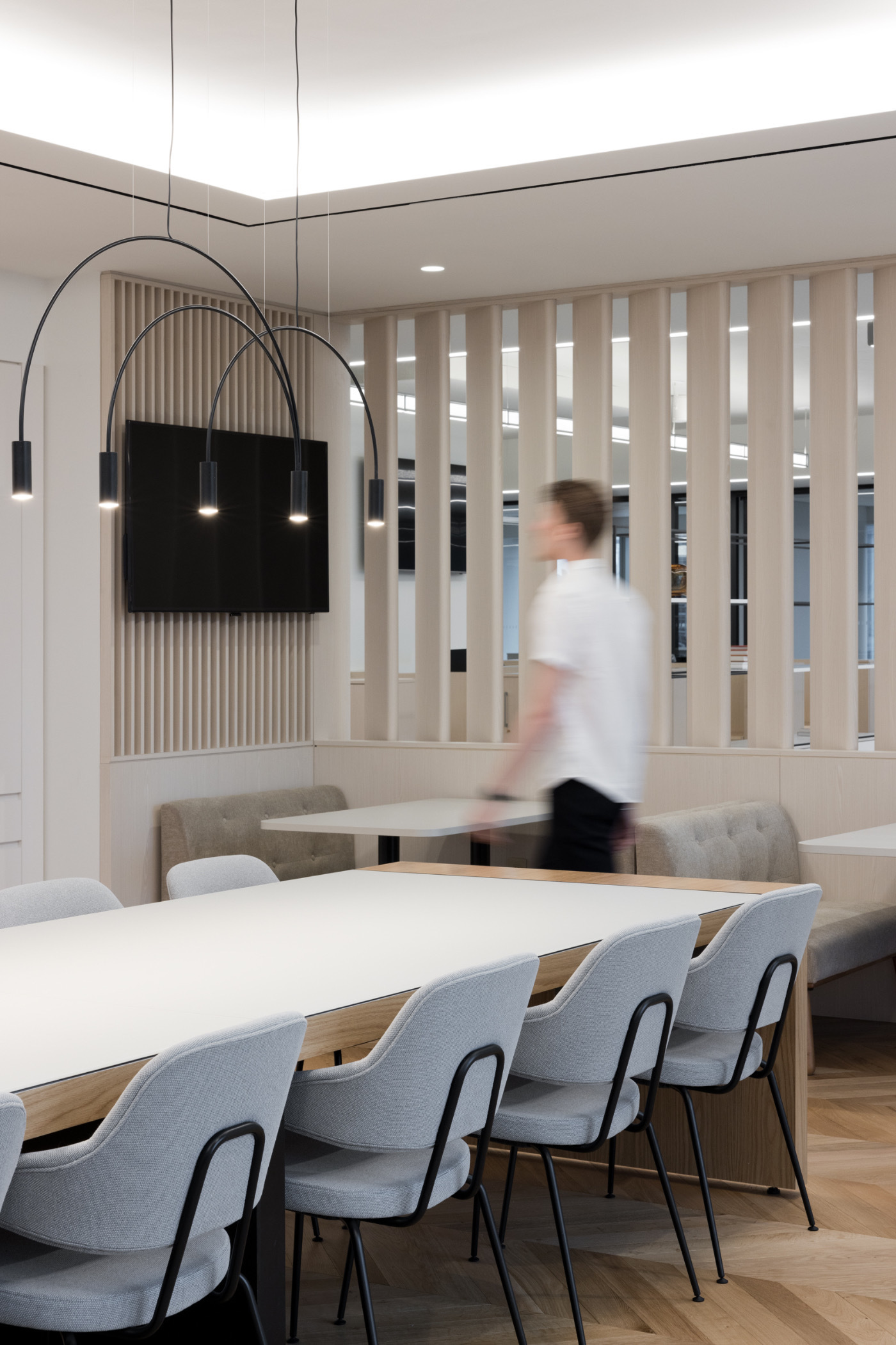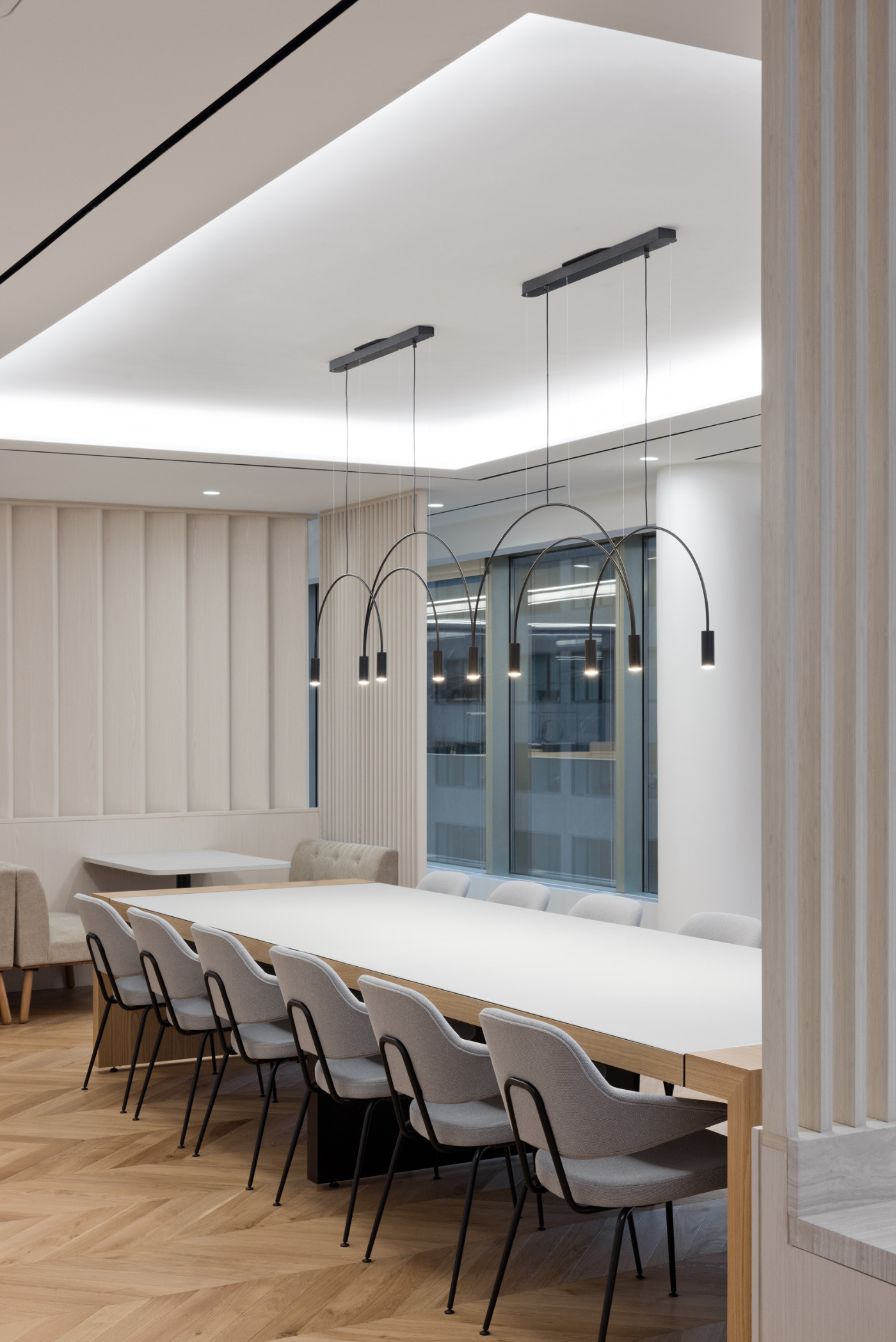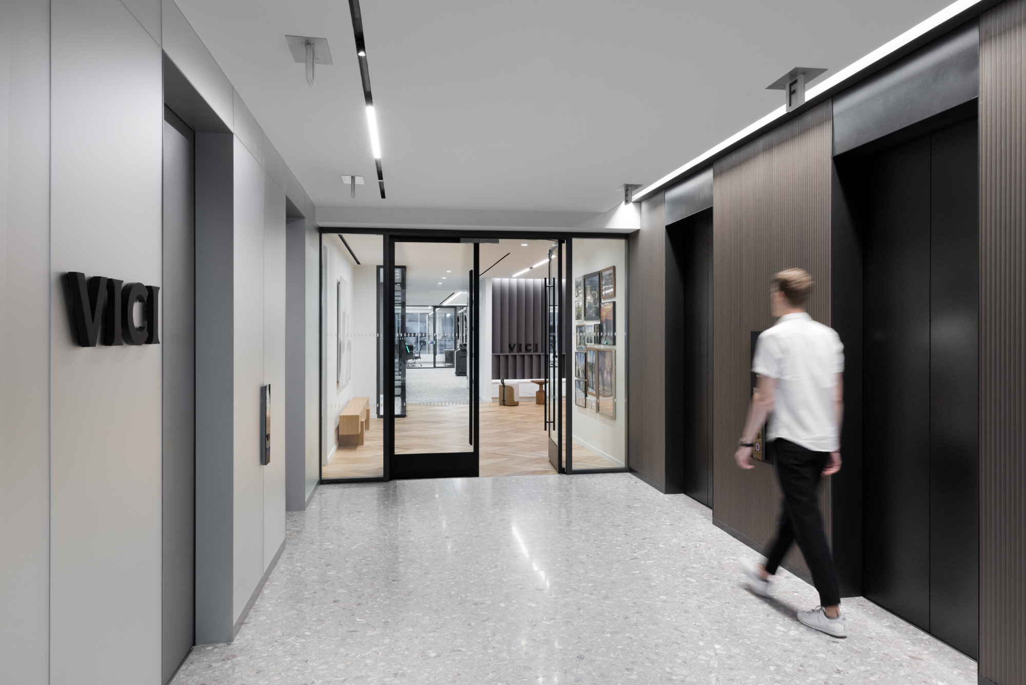 展厅配有会议区及连通的办公室,将舒适的品质与城市的宁静相结合。展厅展示了典型的鞋品用料,诸如皮革、毛毡和软木等。设计师将室内陈设进行个性化装饰,营造出温馨的一面,与建筑的钢铁、玻璃立面形成鲜明对比。采用坚固的橡木板为客户洽谈或非正式会面创造了一个开放的空间。“品牌墙”和“展示塔”使展示灵活多变。除了开放式吊顶结构,“工艺别致”的灯具和金属家具也营造了别样的氛围。