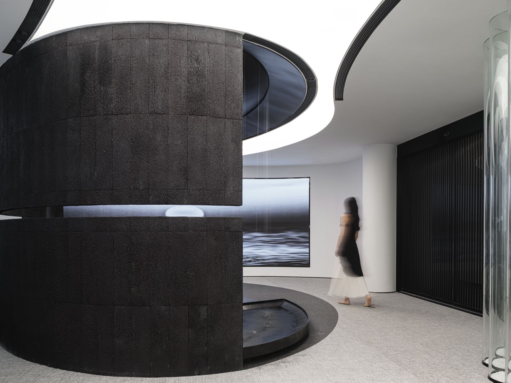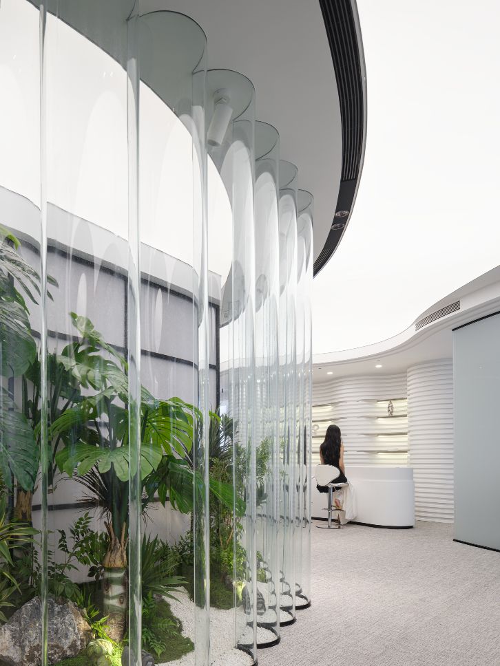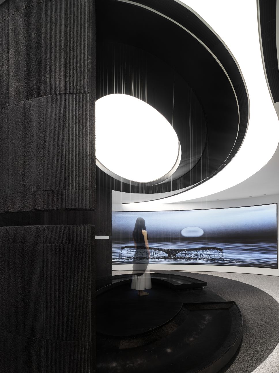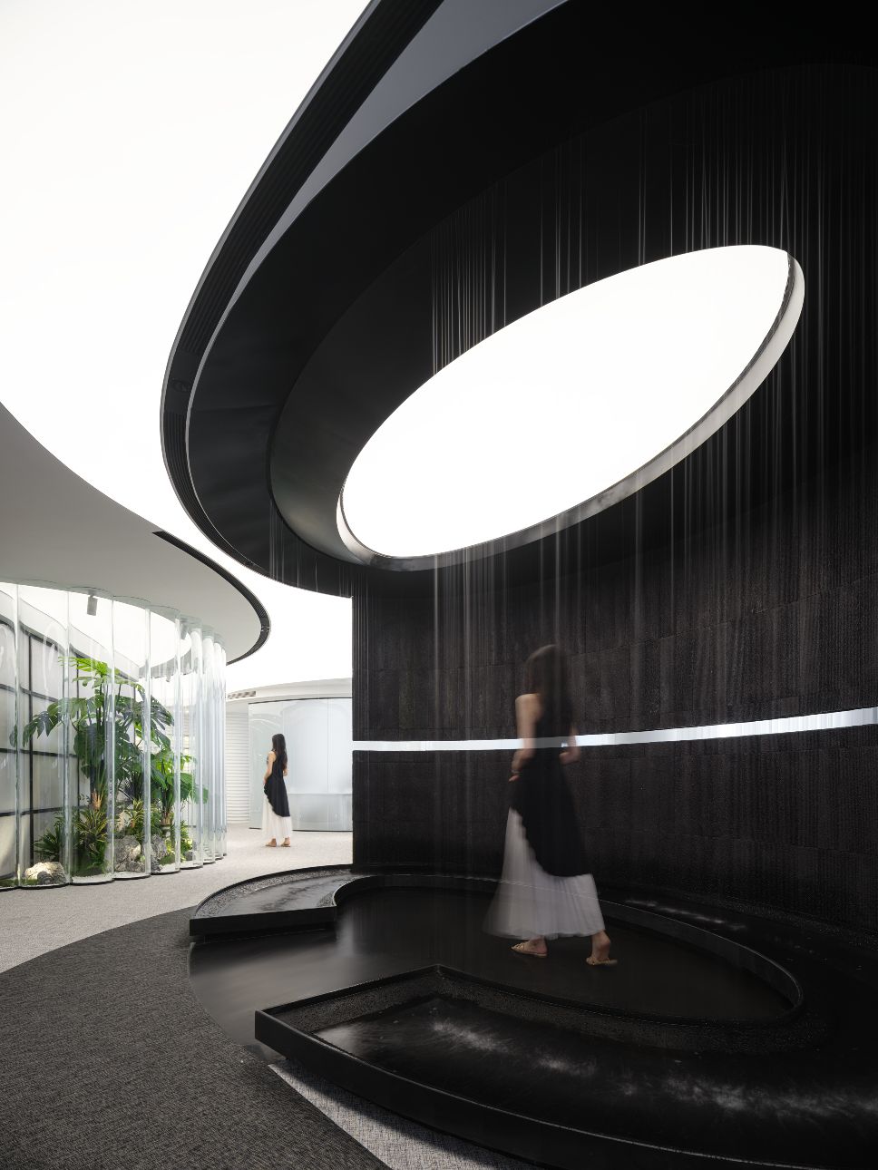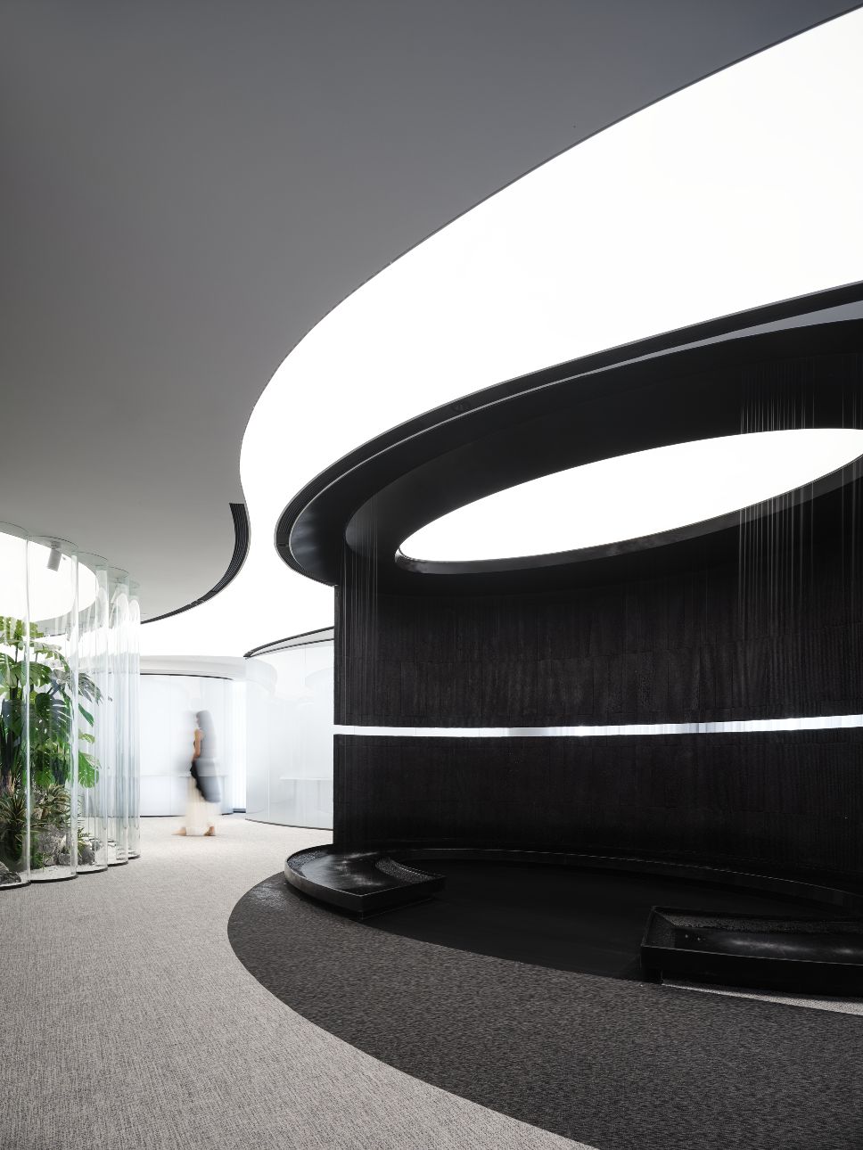 黑与白、水与植、自然的肌理与流动的线条共同勾画出一幅与自然交融的画面。曲线玻璃的设计,让时间在此停滞,生命的时刻得以定格。绿意与石材和玻璃的交融,每一次呼吸都与自然息息相关,每一处细节都与低碳、生命和自然产生了深刻的对话。