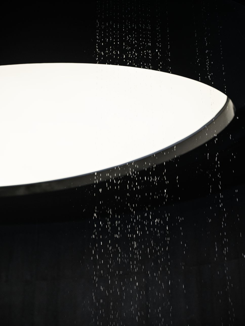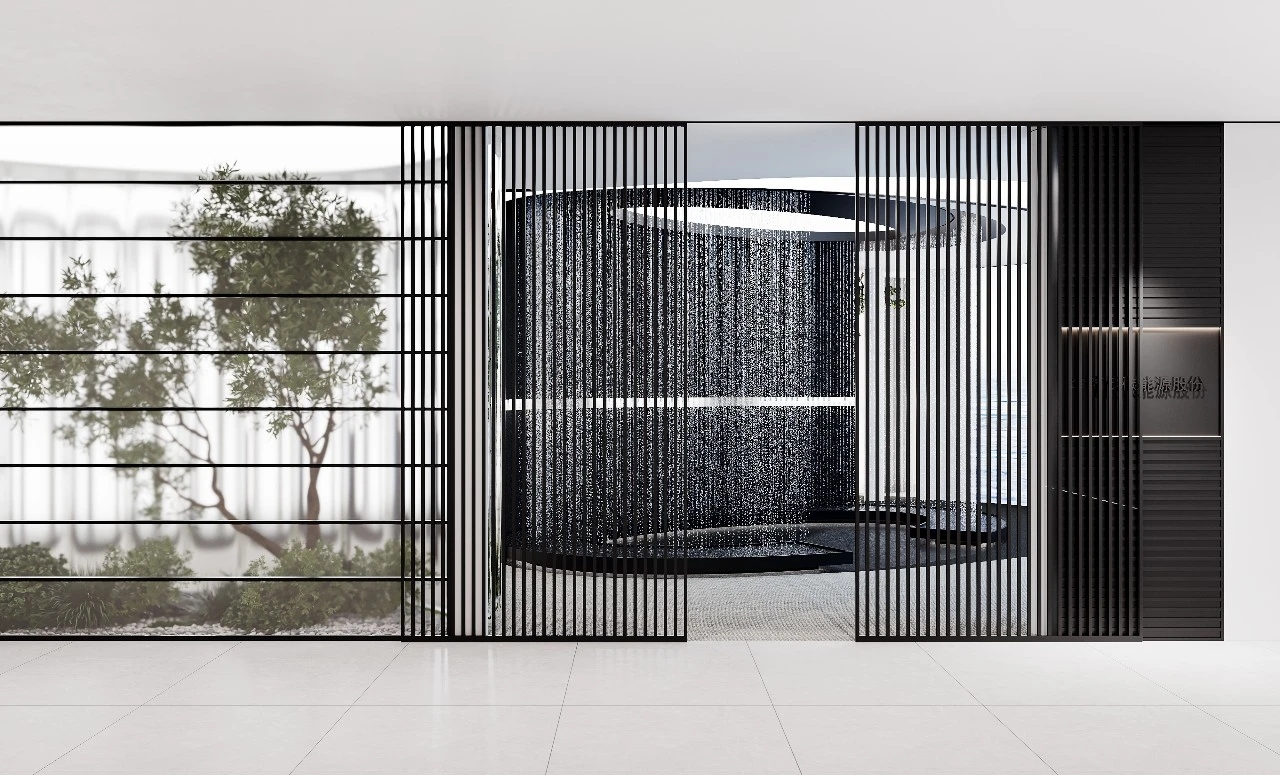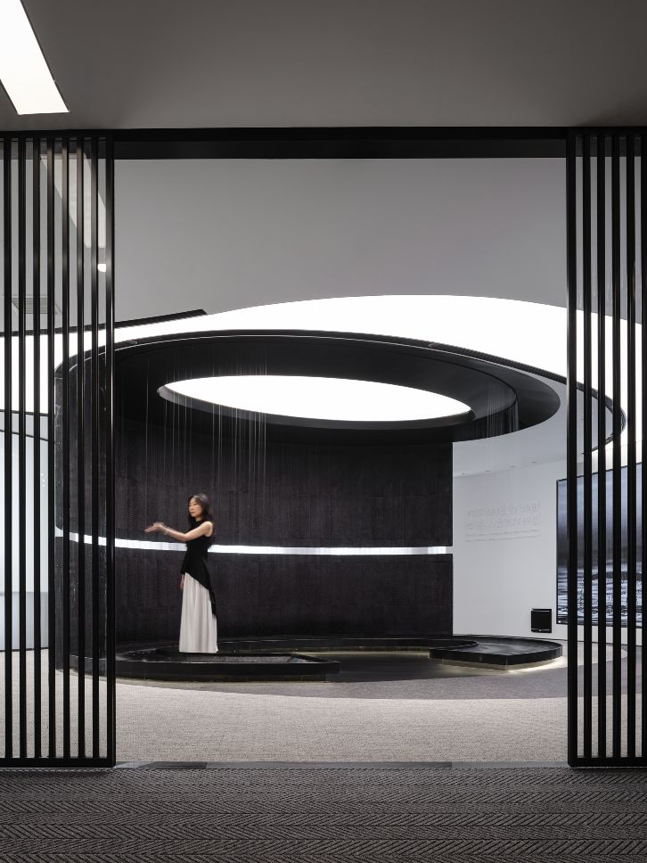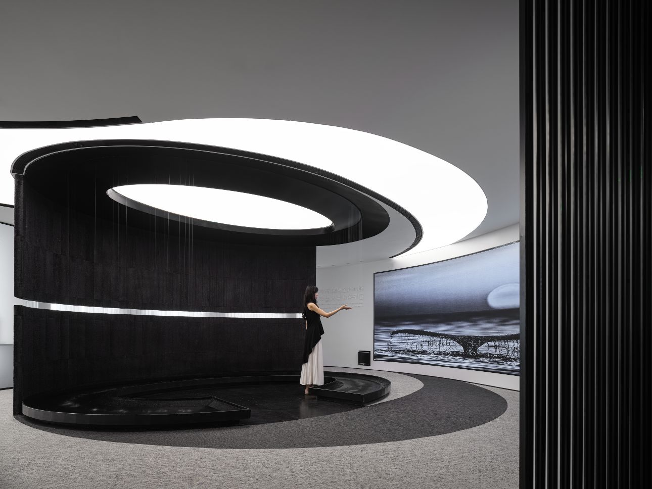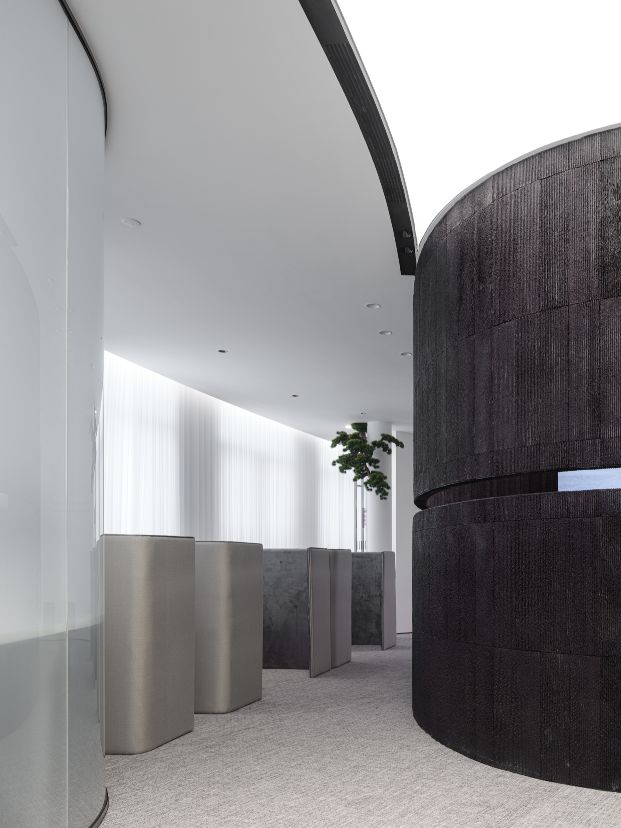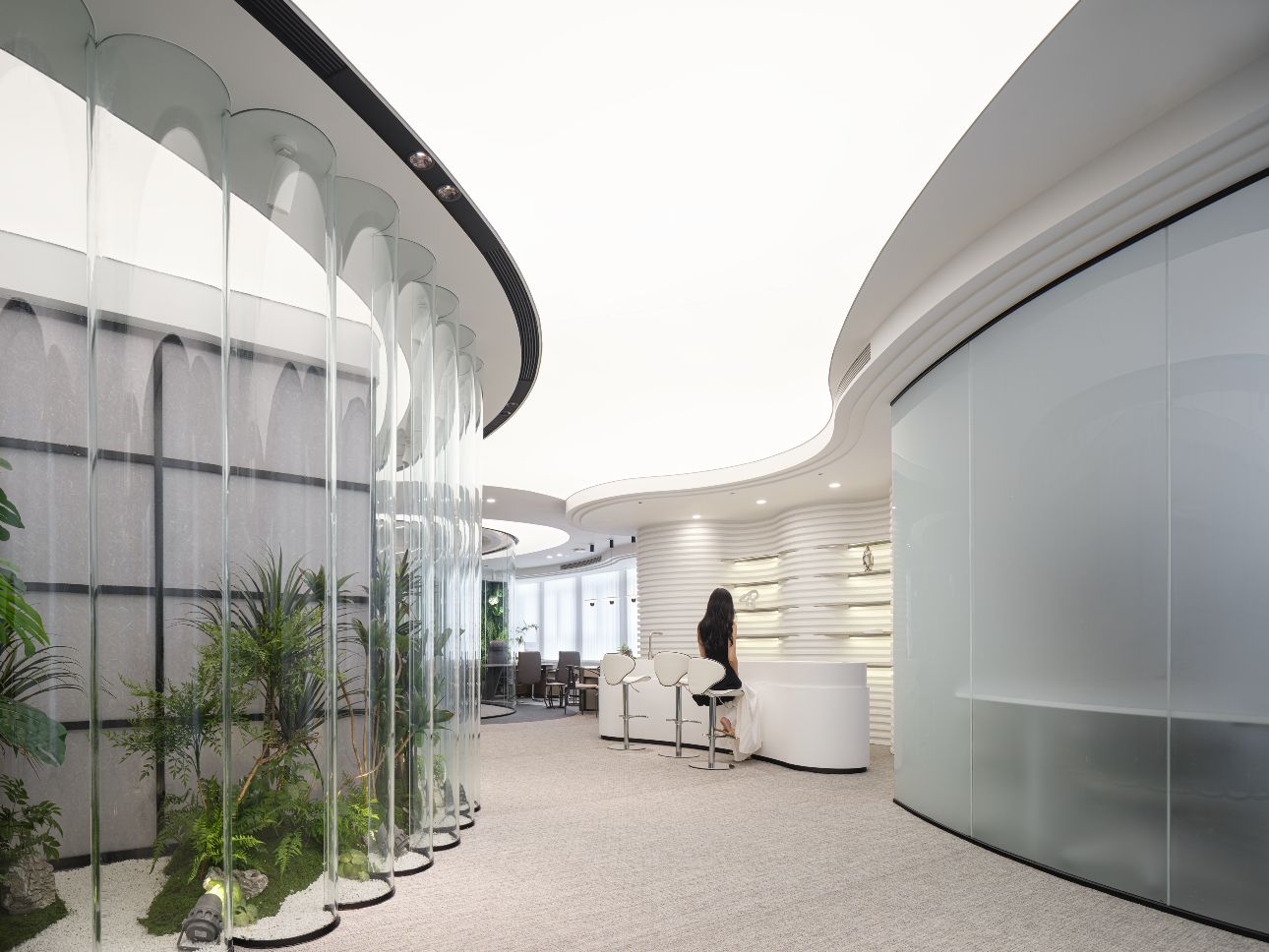 黑与白、水与植、自然的肌理与流动的线条共同勾画出一幅与自然交融的画面。曲线玻璃的设计,让时间在此停滞,生命的时刻得以定格。绿意与石材和玻璃的交融,每一次呼吸都与自然息息相关,每一处细节都与低碳、生命和自然产生了深刻的对话。