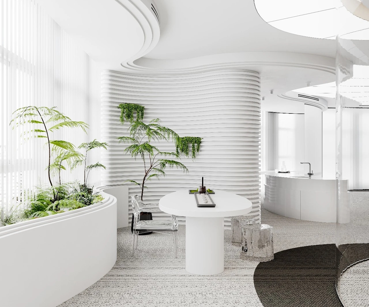碳与生空间,始于低碳,探索与自然共生的可能性,办公不仅是工作的场所,更是人与自然的对话。透过消解的界墙,释放空间的无限可能,黑与白,水与鲸,流线与曲型,生长与定格,在此汇聚,构建每一个细胞的和谐。每一处细节,都是人与空间深度探讨,每一个角落,都蕴藏着与自然、与生命的对话。