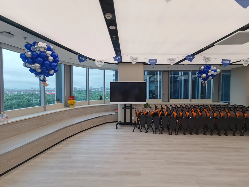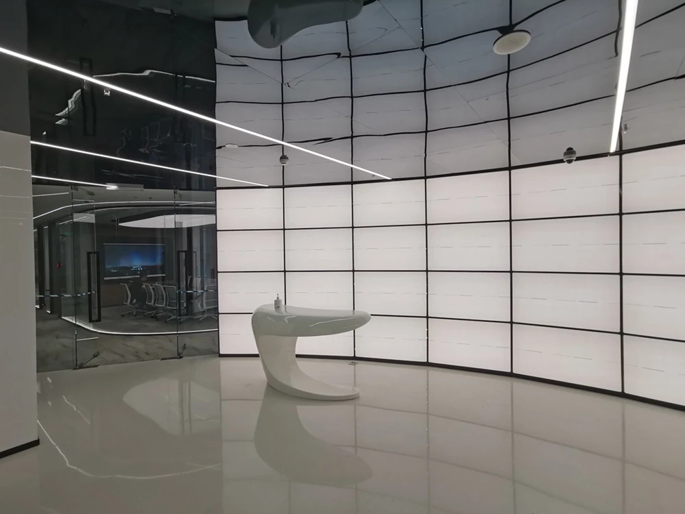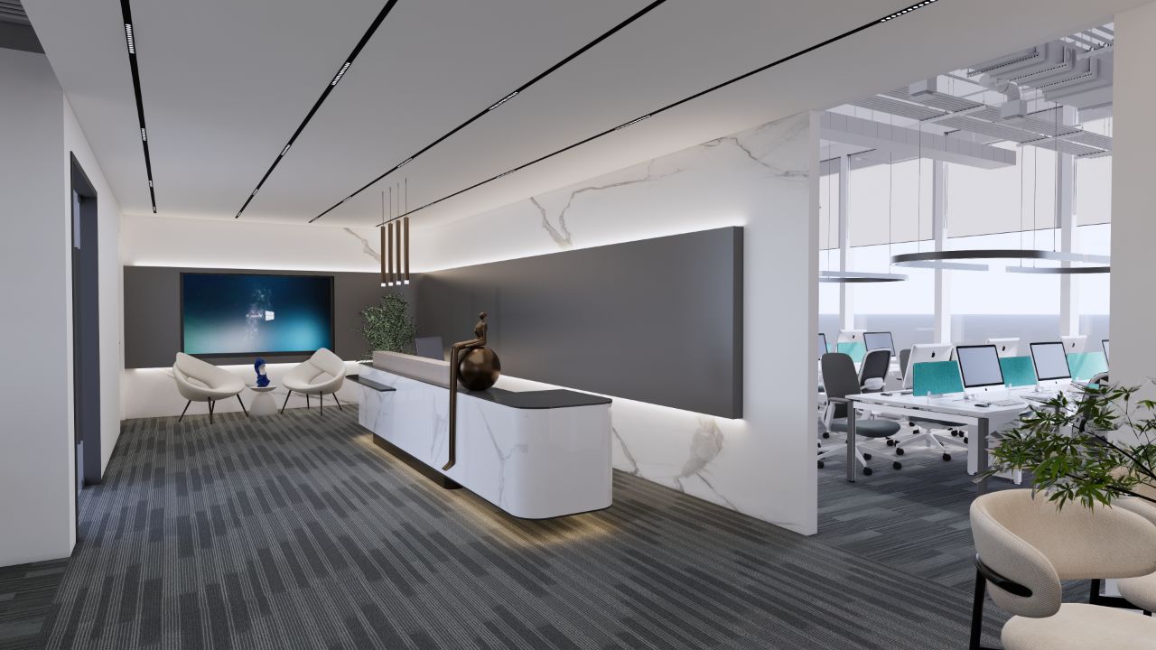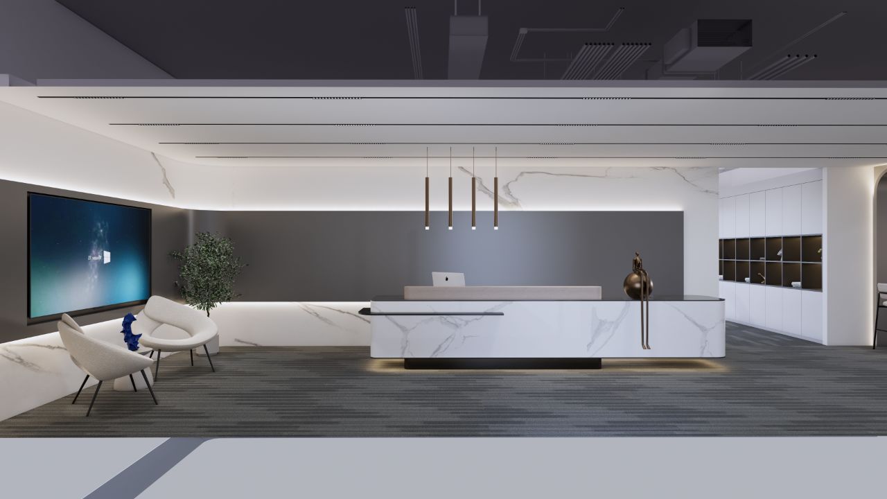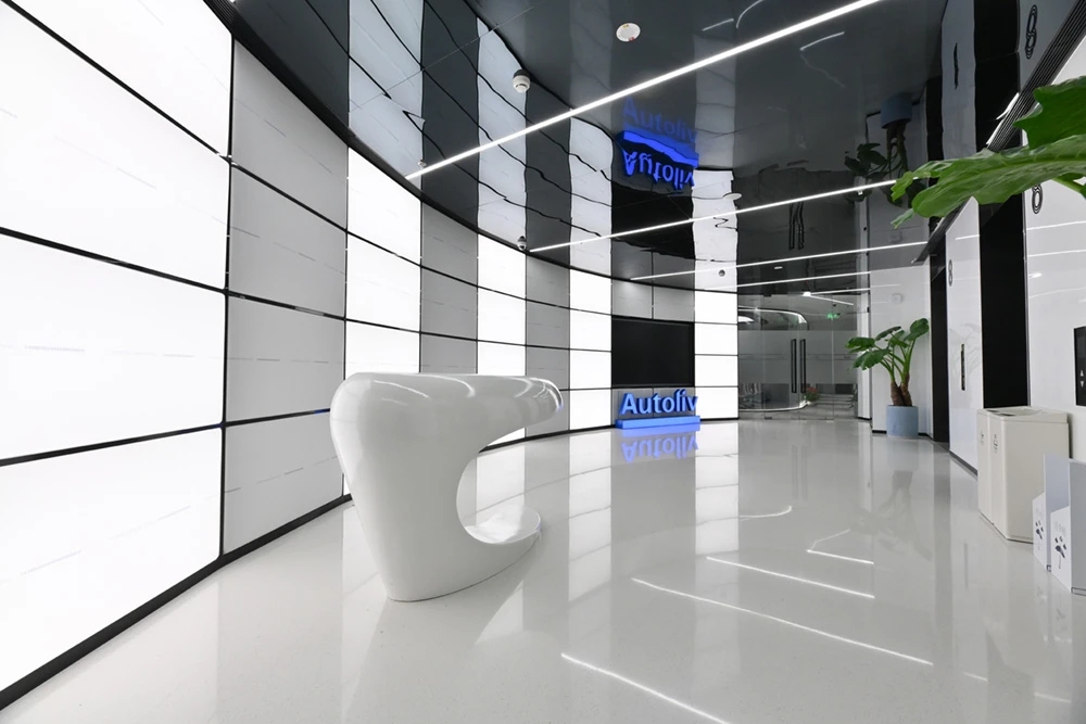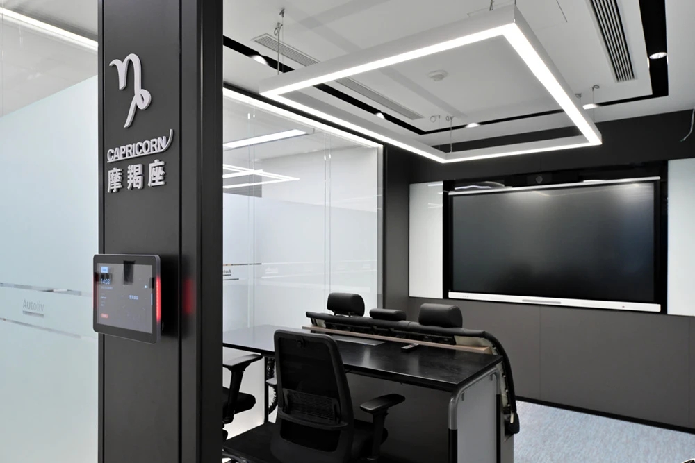 以企业的文化和元素,结合现代,科技的手法,趣味性的体现出企业对人文关怀,轻松活力的新工作环境,怎么与当下疫情下的安全卫生及防控相结合。整体设计打破了传统工作环境的氛围,设计师打造出一个“以人为本”的办公,展示,休闲和生活的个性空间,助力客户的进一步发展、创新和团队凝聚力。在这里,每位员工都能找到最适合自己的工作空间,以自己喜爱的方式和愉悦的心态完成每天的工作。Saving More Lives 是企业的目标,也是这次设计师要在空间里体现的主题。在电梯出来,一步入半圆弧的接待前厅,马上看到的是以安全气囊元素为主创意的,带灯光变化的半弧造型墙,时尚大气。在这纯粹的黑白灰空间里,一个纯白色飞驰动感造型的前台安安静静的摆设在那,在不使用的时候,它也是一个时尚的艺术品。和背镜墙相结合,体现了速度与安全的设计理念。