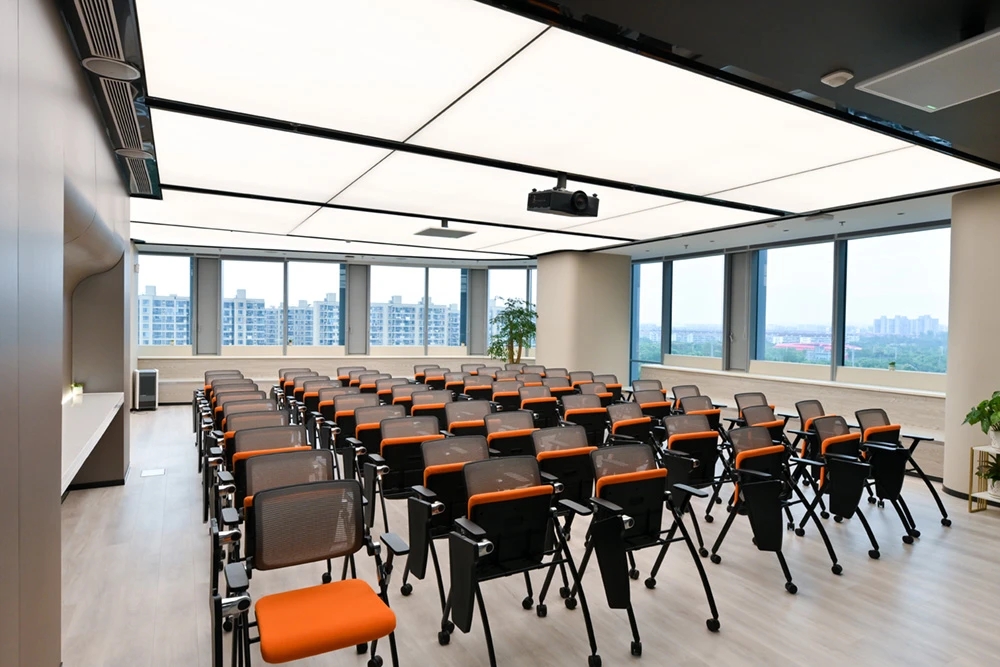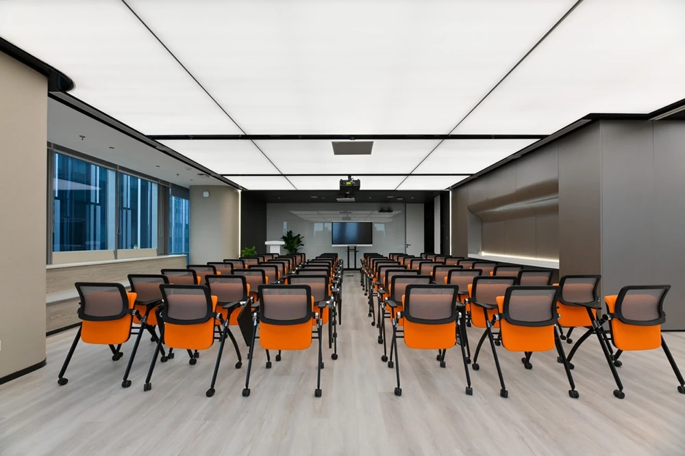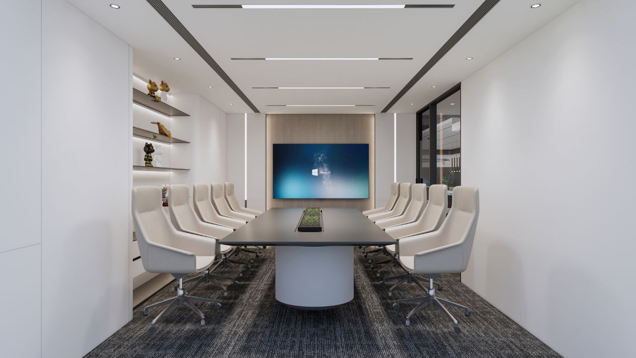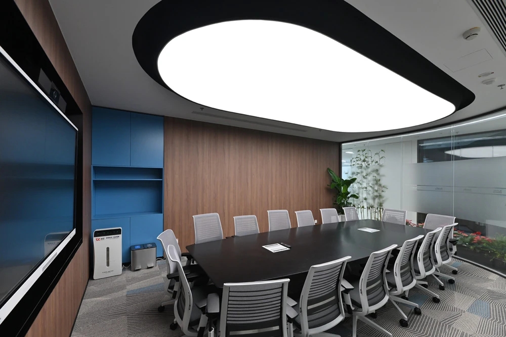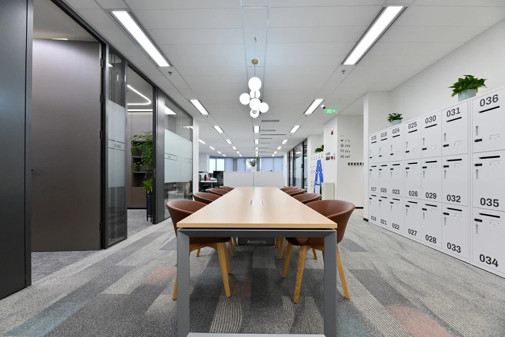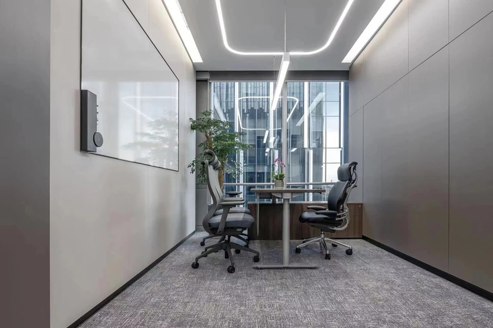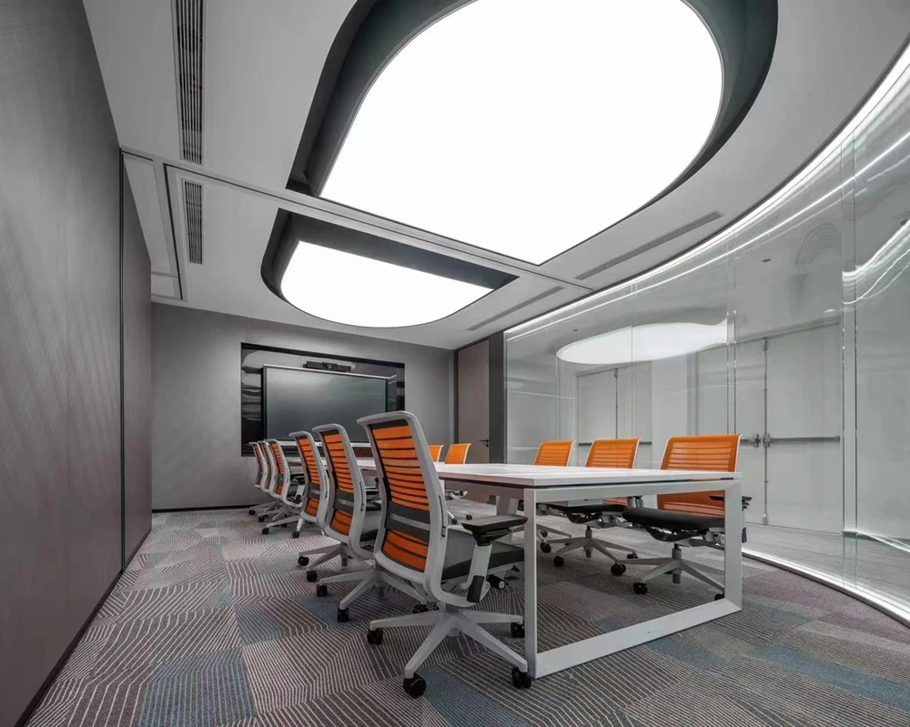 在接待前厅左右两边各设置了一个大会议室,其中一个是现代酷灰的可二合一的会议室,另一个是稳重优雅的行政会议室。感谢成品隔断供应商卡莱斯卓的紧密配合和支持,在设计师的要求下,把LED灯带嵌入了双层玻璃隔断中。让整个会议室区域看上去充满科技感!