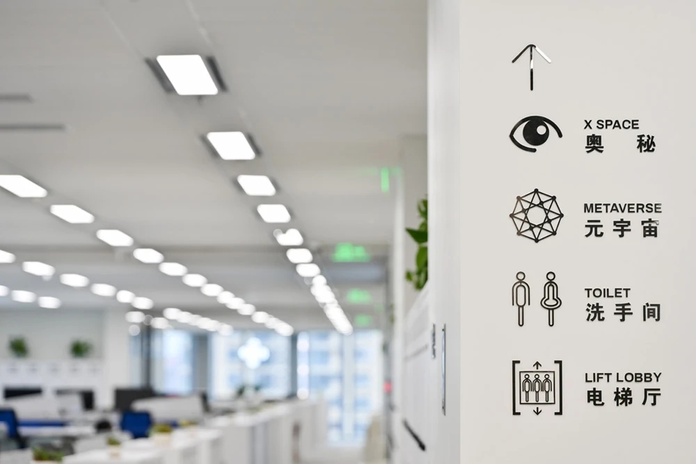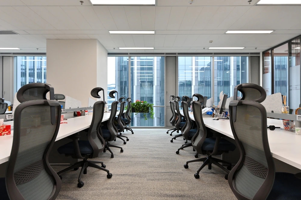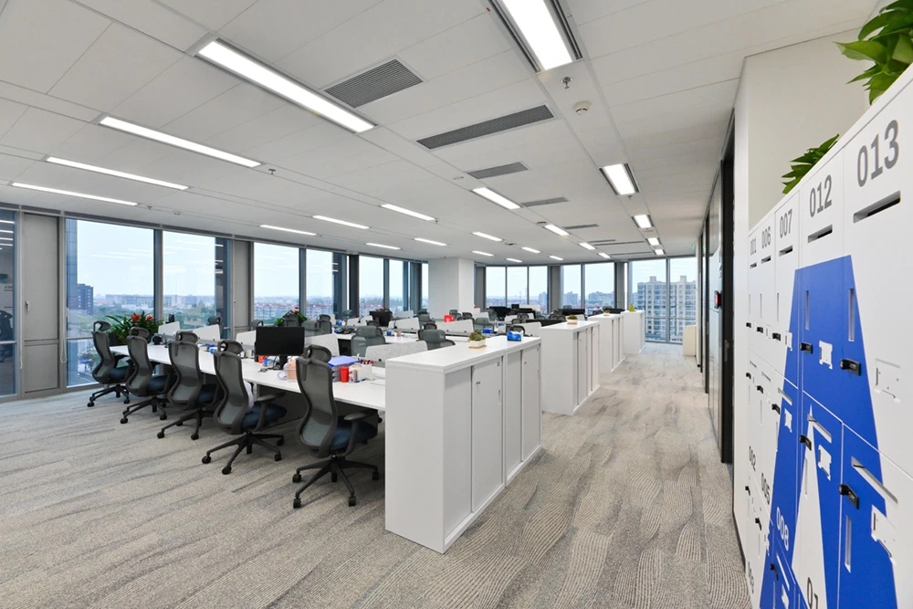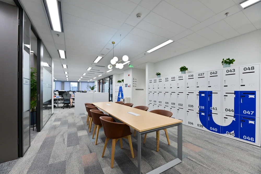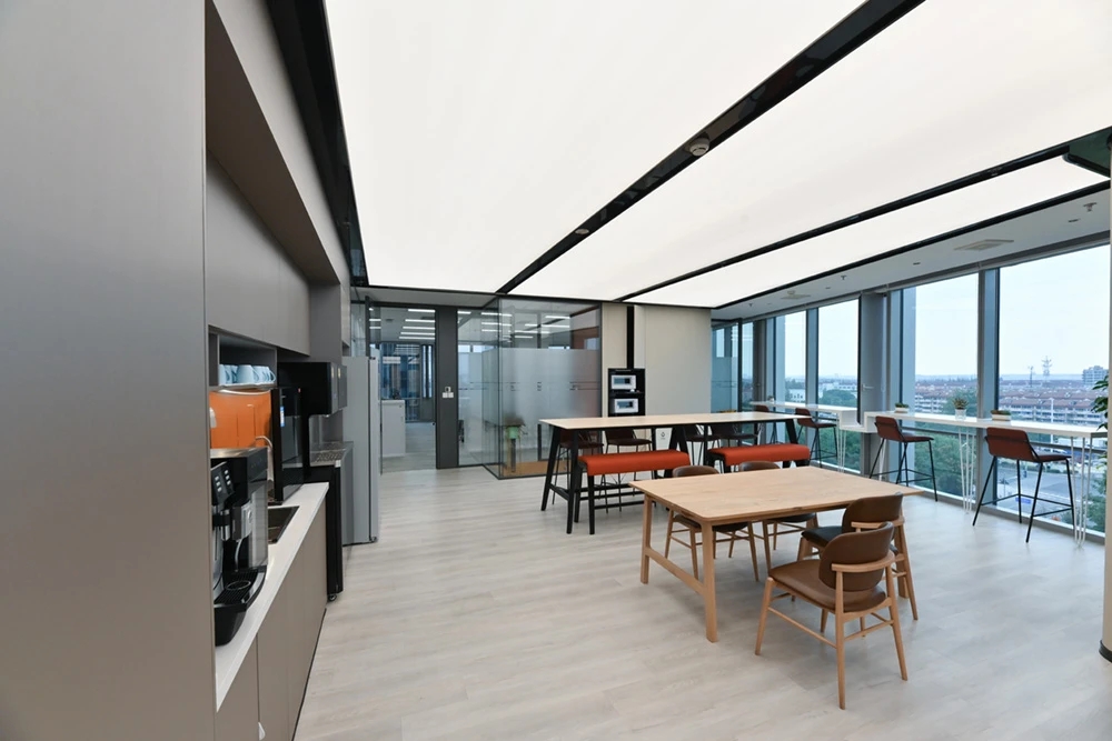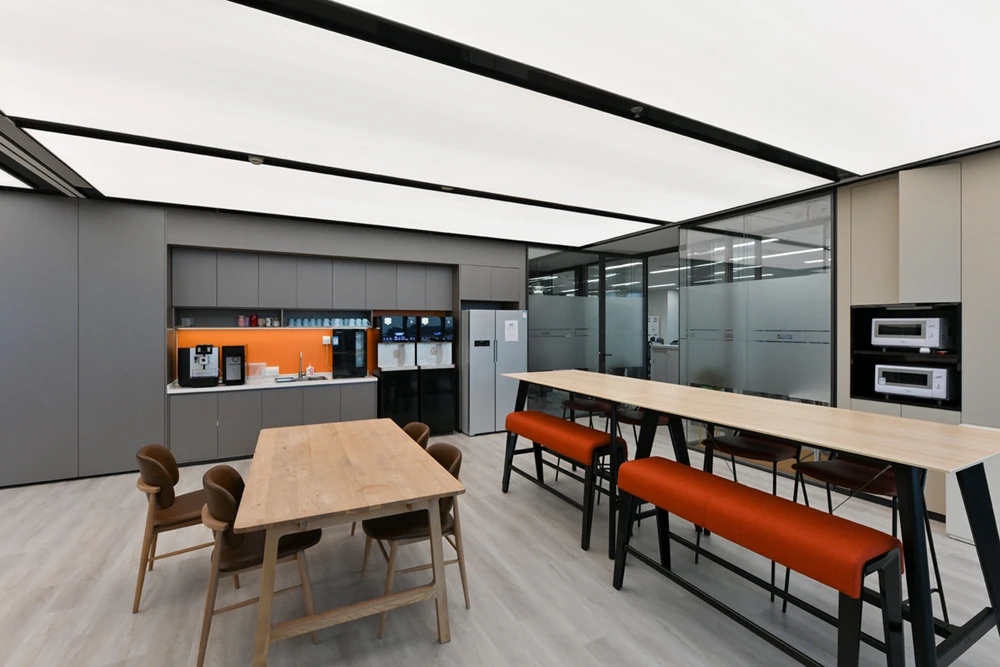 门口有杜邦纸形象墙,内嵌发光灯带,在步入空间之前吸引大家侧目一望,增加探索空间的好奇心。在开放的空间中,经过深思熟虑,材料的使用呈现设计的透明和真实性,引导员工根据路径进入对应的办公区。保证使用的基础上,舍弃复杂的装饰结构,采用极简设计手法,并让艺术元素与空间相融合,从而打造全新的办公体验。光透过不同的结构、材料、留下不同的光与影构造,在明与暗之间交替、跳跃,通过光线的走向、落影,把整个空间的设计手法展示出来。