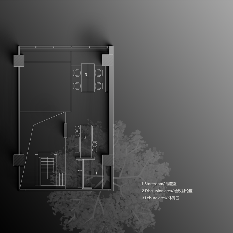 设计师引用几何建筑元素,使空间美学达到极致,在二楼空间做跳色的空间点缀,让进入者在精神层面更容易进入工作氛围。工作室入口右侧是钢结构楼梯,进入二层的会议兼商务接待/休闲功能的区域。多功能的复合布局满足了日常的使用需求,让空间价值实现最大化。木作的家具陈设呈现在艺术漆地面之上,延续现代简约风格,选材和用色皆和空间设计概念表达有着一定的关联。这里兼顾了办公、待客、小型讨论的多样化用途,此外还置入相应的配套支撑,强化舒适度与便利性。