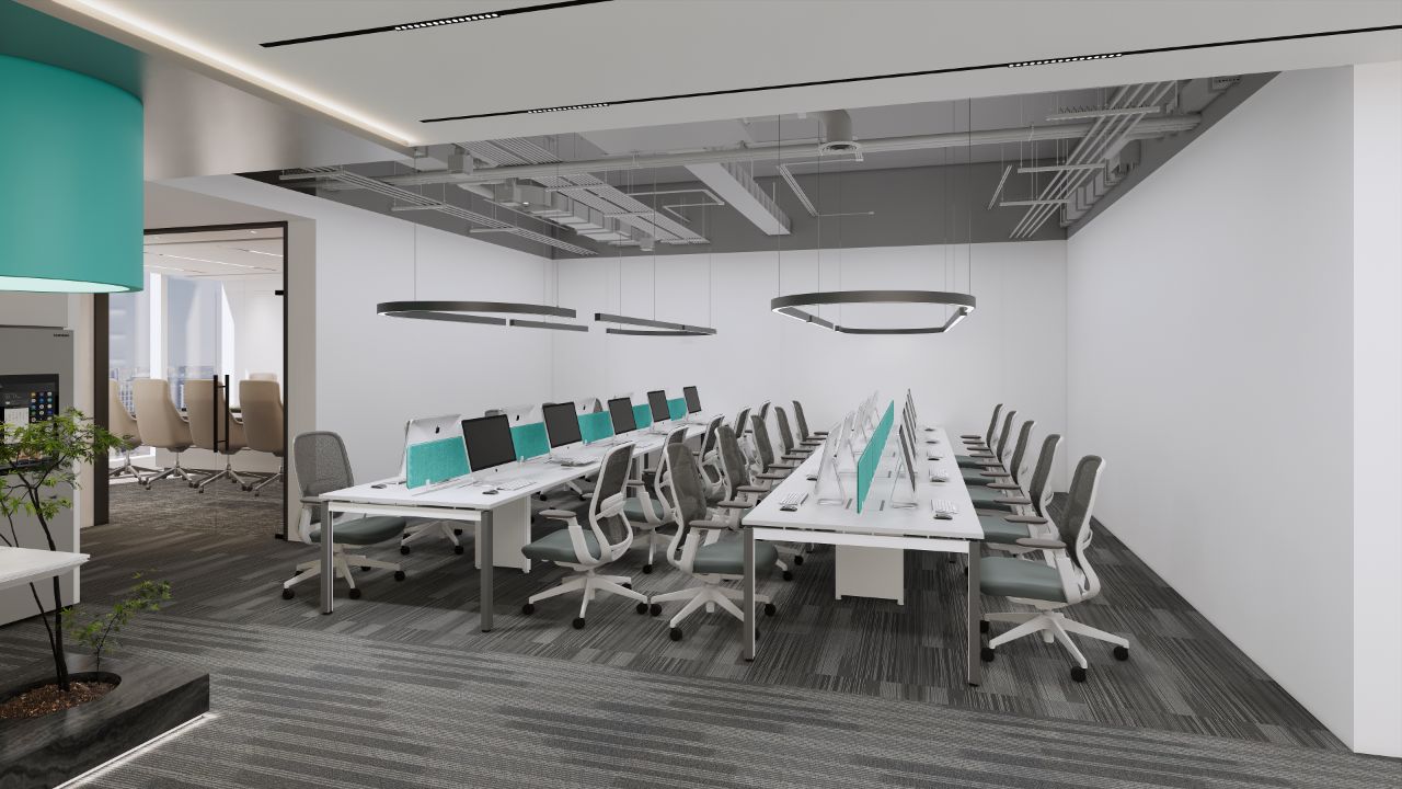 这个项目最好玩的就是各个不同主题的会议室设计。在接待前厅弧型墙的背面,设计师利用其和员工区所剩下的一点不规则区域,规划出了4间小巧,酷炫灰和孔雀绿主题色彩的小型面试间、会议室。另外在大培训区外有一个头脑风暴款的STAND UP会议室。在管理区域,还有一个汽车主题的汇报型会议室,采用了某豪车品牌的后排老板座位做会议室家具。