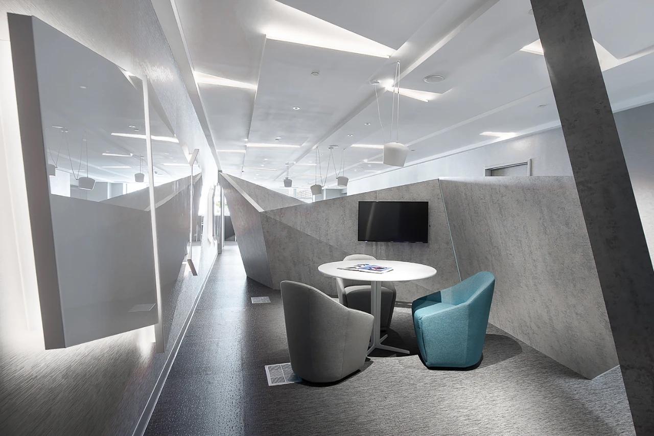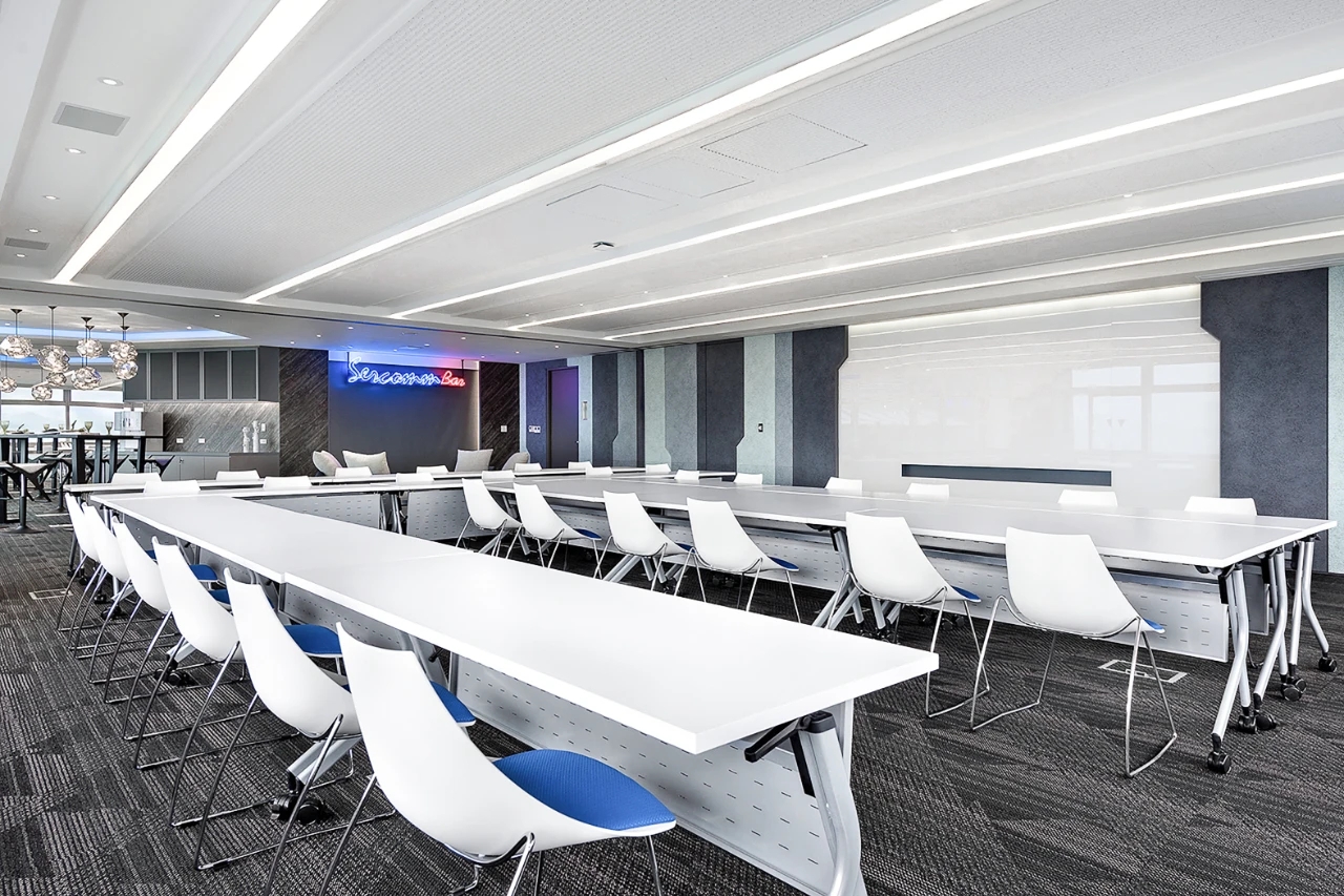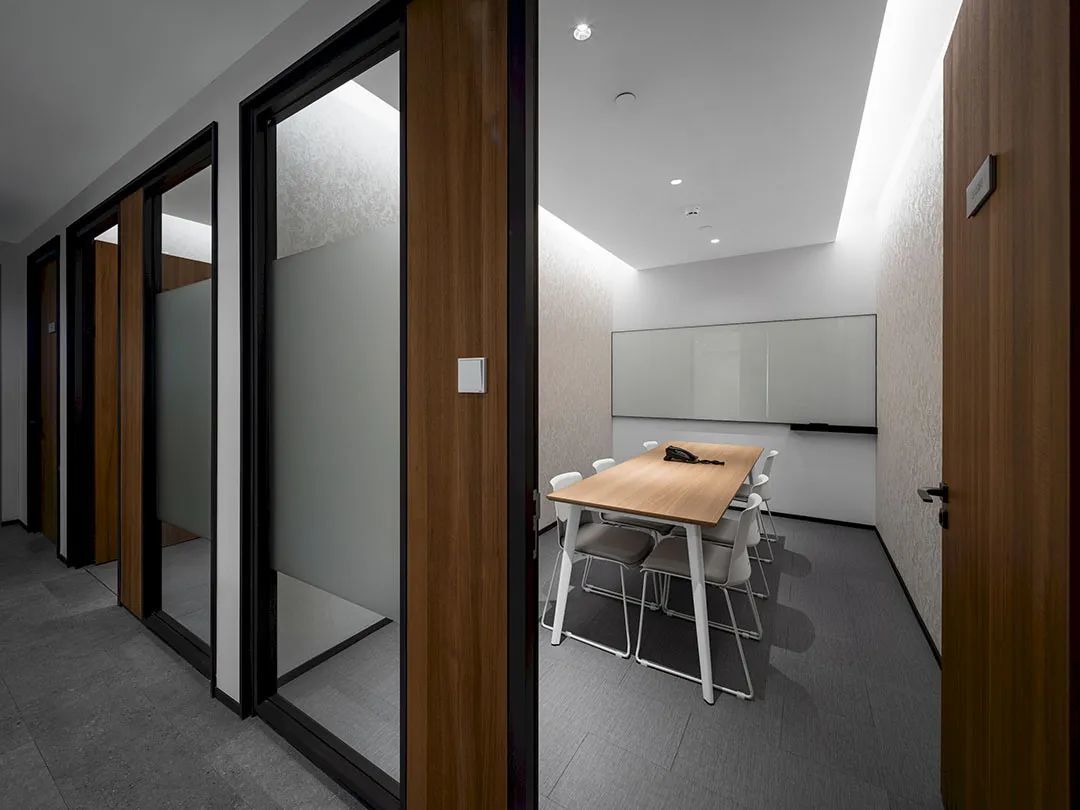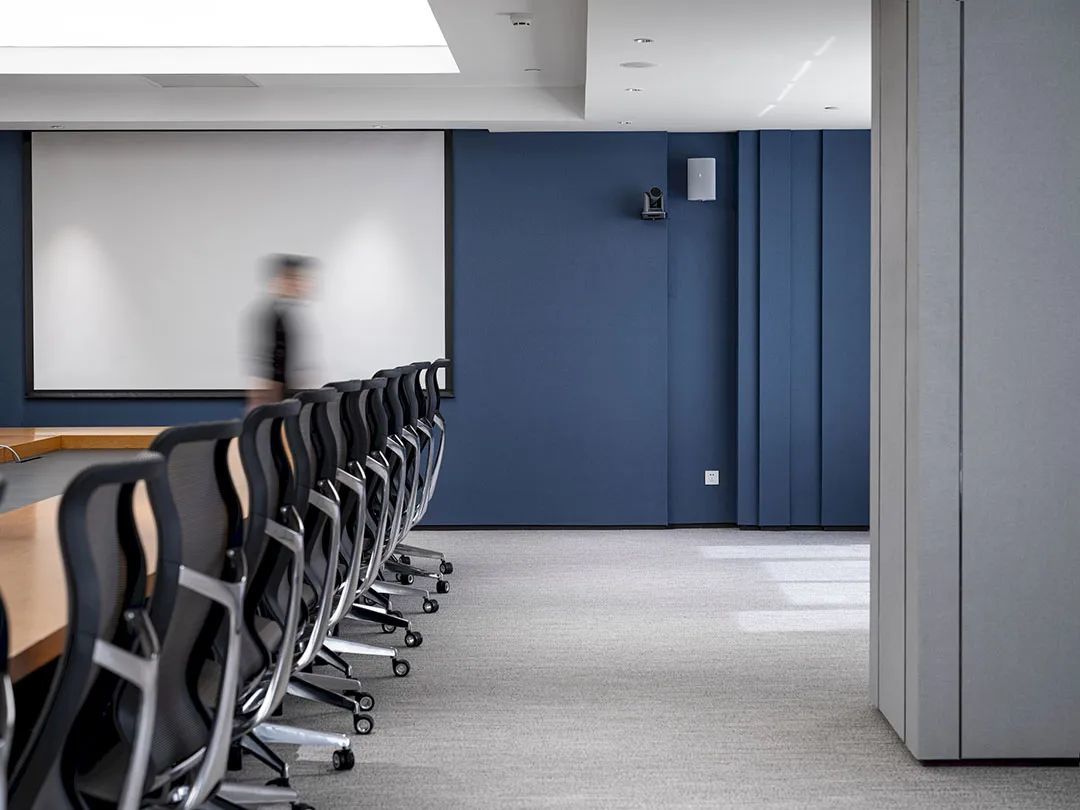 培训室墙面则采用吸音材料毛毡以极佳的降噪效果将办公空间的舒适体验达到平衡与统一侧面视窗打破常规布局更显环境通透