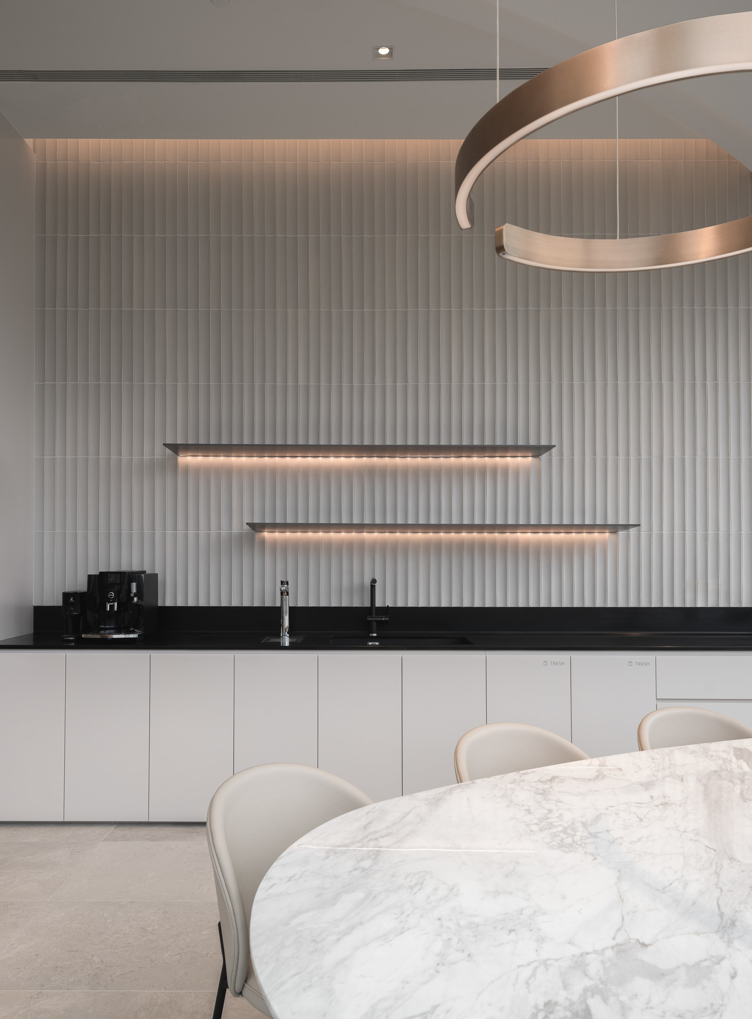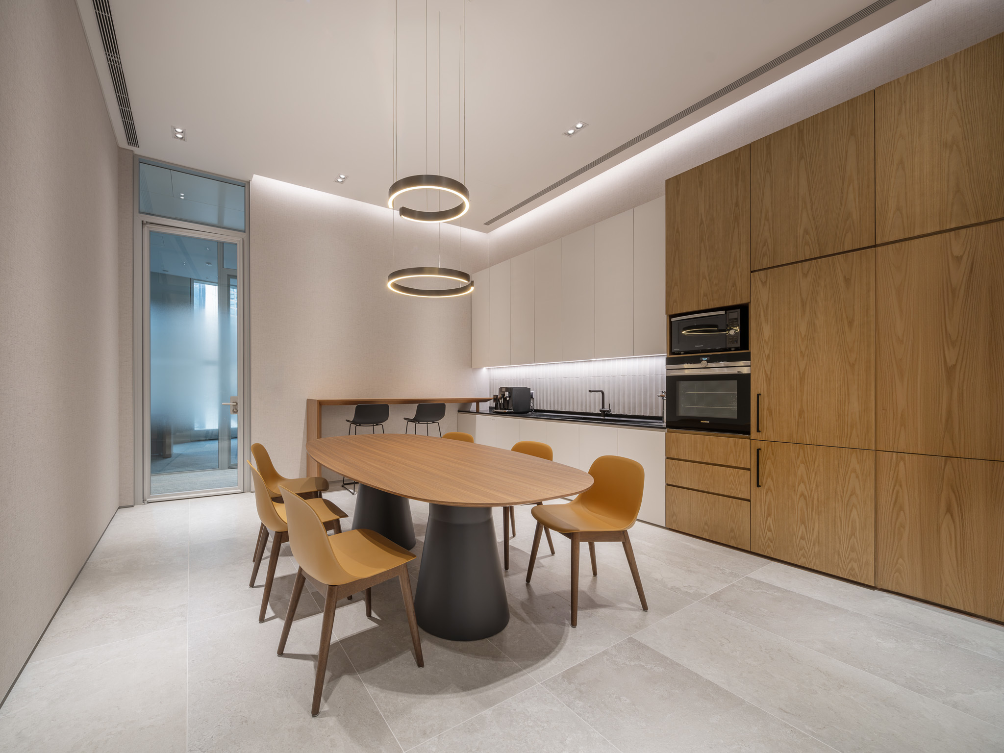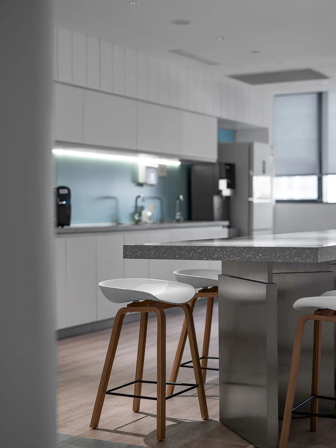 2F灰白配色更显空间通透中岛吧台设计搭配活动家具使得空间更灵活多样茶歇烘焙皆宜,高效灵活转换侧面大视窗自然引入吊装企业标语装置展现企业愿景