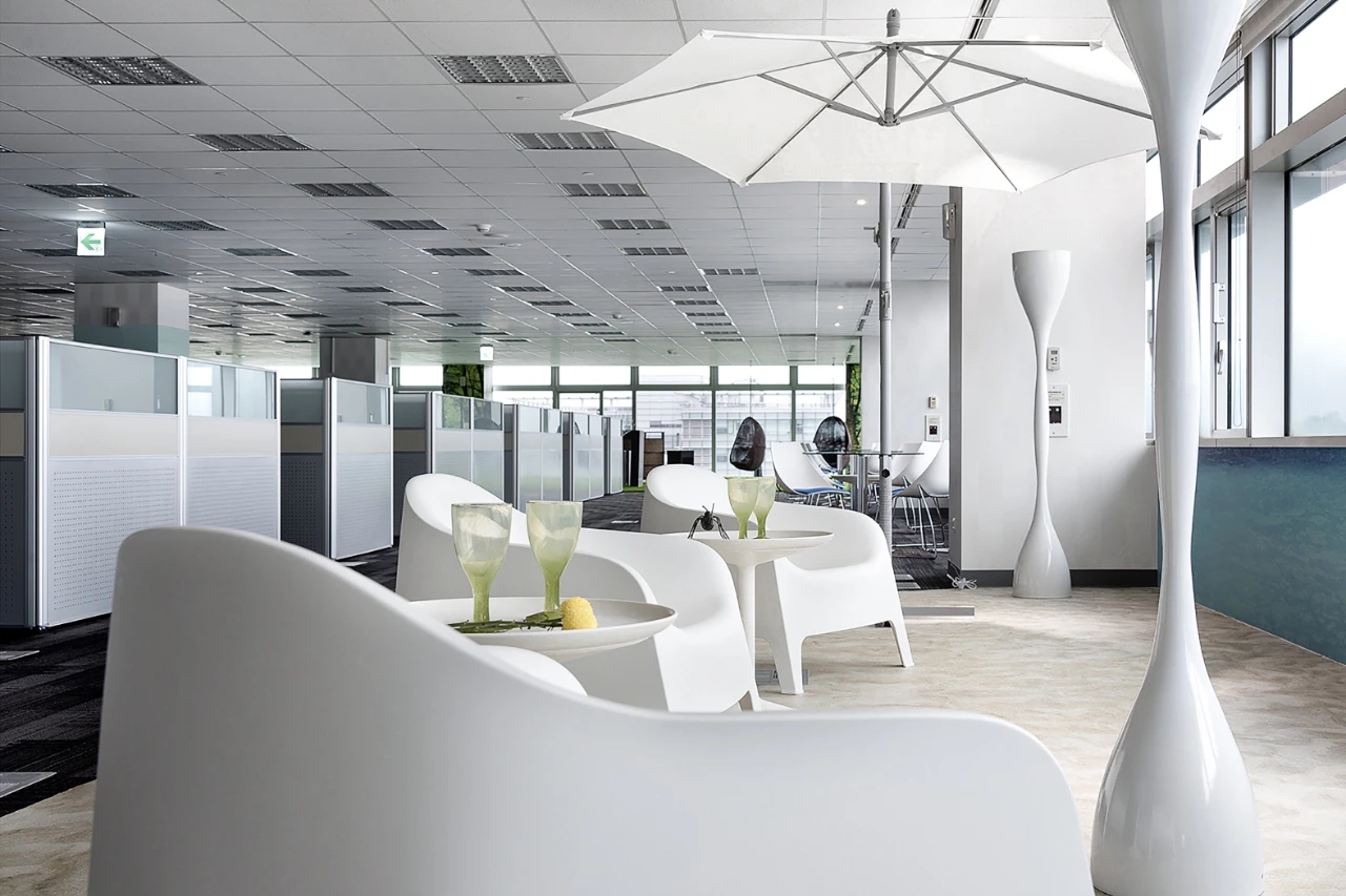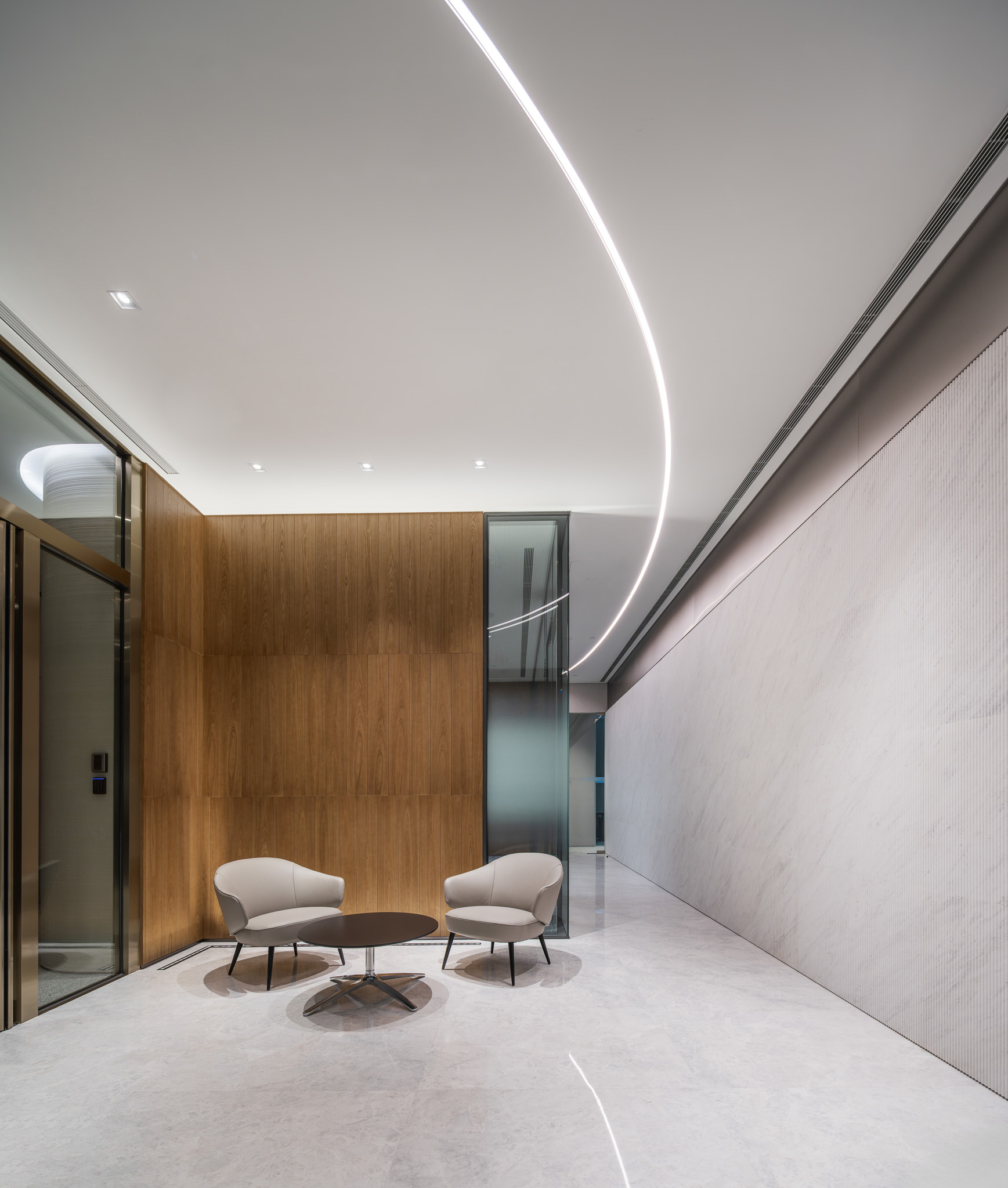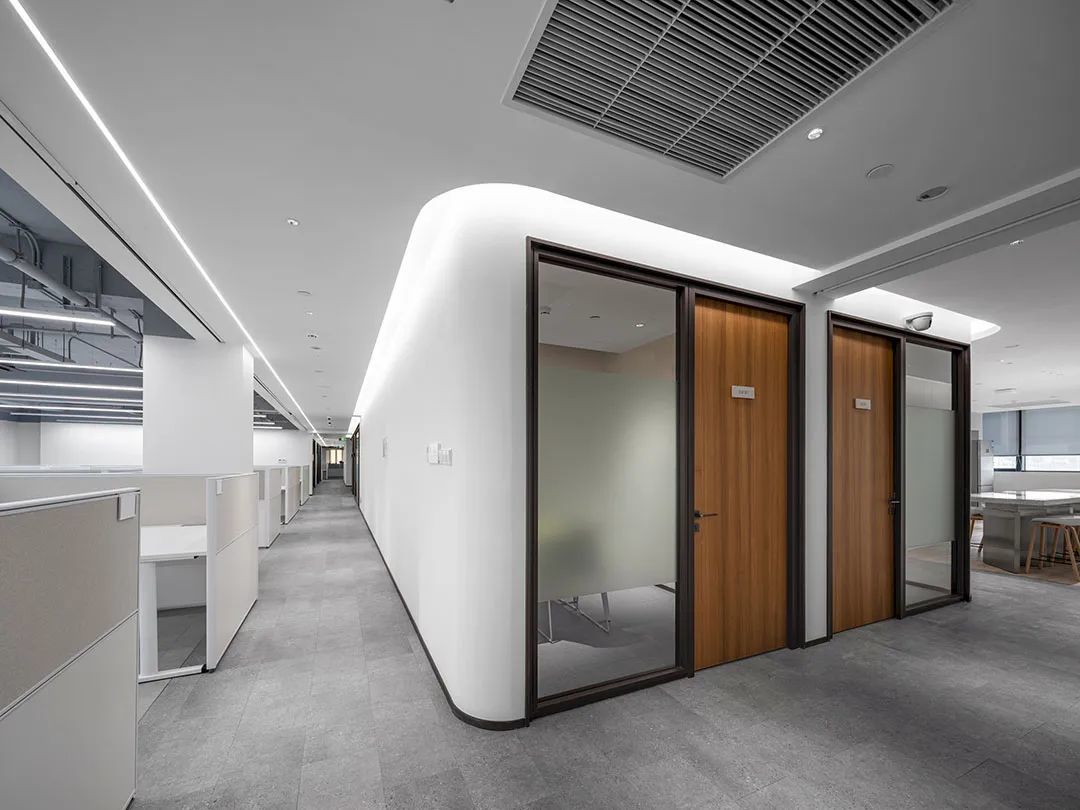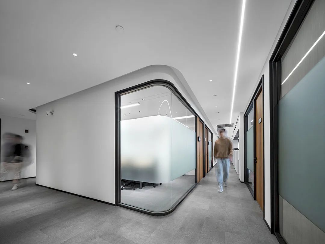 3F大会议室采用弧形玻璃隔断创新设计打破封闭,营造通透宽敞氛围其独特弧形元素增添视觉层次与动态美感尽显现代办公新风尚