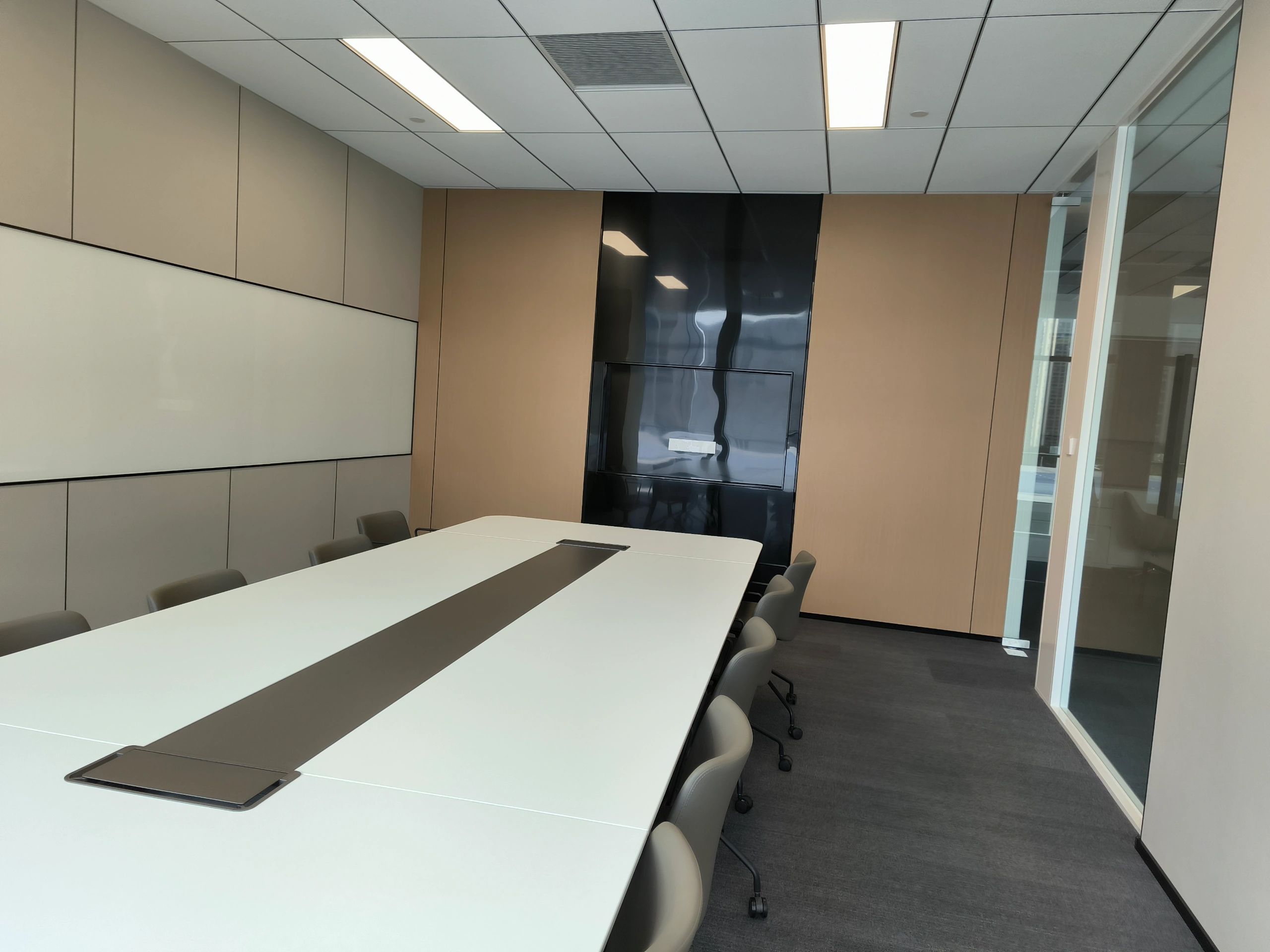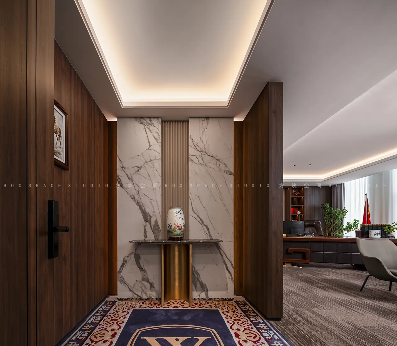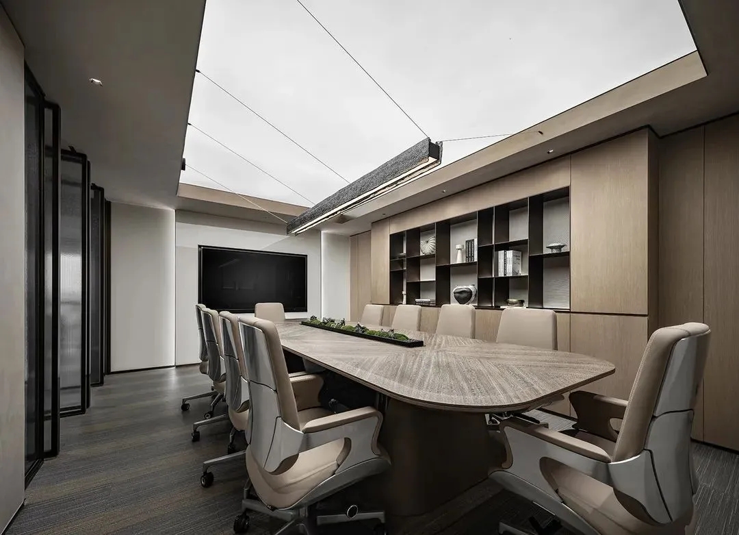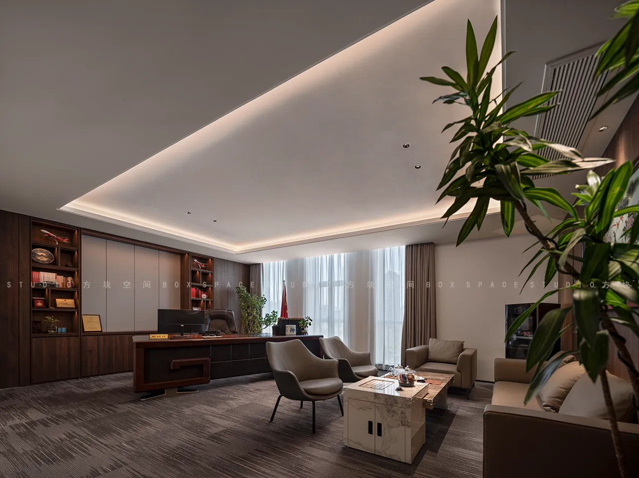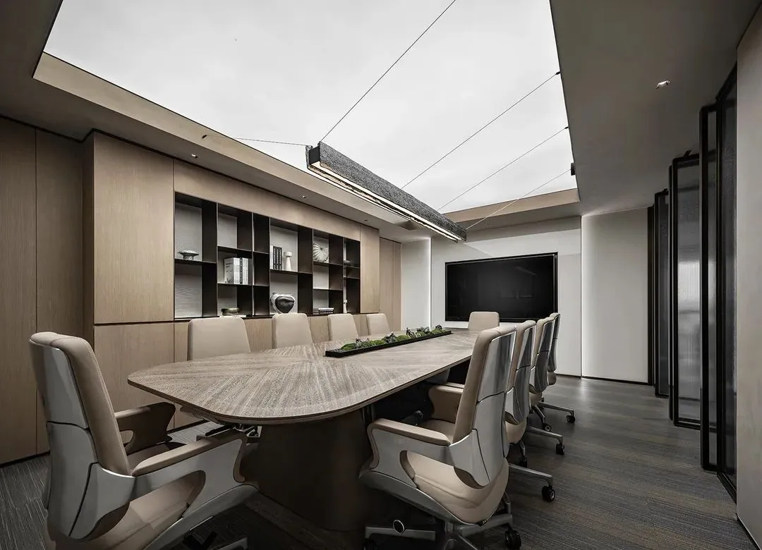 会议室内部采用了高品质的会议桌和舒适的会议椅,配备了智能化的会议设备,如投影仪、智能音响等。 总经理室作为公司决策的核心区域,其设计装修自然体现了尊贵与权威的象征。室内装饰以简约大气为主,运用高级材料和精致工艺,营造出一种低调的奢华感。