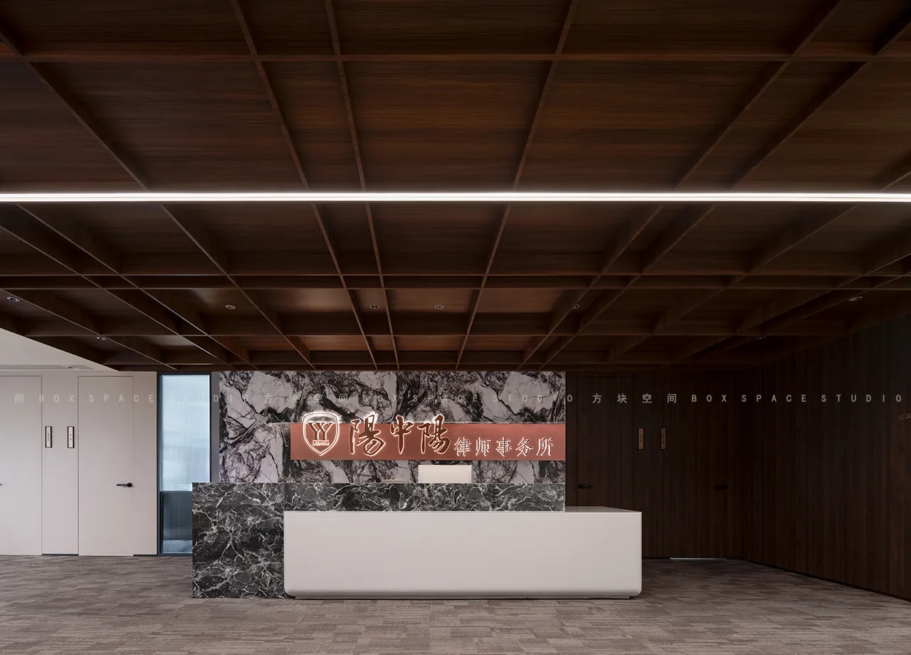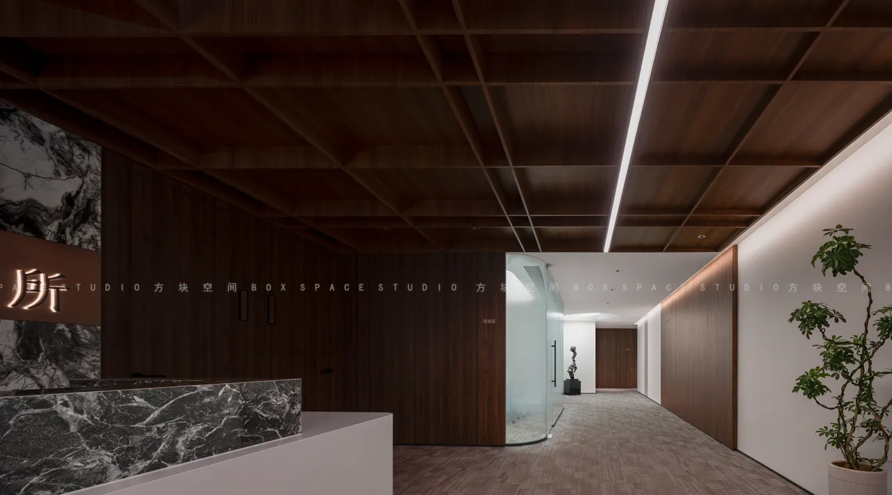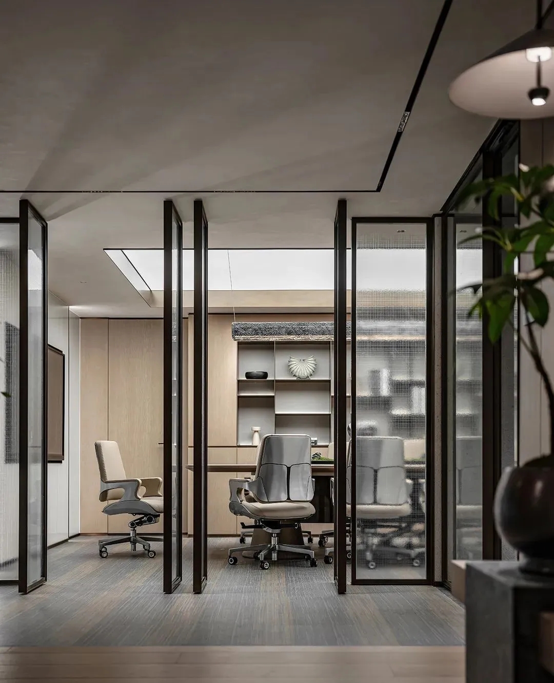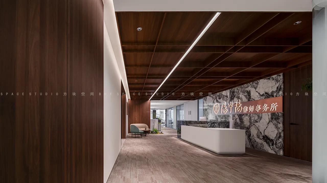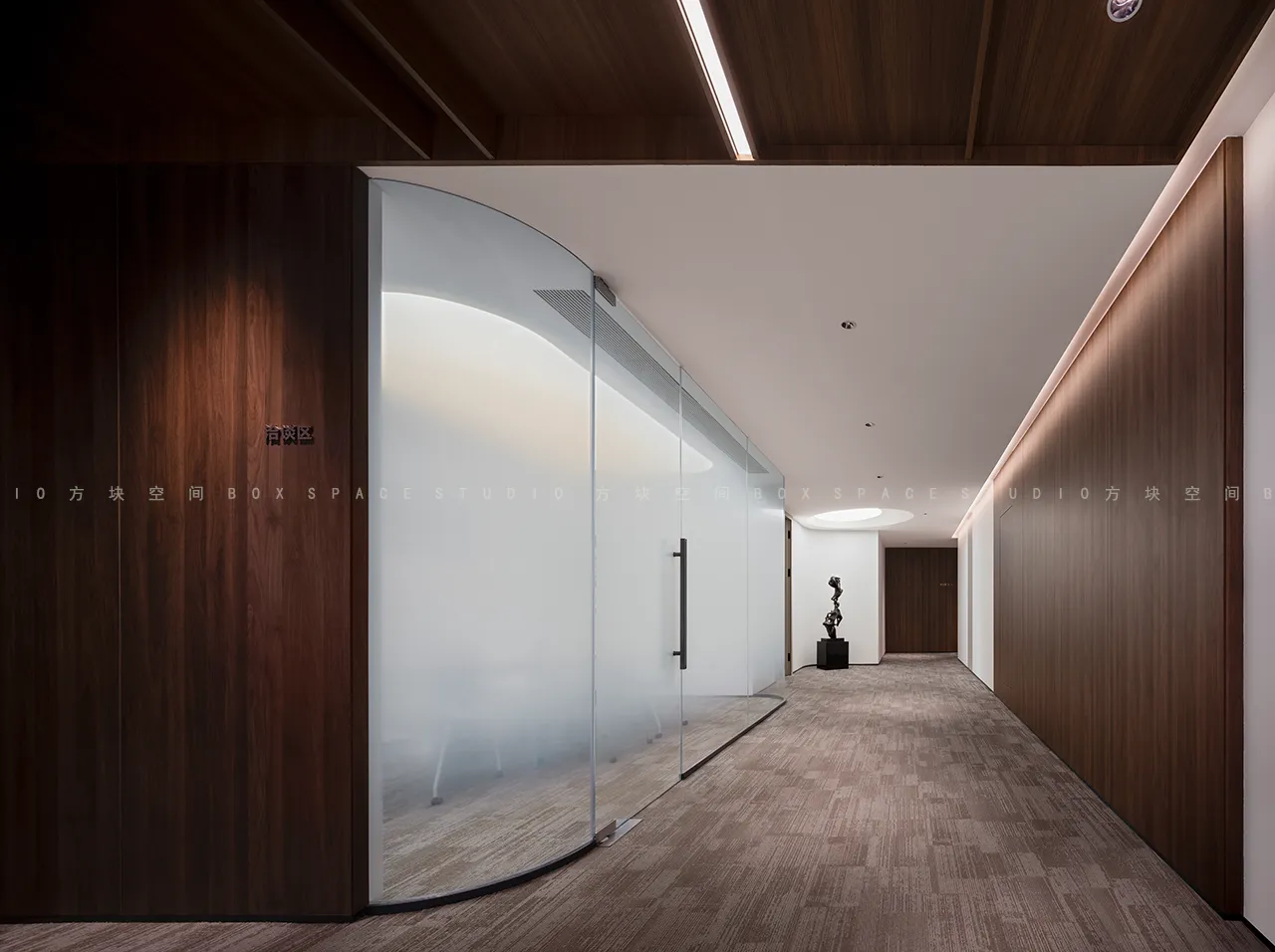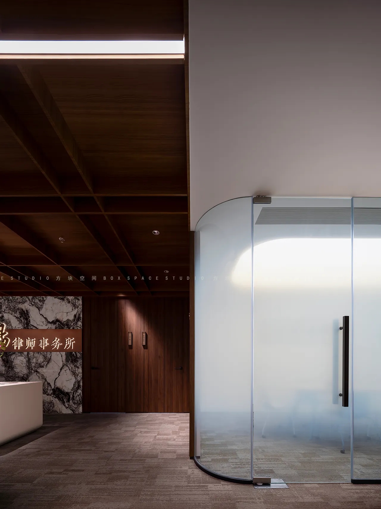 将洽谈区放在了接待区一侧,访客可以从容的坐下喝一杯热茶,在舒适且不被打扰的环境中,静心等待接下来的沟通洽谈。步入办公区,公共办公区、会议室、独立办公室逐一进入视野中,不同的材质融入于空间中,深与浅之间对比与碰撞,丰富了画面的质感,同时也实现了形式与功能的平衡。秩序、沉稳、平衡是办公区的设计关键词,去除了一切不必要的装饰,线型灯的留白式处理手法,勾勒出现代极简的空间框架,与律师事务所的简练、利落的形象相契合。