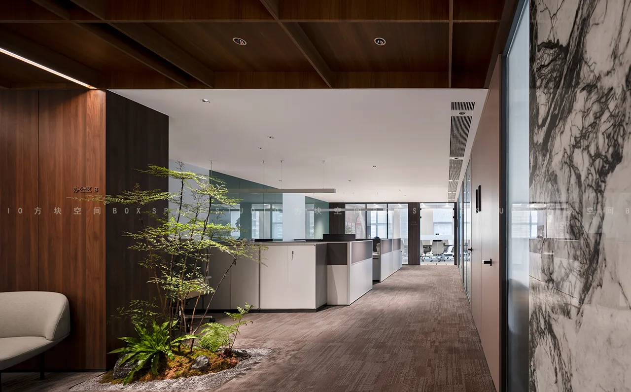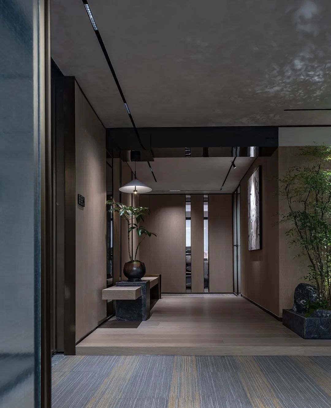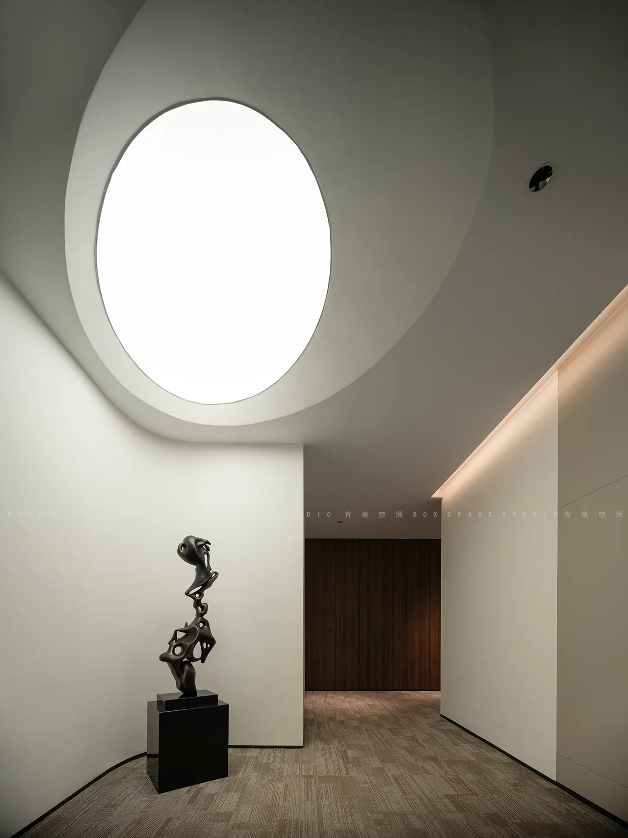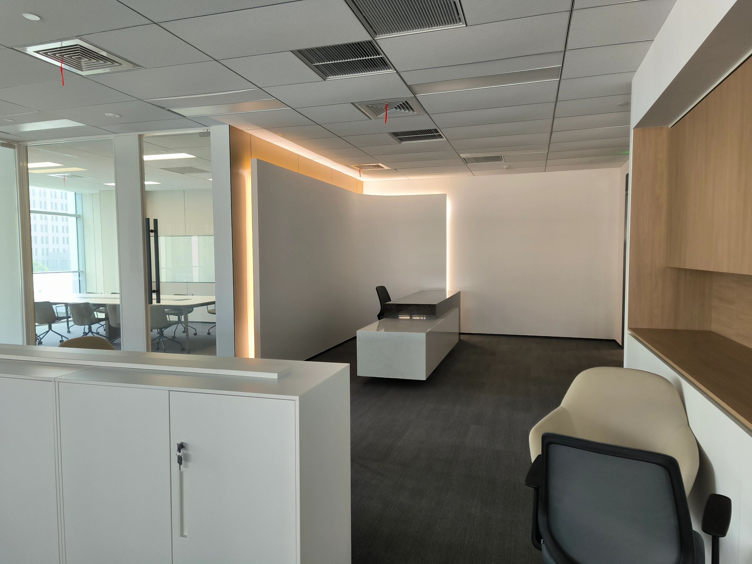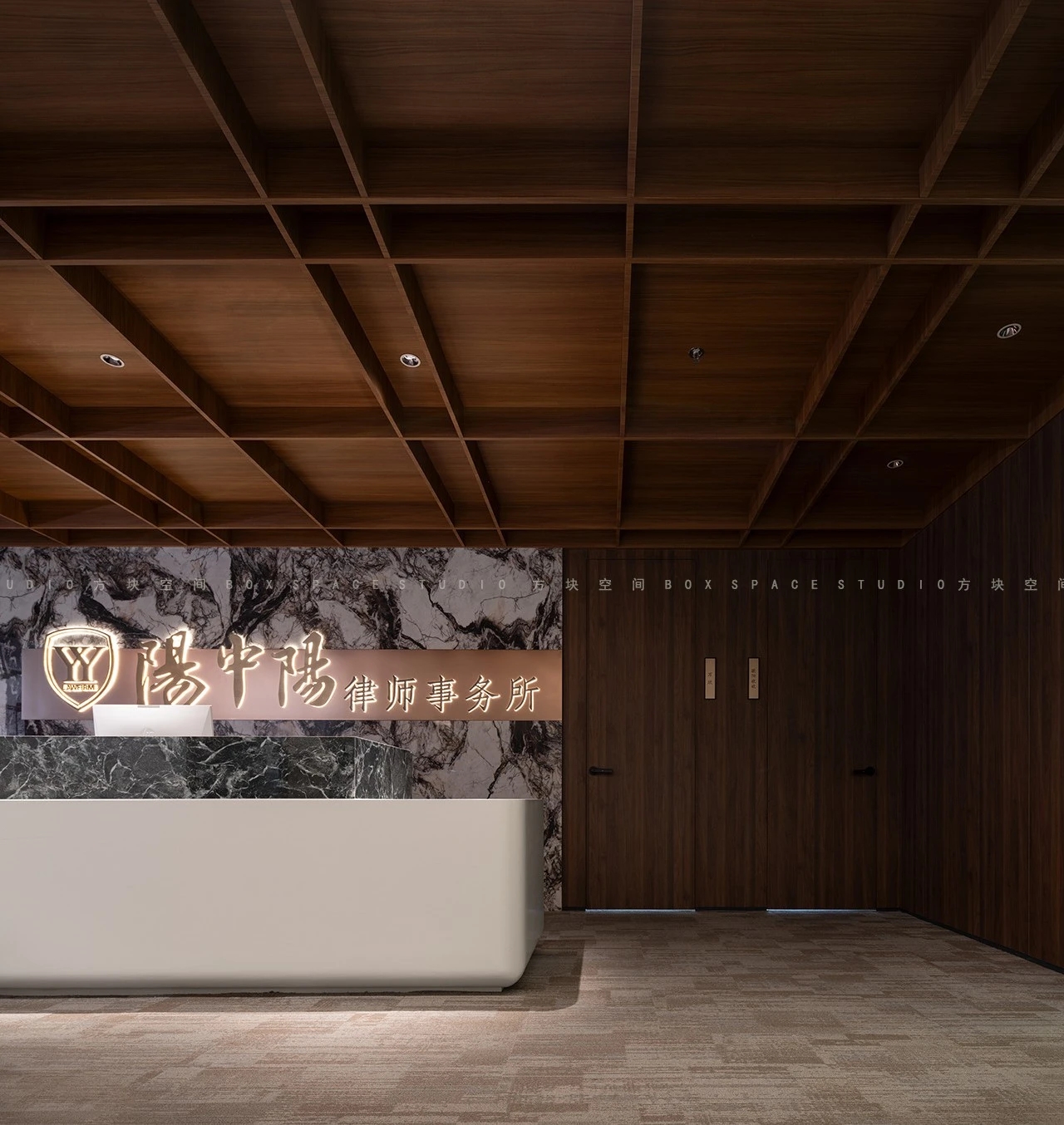 将洽谈区放在了接待区一侧,访客可以从容的坐下喝一杯热茶,在舒适且不被打扰的环境中,静心等待接下来的沟通洽谈。步入办公区,公共办公区、会议室、独立办公室逐一进入视野中,不同的材质融入于空间中,深与浅之间对比与碰撞,丰富了画面的质感,同时也实现了形式与功能的平衡。秩序、沉稳、平衡是办公区的设计关键词,去除了一切不必要的装饰,线型灯的留白式处理手法,勾勒出现代极简的空间框架,与律师事务所的简练、利落的形象相契合。