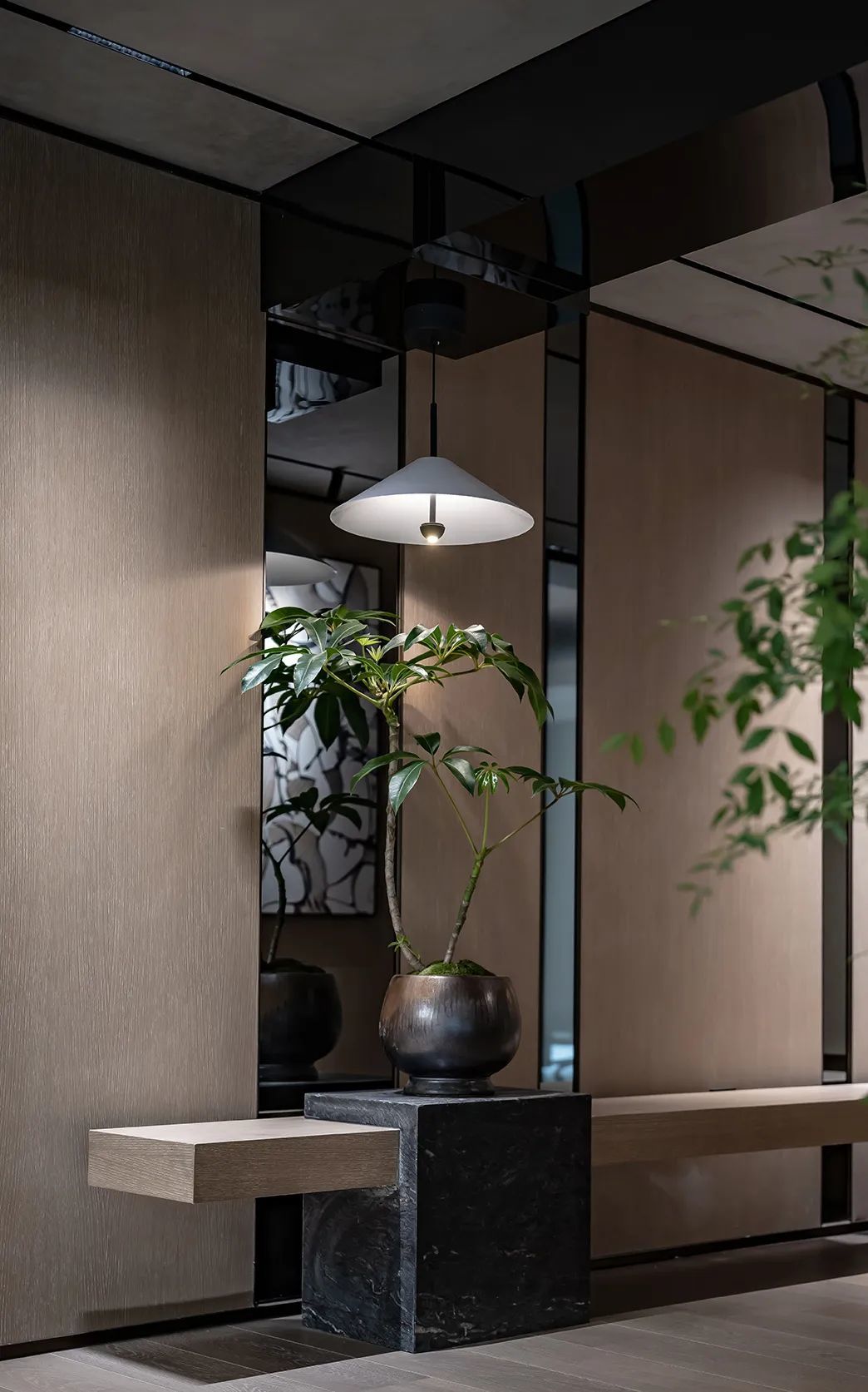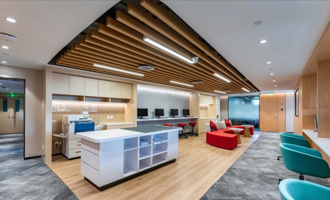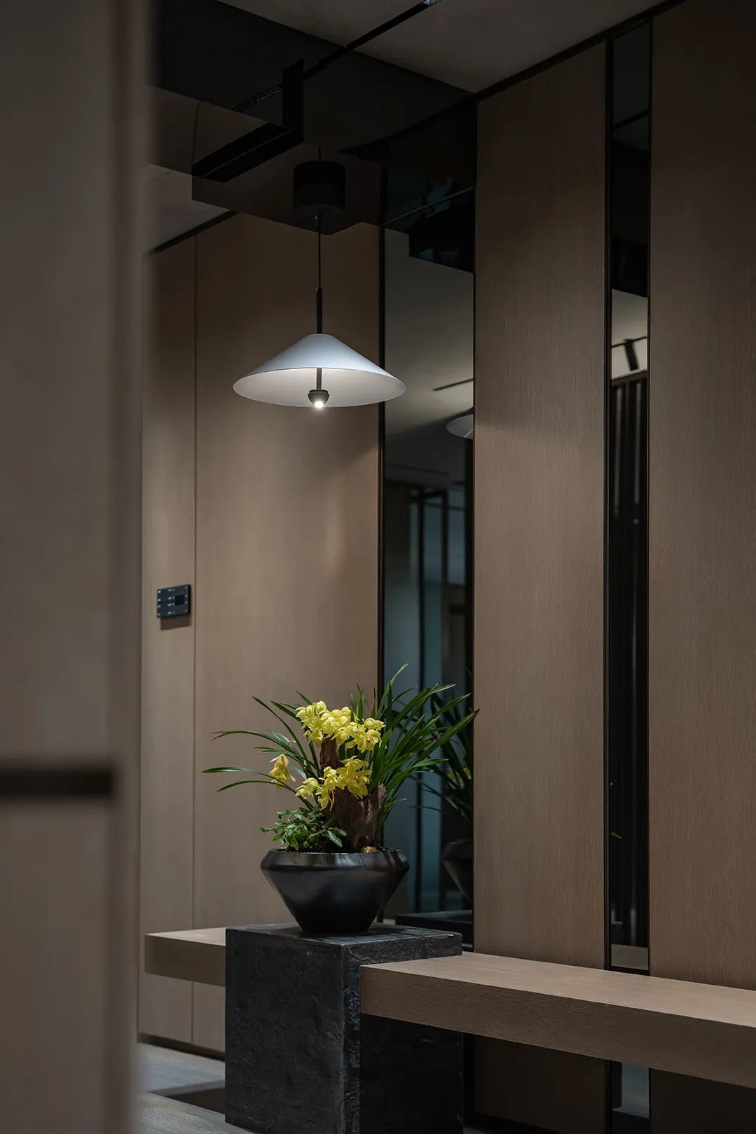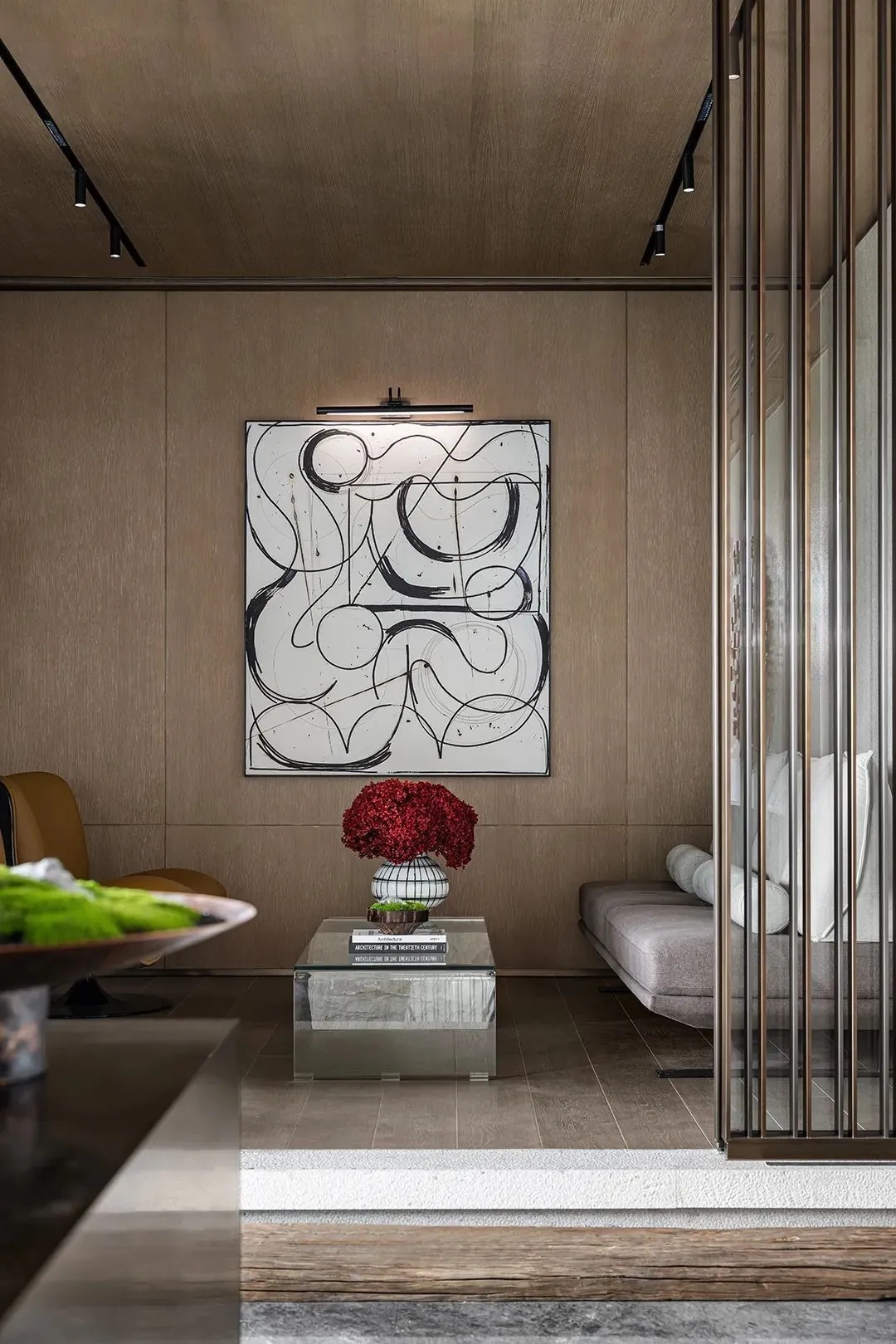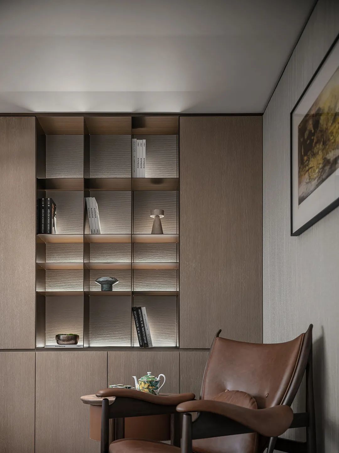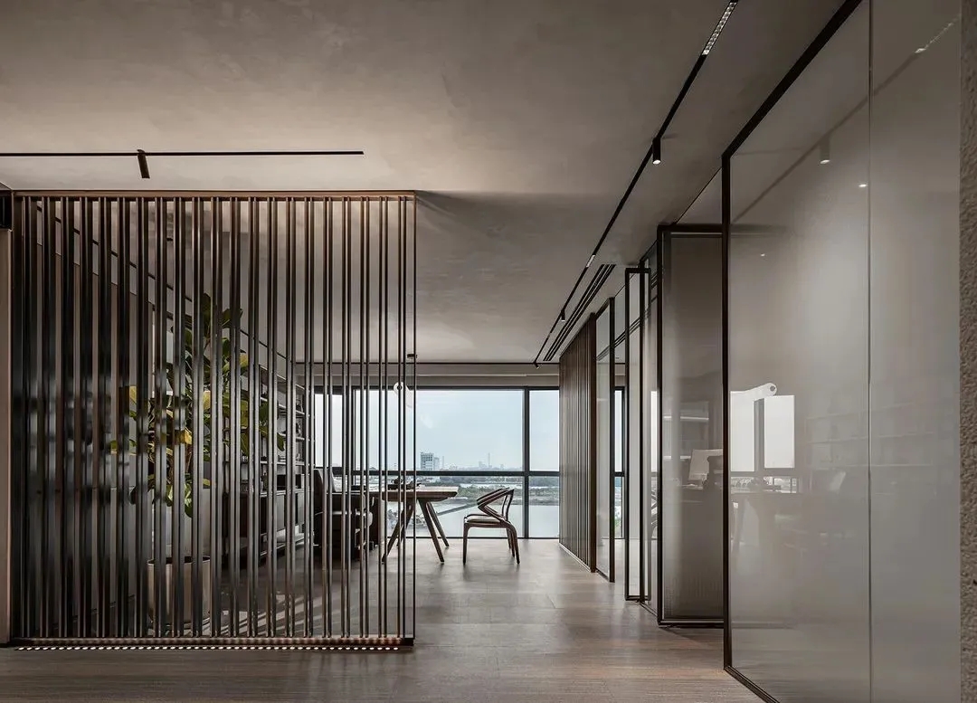 将洽谈区放在了接待区一侧,访客可以从容的坐下喝一杯热茶,在舒适且不被打扰的环境中,静心等待接下来的沟通洽谈。步入办公区,公共办公区、会议室、独立办公室逐一进入视野中,不同的材质融入于空间中,深与浅之间对比与碰撞,丰富了画面的质感,同时也实现了形式与功能的平衡。秩序、沉稳、平衡是办公区的设计关键词,去除了一切不必要的装饰,线型灯的留白式处理手法,勾勒出现代极简的空间框架,与律师事务所的简练、利落的形象相契合。