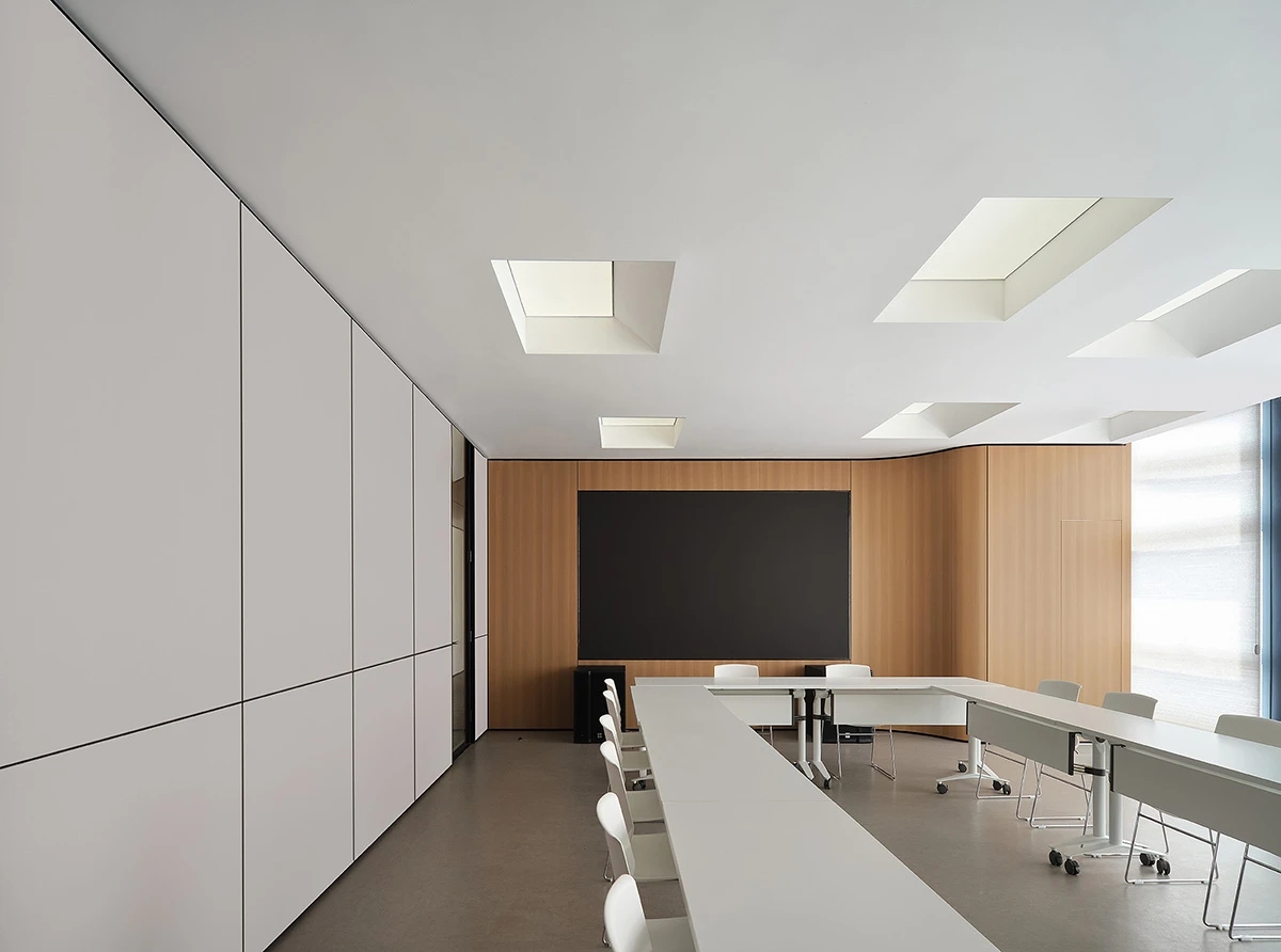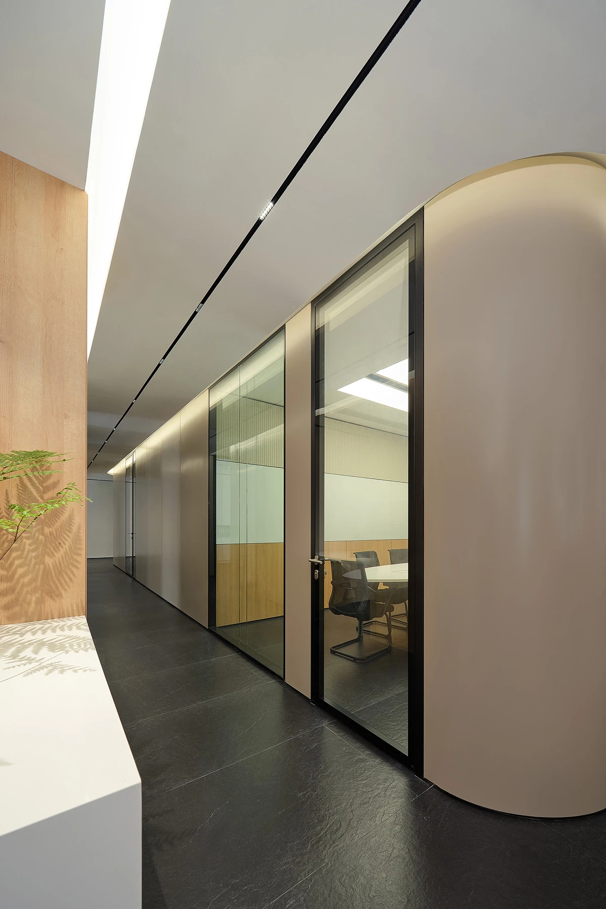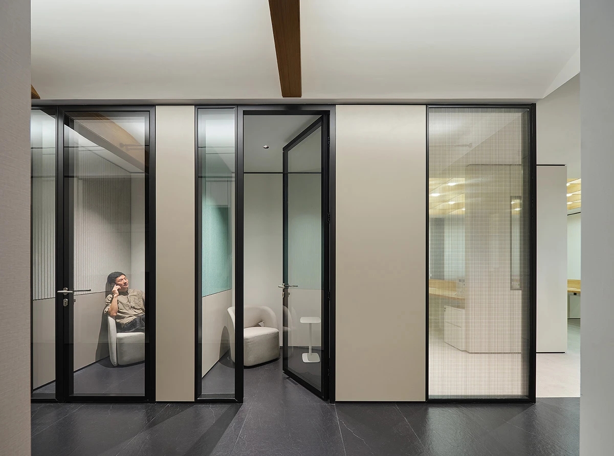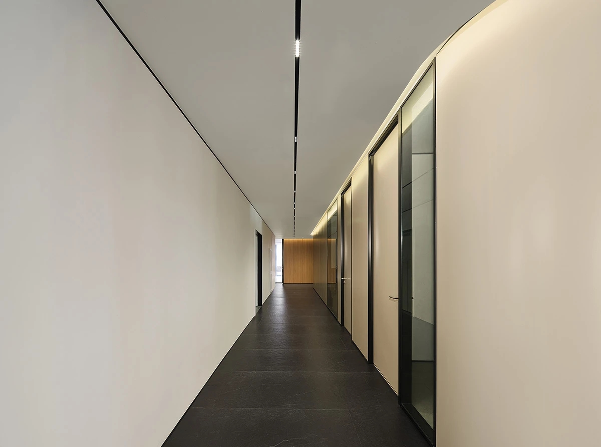 对办公空间进行重新定义,潜心探索设计的无限可能性,用前卫的想法将过去传统的办公需求与未来现代相结合,不断碰撞后产生新的极富生命力的办公空间。在此空间中,对空间进行重构,打破传统大堂使用的局限性,将大堂,前台以及洽谈区结合,开放式空间的设计最大化的利用了空间,兼具功能与美观性,开阔明亮,塑造一种灵动之感。旋转隔断的应用,打破了固有空间的局限性,动静结合,曲线与直线,方形与圆形的交响呼应,营造空间氛围的同时,给空间创造了更多的延展和可能性。通过对材料语言和空间形态的精简,打造一个”简洁,透明化,动静结合”的复合型空间!