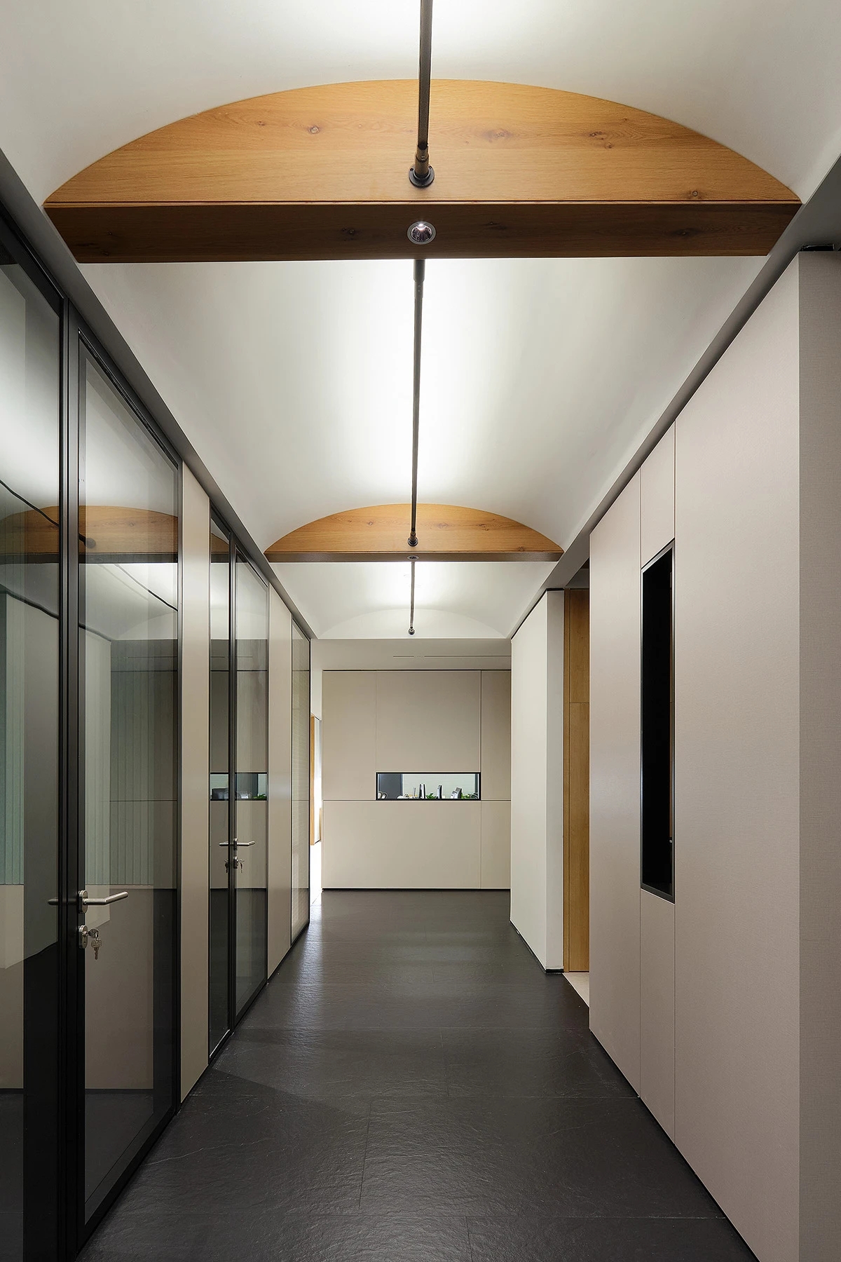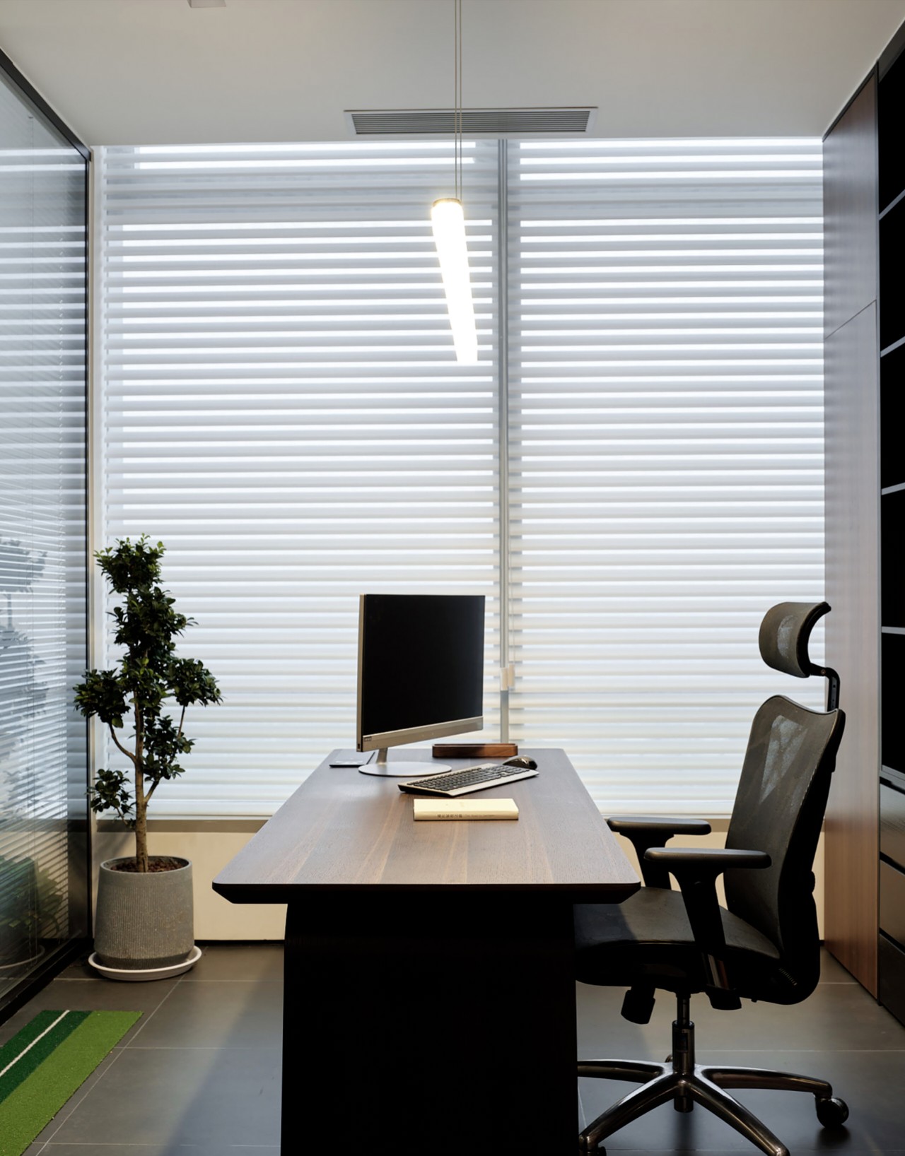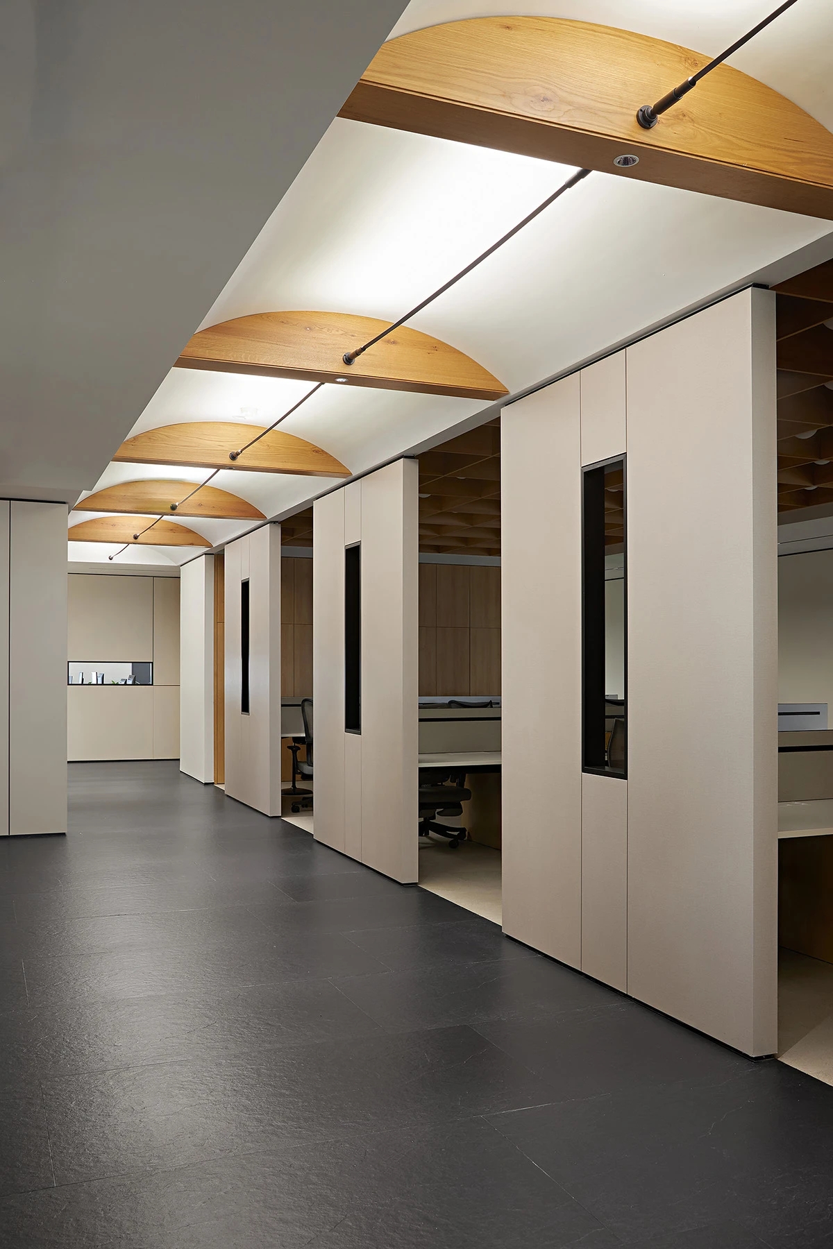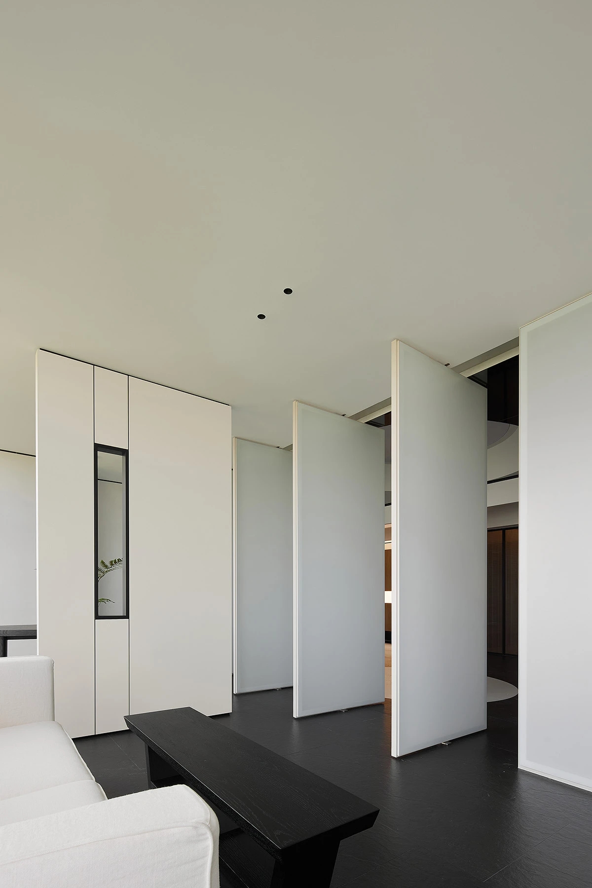对办公空间进行重新定义,潜心探索设计的无限可能性,用前卫的想法将过去传统的办公需求与未来现代相结合,不断碰撞后产生新的极富生命力的办公空间。在此空间中,对空间进行重构,打破传统大堂使用的局限性,将大堂,前台以及洽谈区结合,开放式空间的设计最大化的利用了空间,兼具功能与美观性,开阔明亮,塑造一种灵动之感。旋转隔断的应用,打破了固有空间的局限性,动静结合,曲线与直线,方形与圆形的交响呼应,营造空间氛围的同时,给空间创造了更多的延展和可能性。通过对材料语言和空间形态的精简,打造一个”简洁,透明化,动静结合”的复合型空间!