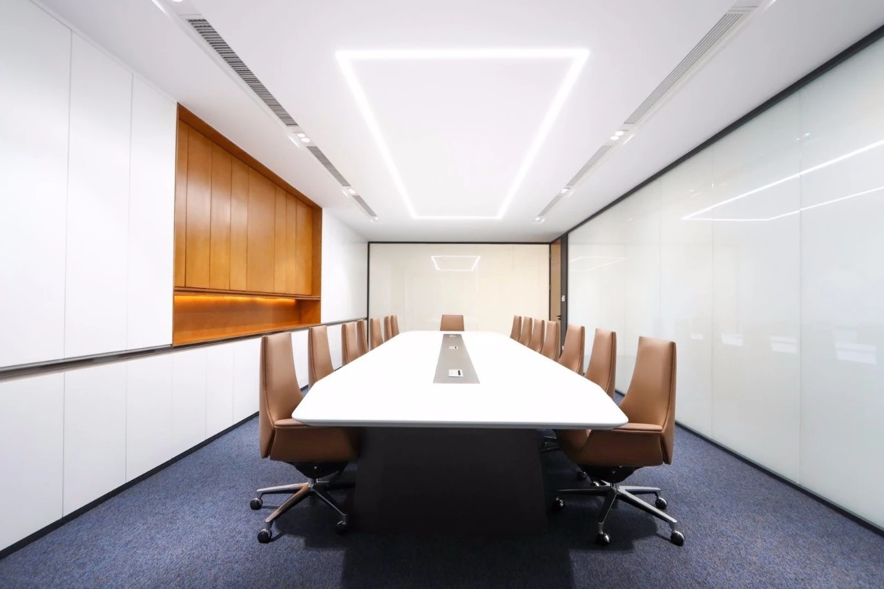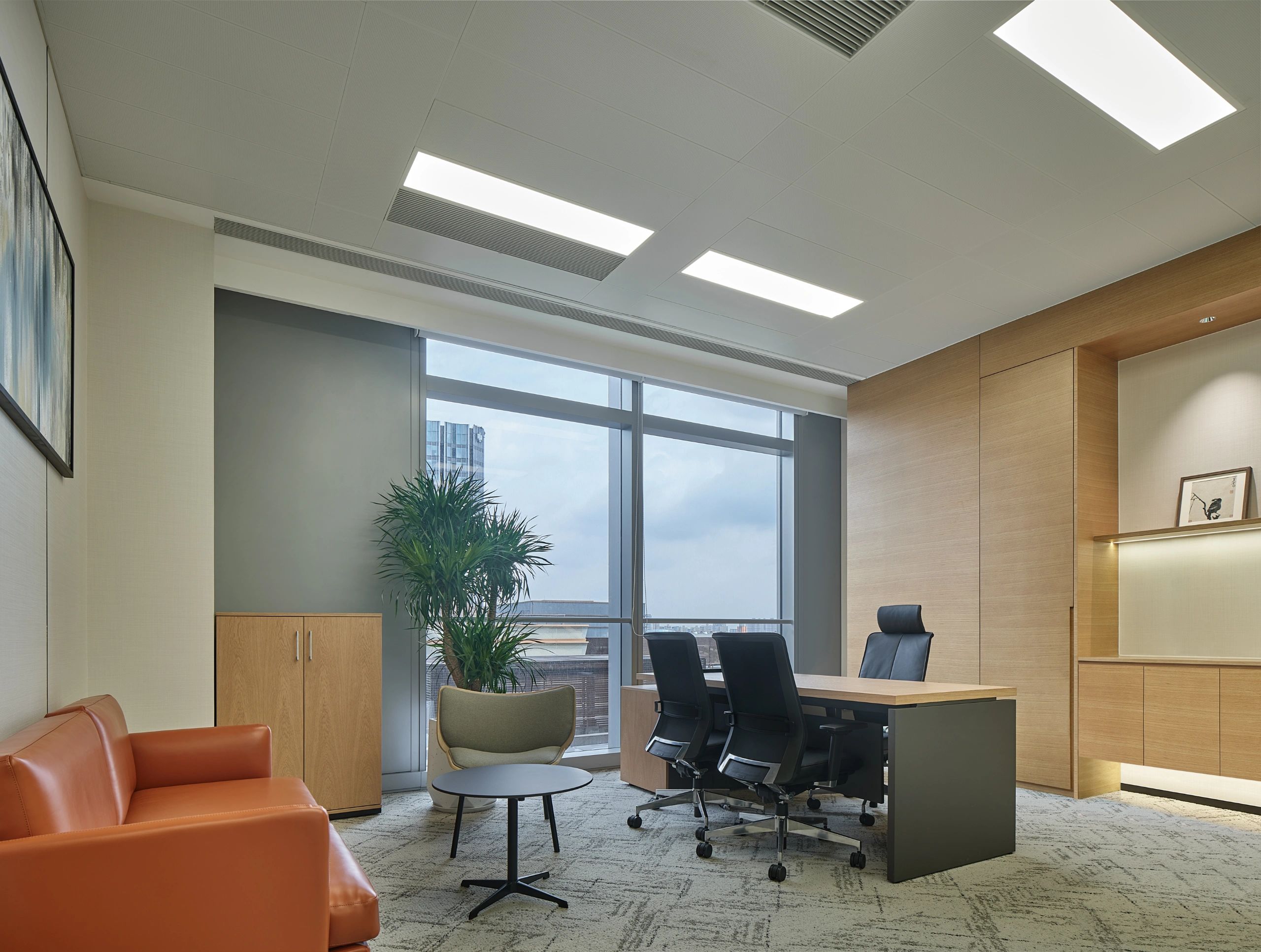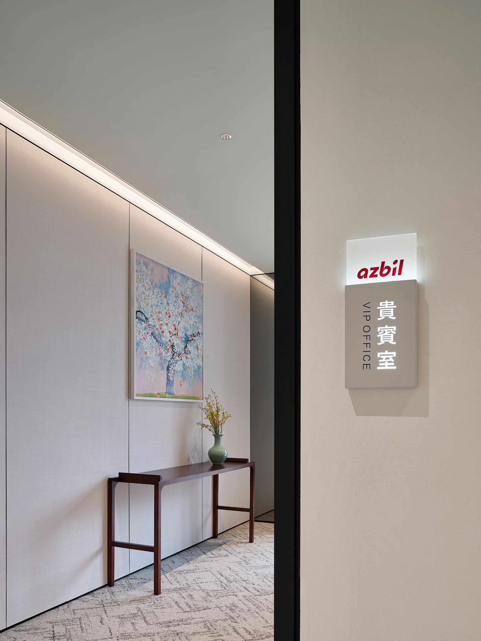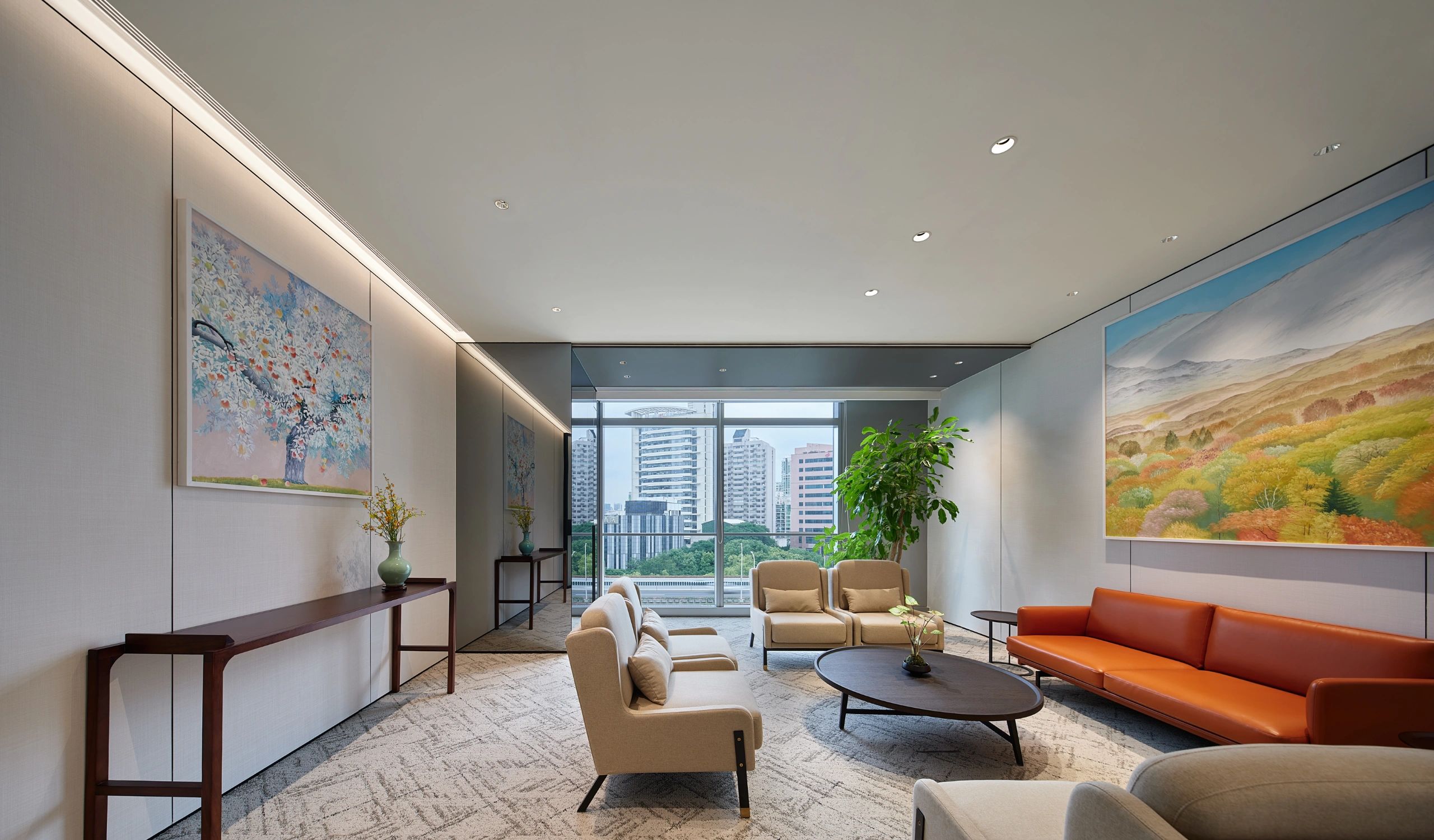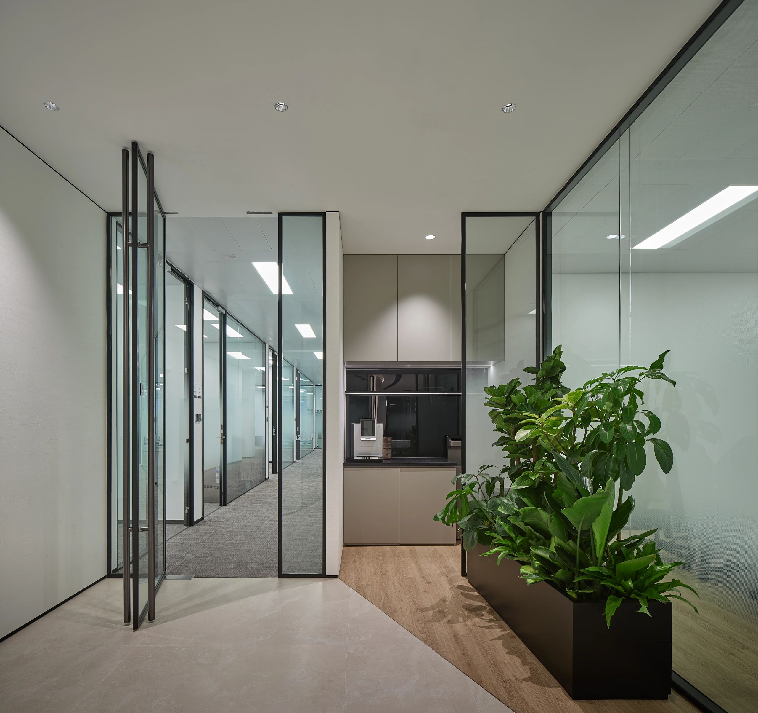 通透空间透明材质营造空间的通透感隔而不断,移步换景。考虑到使用的便利性办公室与展厅的多重变奏空间既要独立而连贯又互不干扰随着办公空间向公司高层管理区域的延伸家具及空间用色渐趋沉稳自然而然的区分了办公空间的性质使整个空间无论从功能性质还是色彩上都层次分明