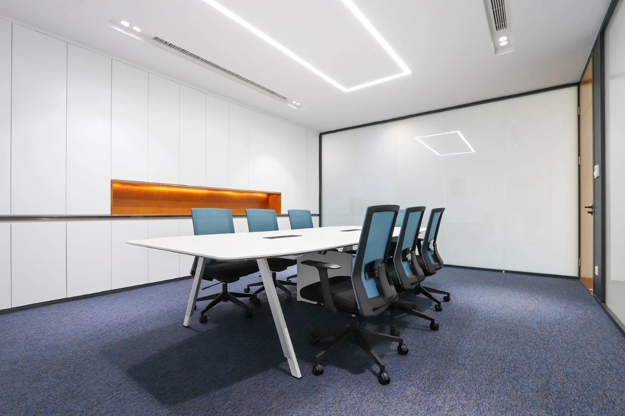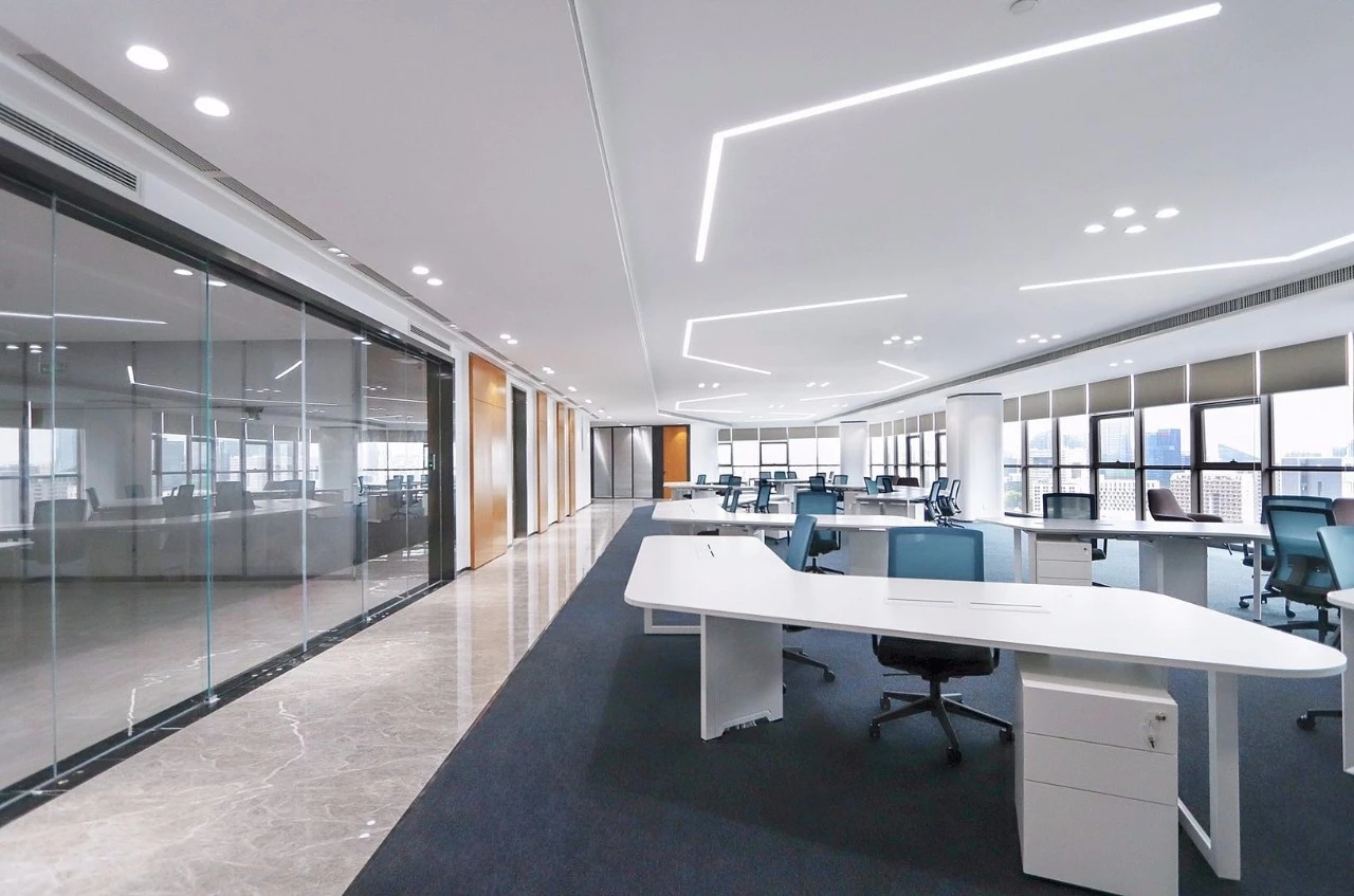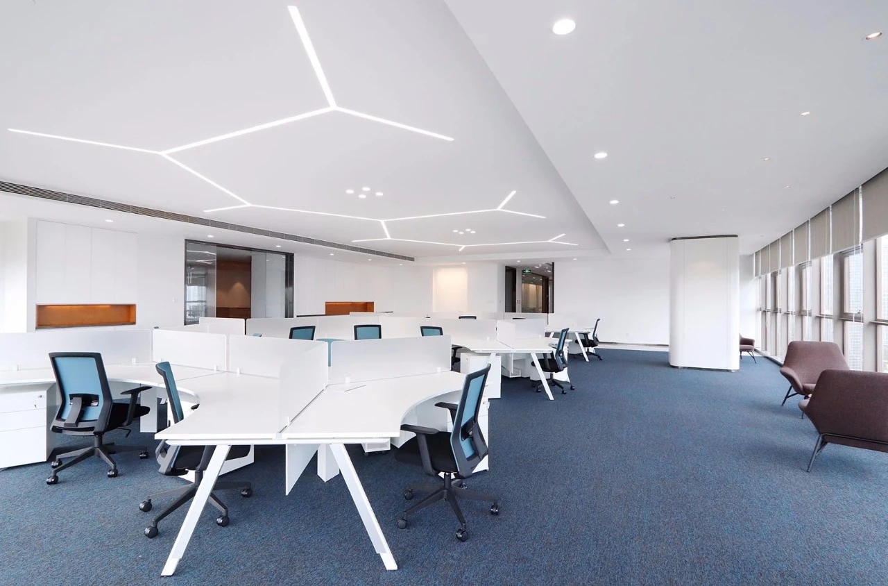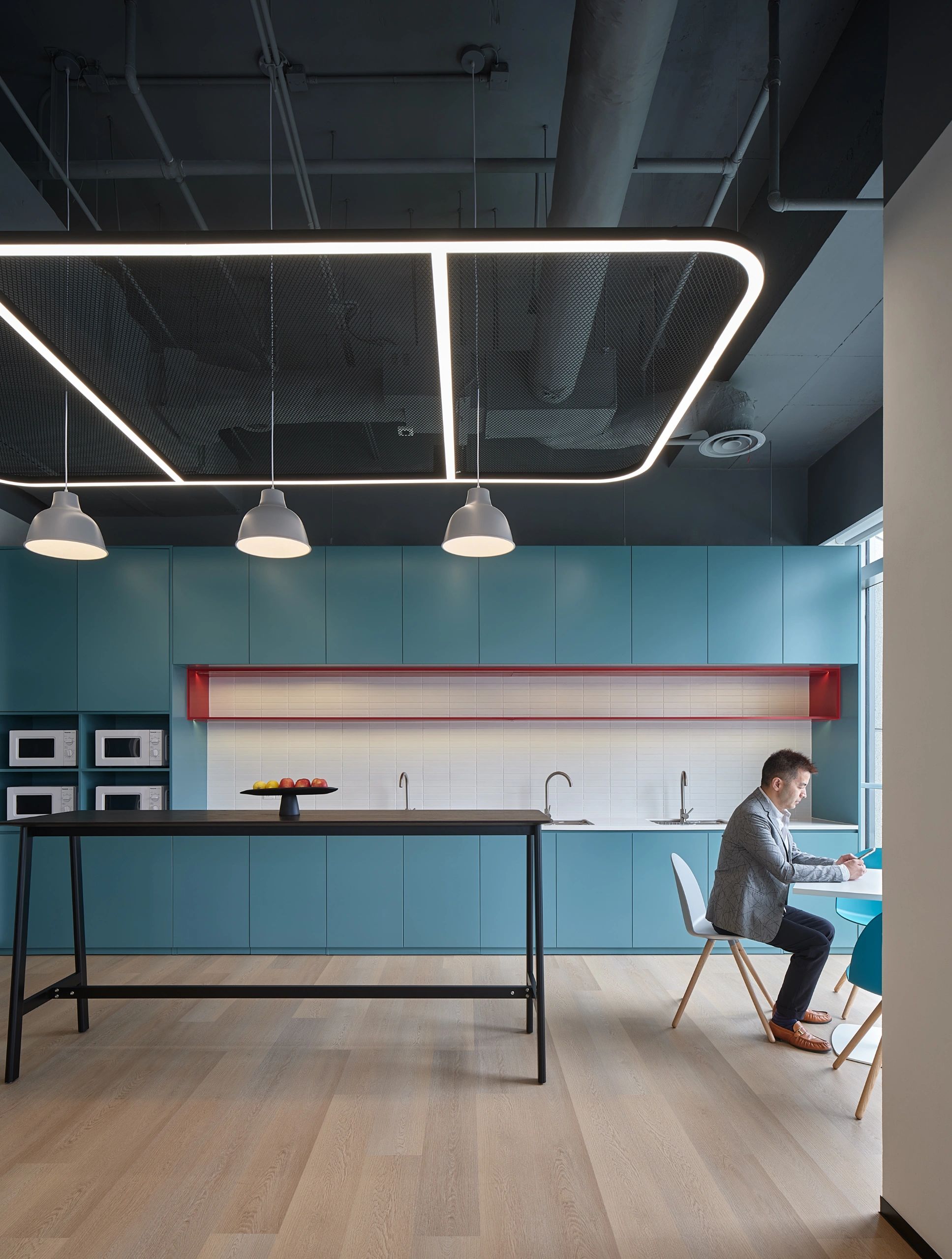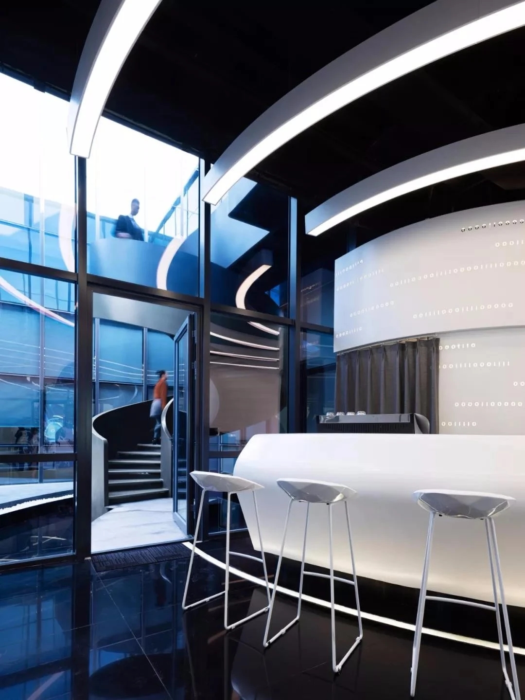 办公区在采光方面加强了绿色环保的自然光的利用人工照明也尽量柔和不刺眼目照明光线是通过吊顶、搁板、墙面的反射或折射光除了一些玻璃与顶面灯带之间的虚幻结合本案大量使用白色面,大大地提升了空间感为了符合高科技的设计理念卡位也是特意选了不规则切割式都是为了给人一种直观的体验感,科技未来,简洁明快整屋色彩统一,蓝色与白色很好地结合在一起为整体空间带来明亮感