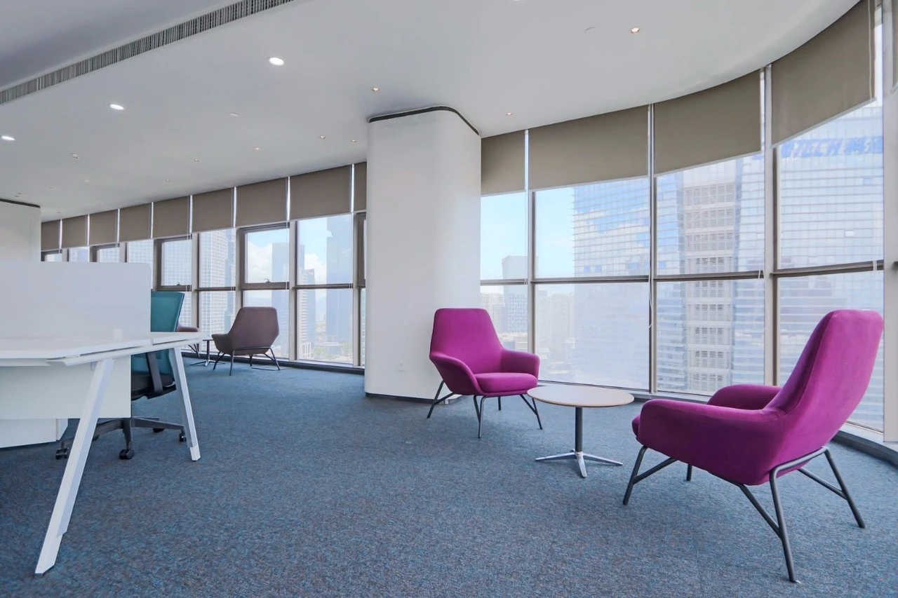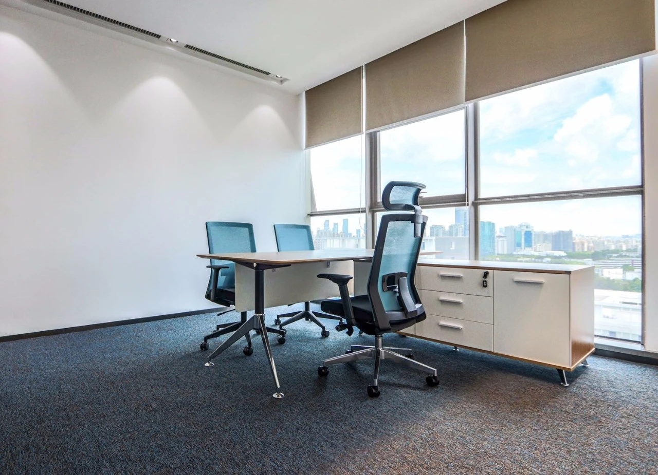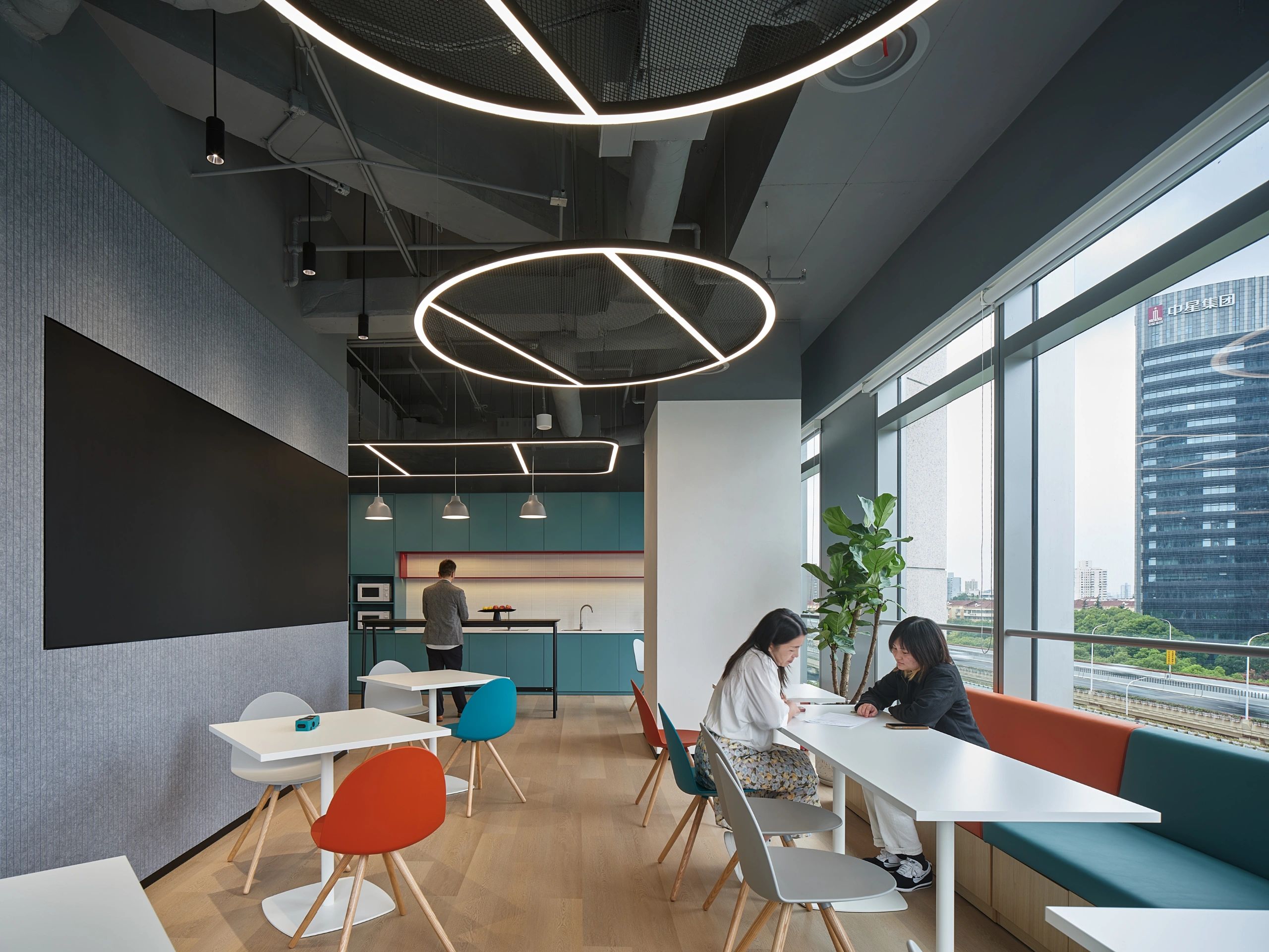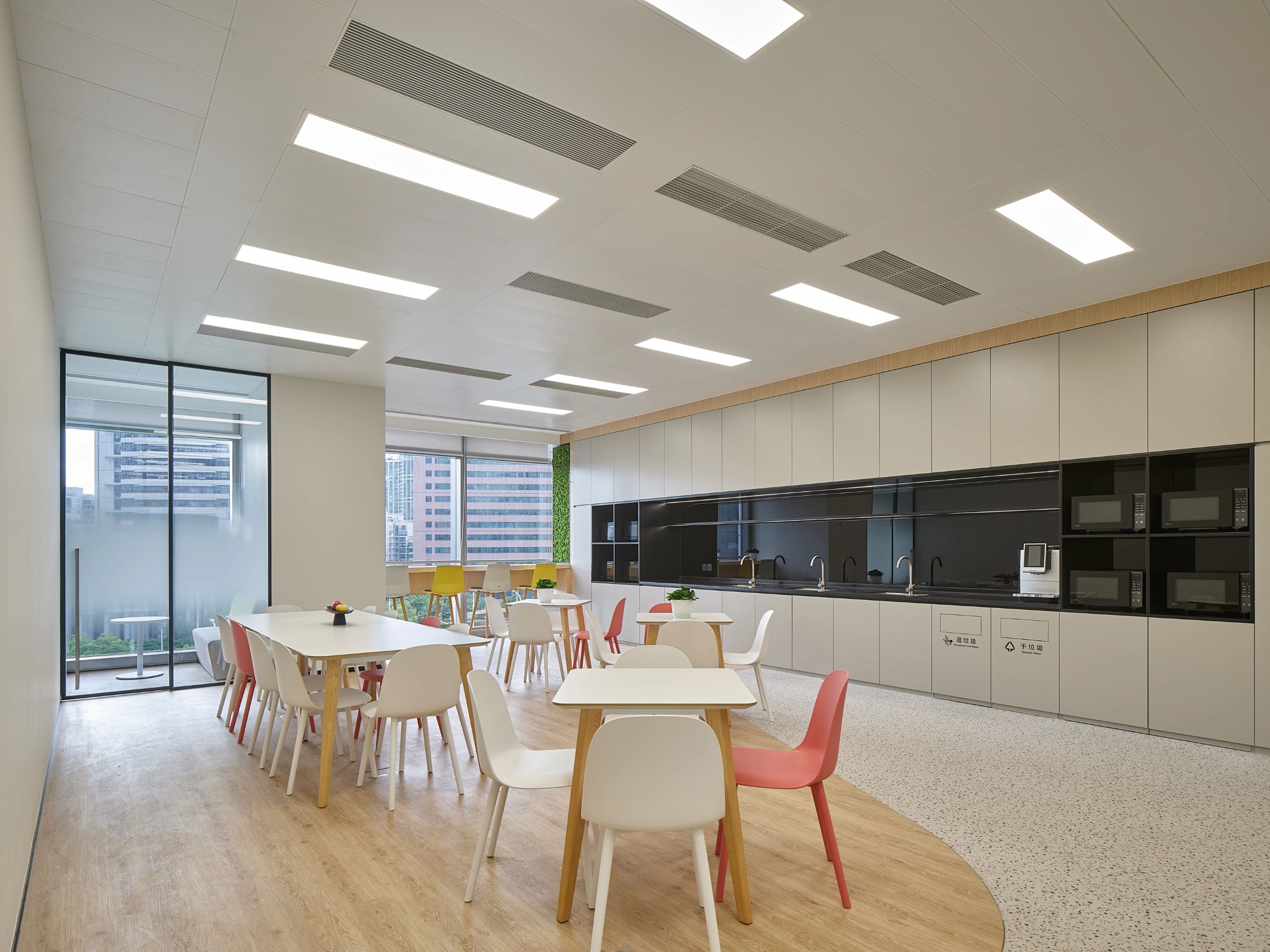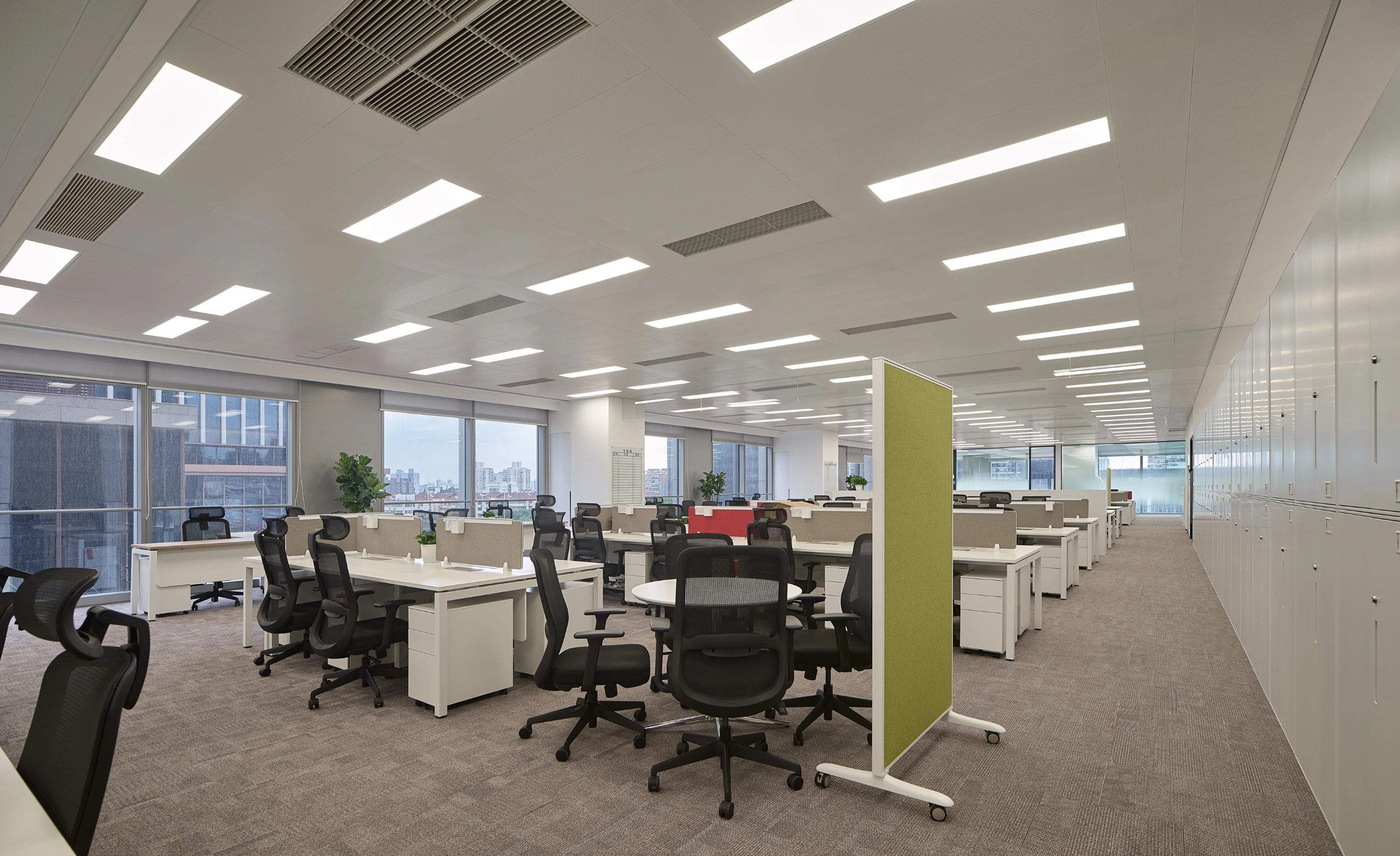 办公区在采光方面加强了绿色环保的自然光的利用人工照明也尽量柔和不刺眼目照明光线是通过吊顶、搁板、墙面的反射或折射光除了一些玻璃与顶面灯带之间的虚幻结合本案大量使用白色面,大大地提升了空间感为了符合高科技的设计理念卡位也是特意选了不规则切割式都是为了给人一种直观的体验感,科技未来,简洁明快整屋色彩统一,蓝色与白色很好地结合在一起为整体空间带来明亮感
