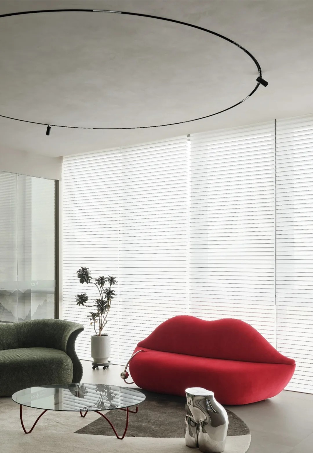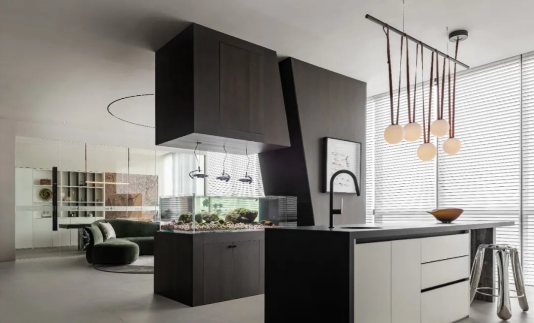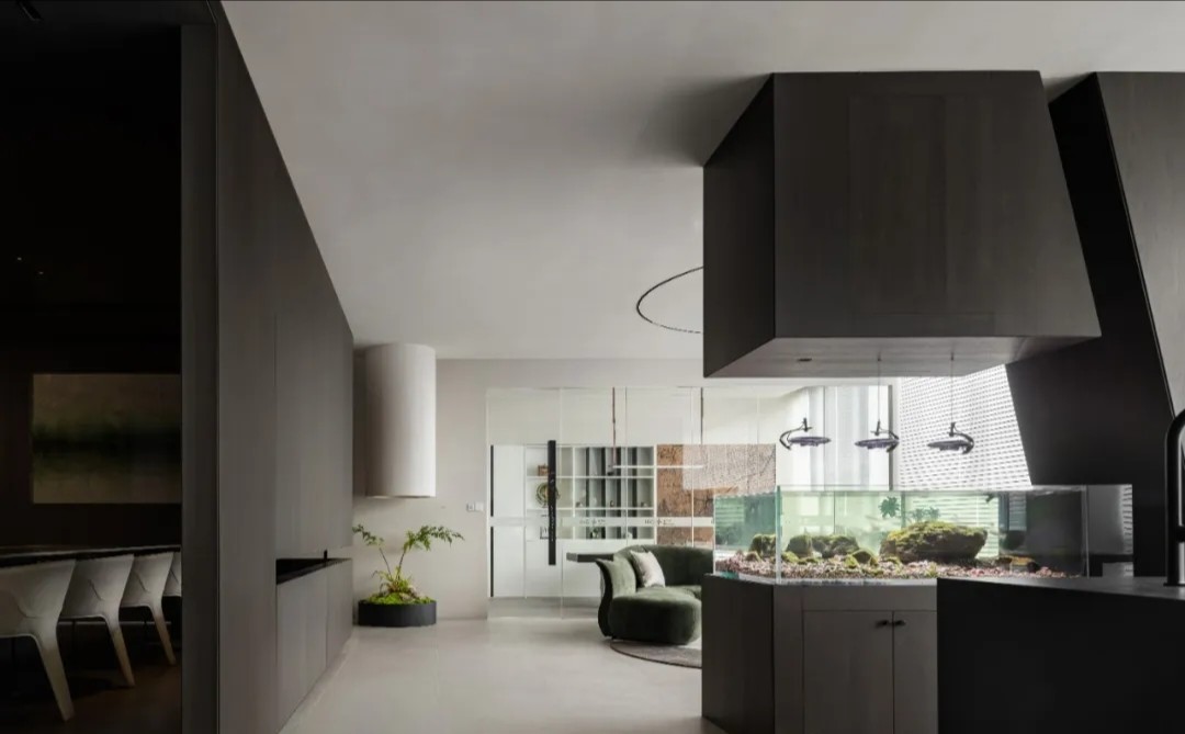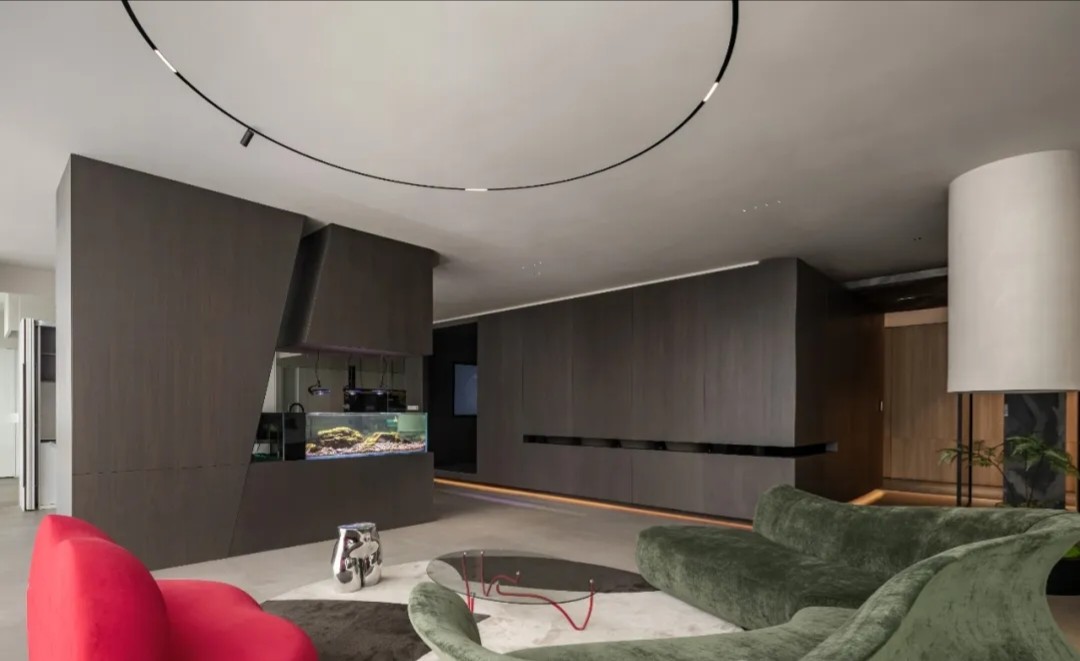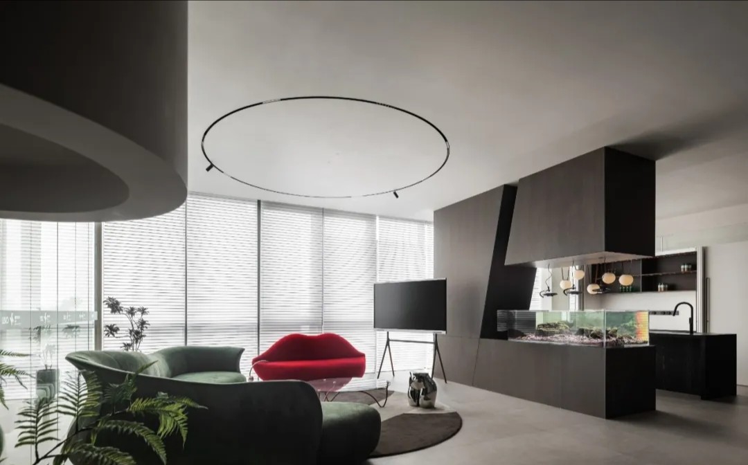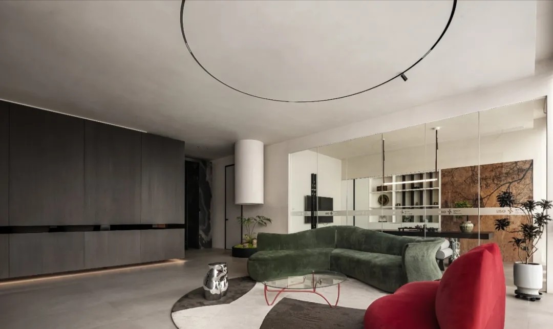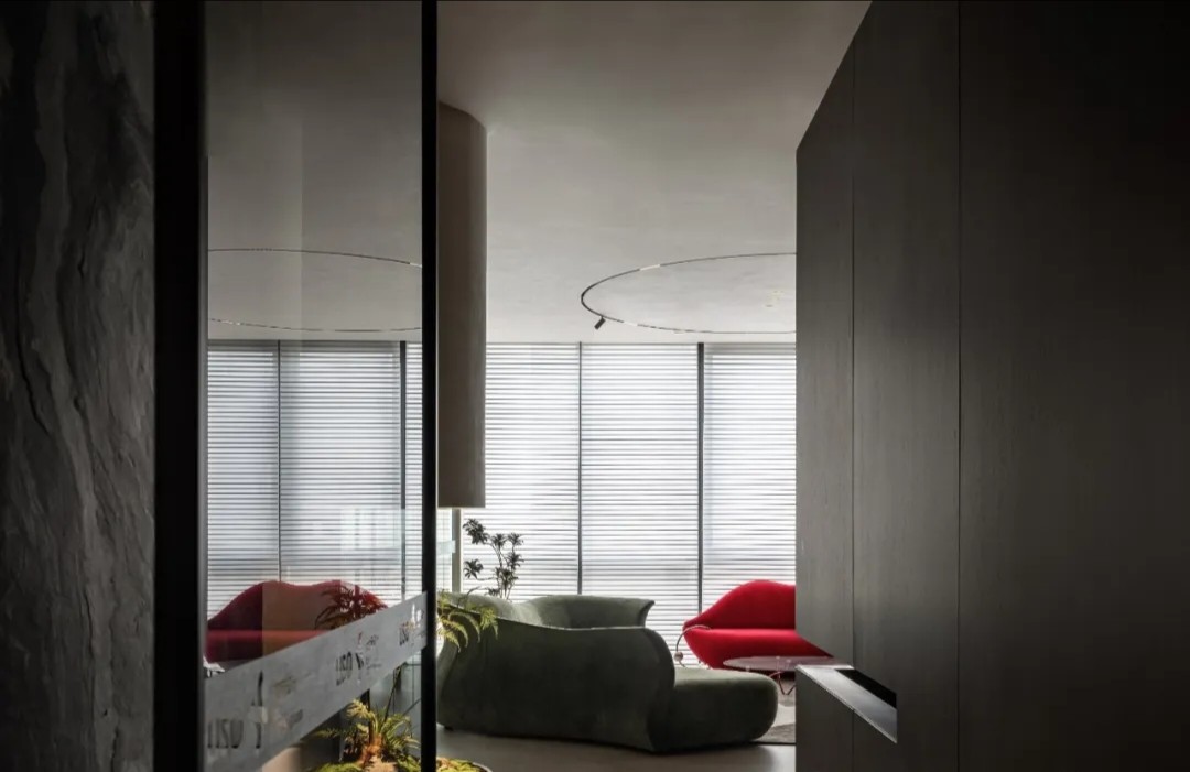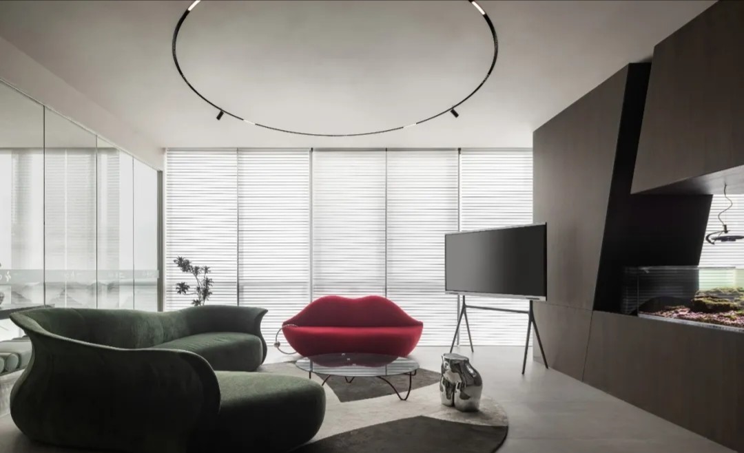 软装陈设强调艺术性与品质感,绿色异形沙发和红色嘴唇沙发撞色搭配,碰撞简洁空间下的趣味与活力,赋予会客室优雅与松弛感。以会议室串联会客区与办公室,增强办公室的高效流动与灵活交互,最大化放大空间的体验感与复合性。(自制鱼钩装饰画,溪流缸)