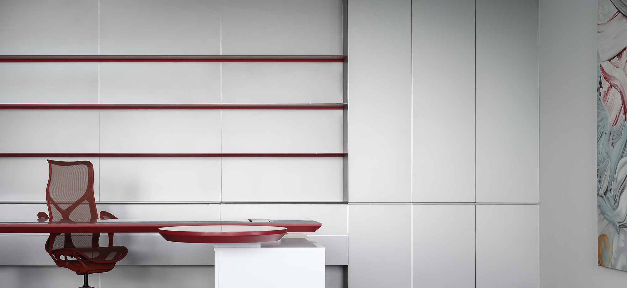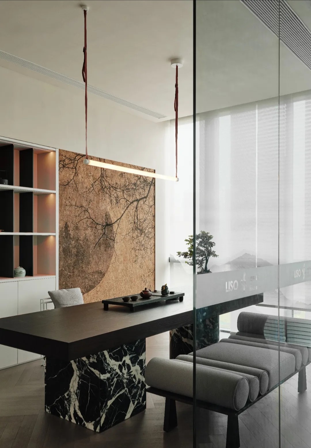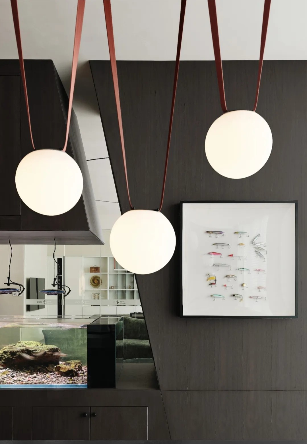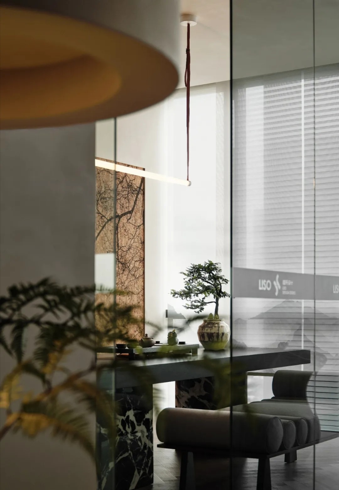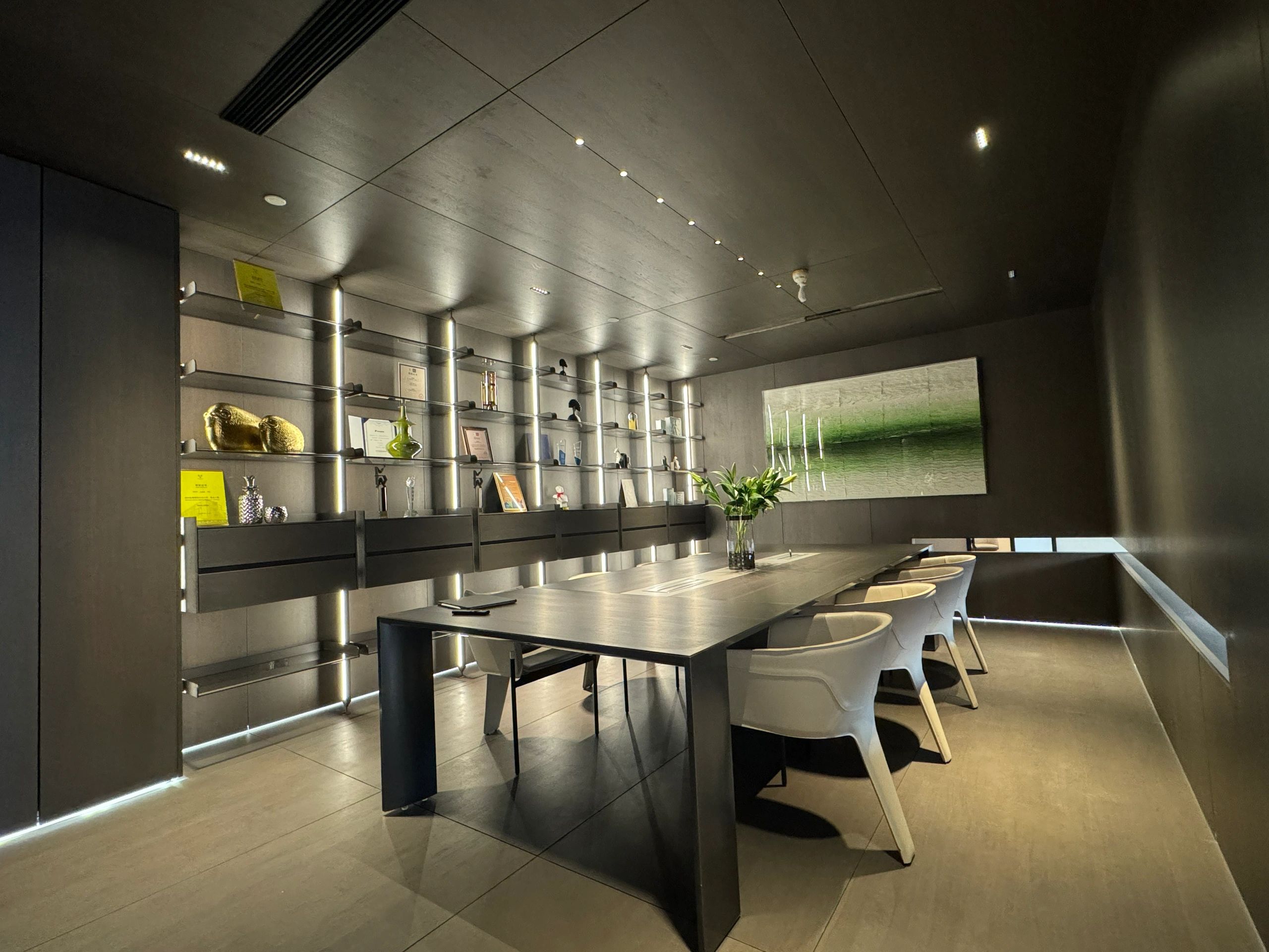 软装陈设强调艺术性与品质感,绿色异形沙发和红色嘴唇沙发撞色搭配,碰撞简洁空间下的趣味与活力,赋予会客室优雅与松弛感。以会议室串联会客区与办公室,增强办公室的高效流动与灵活交互,最大化放大空间的体验感与复合性。(自制鱼钩装饰画,溪流缸)