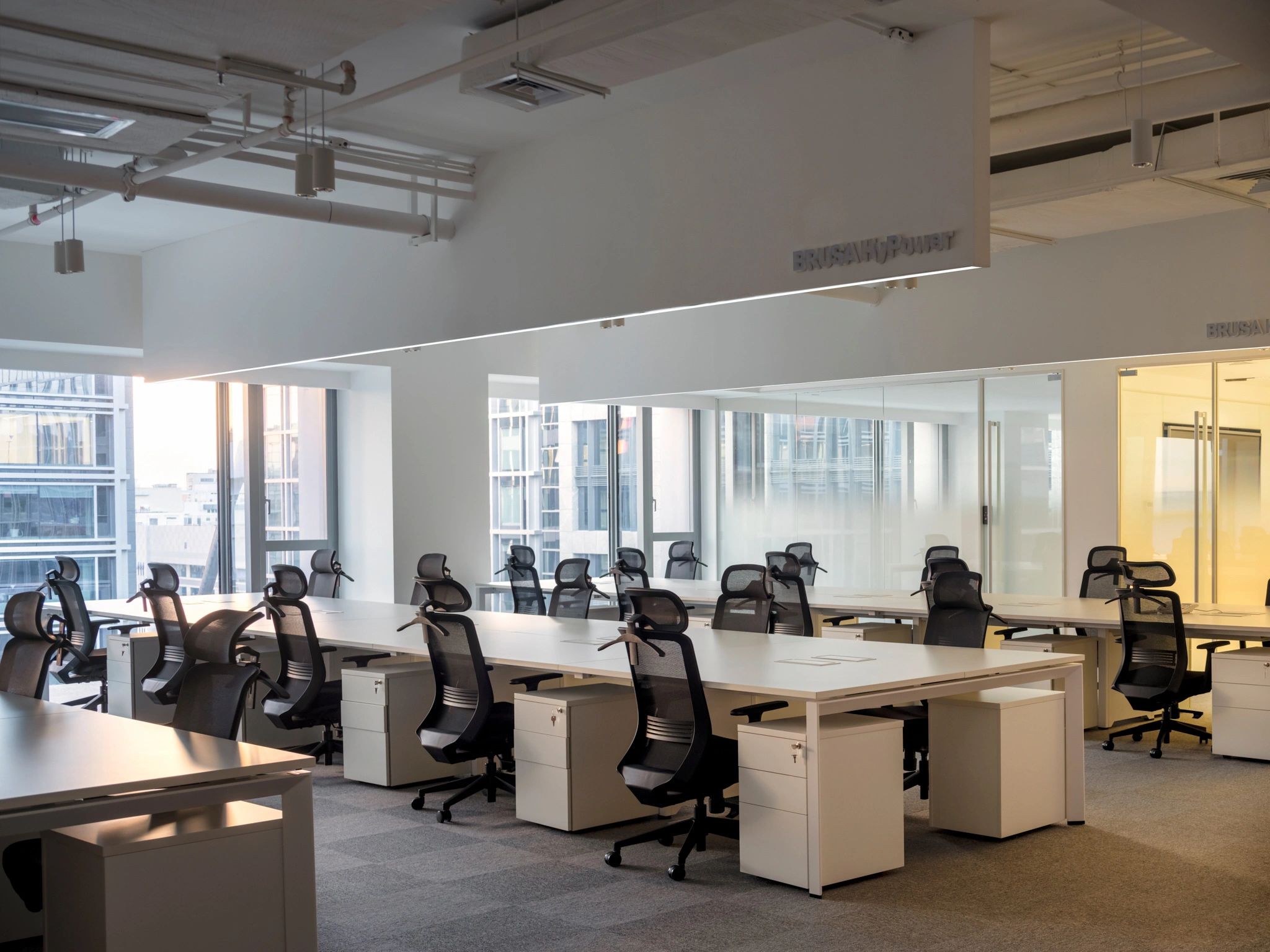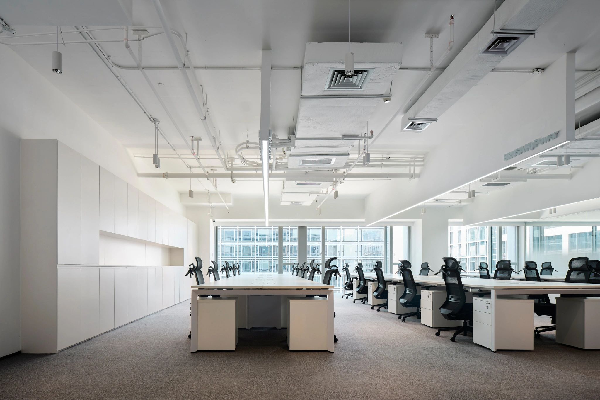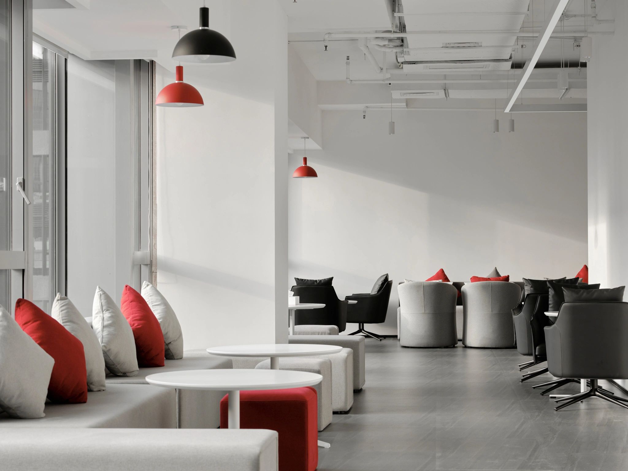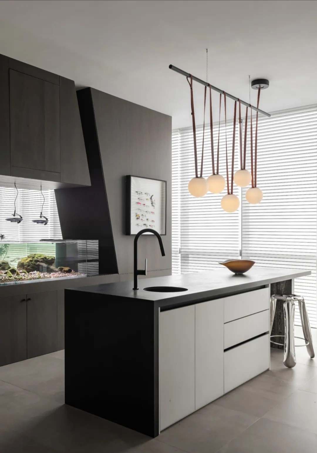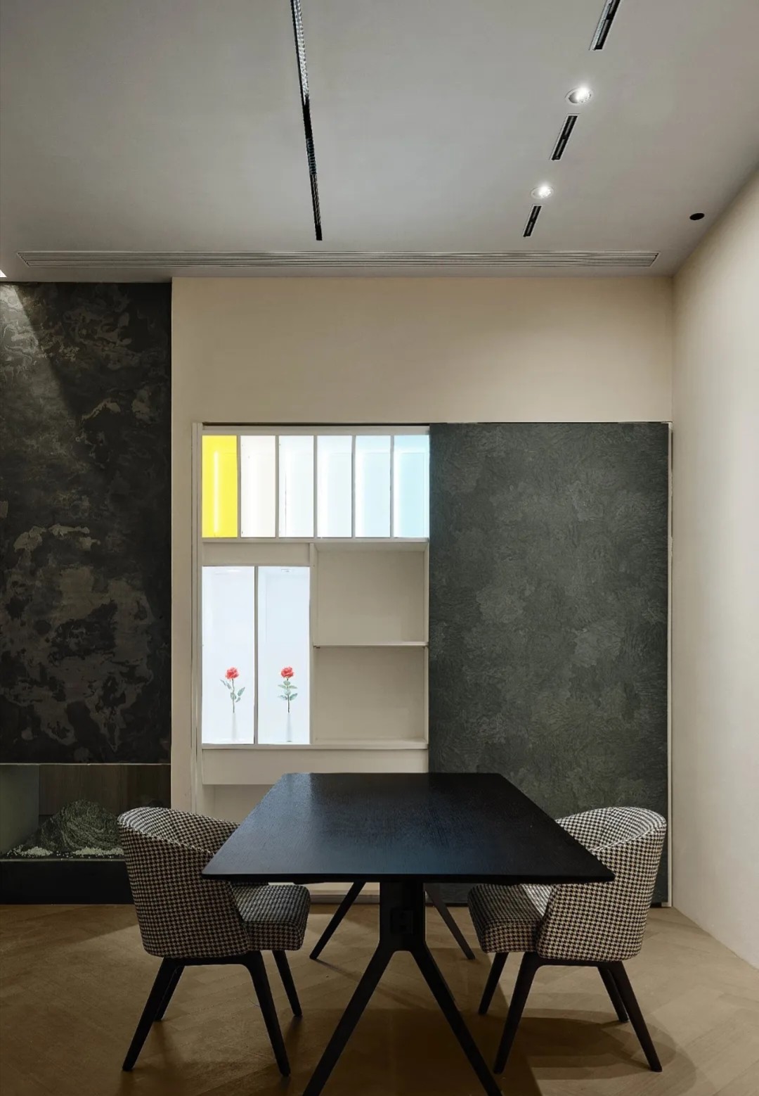 软装陈设强调艺术性与品质感,绿色异形沙发和红色嘴唇沙发撞色搭配,碰撞简洁空间下的趣味与活力,赋予会客室优雅与松弛感。以会议室串联会客区与办公室,增强办公室的高效流动与灵活交互,最大化放大空间的体验感与复合性。(自制鱼钩装饰画,溪流缸)