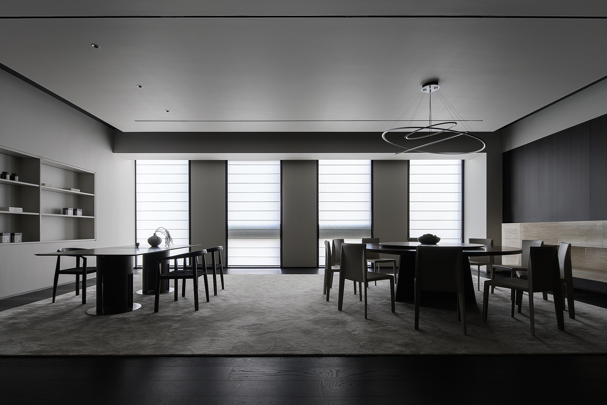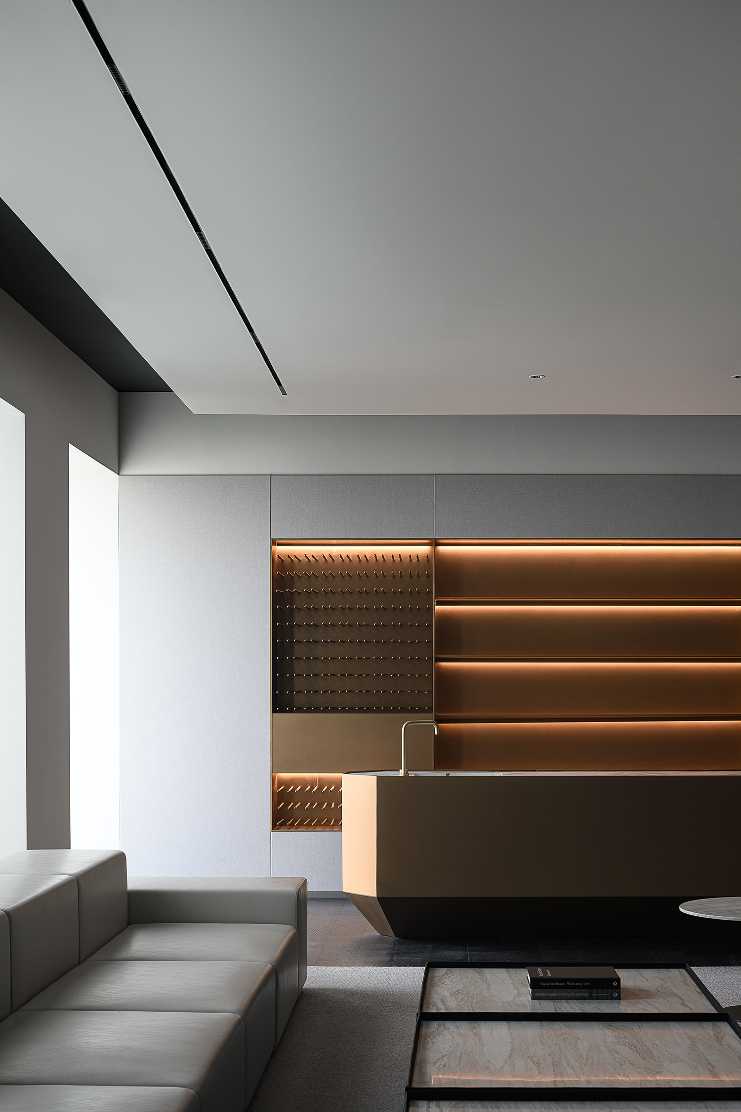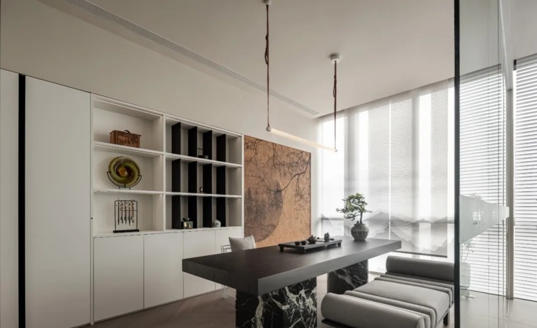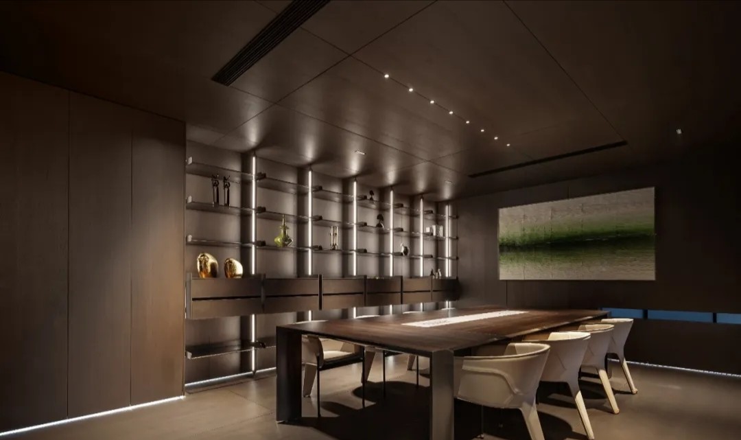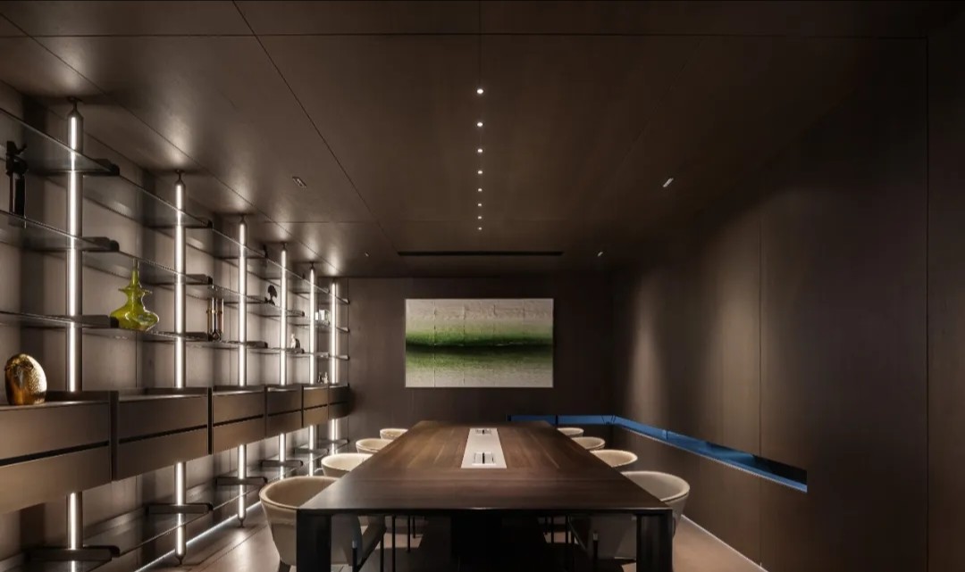 柜体以隐藏式蝴蝶门设计的方式嵌入必要的功能,打开则为吧台的提供补充;合上则可确保视觉的完整性。一体的木饰面,灵活的划分了会议室空间,开放的环形动线,让空间更加高效灵动。会议室通过简练的展示柜、色调、材质的组合搭配,考究细节与尺度,呈现理性与纯粹的气度。