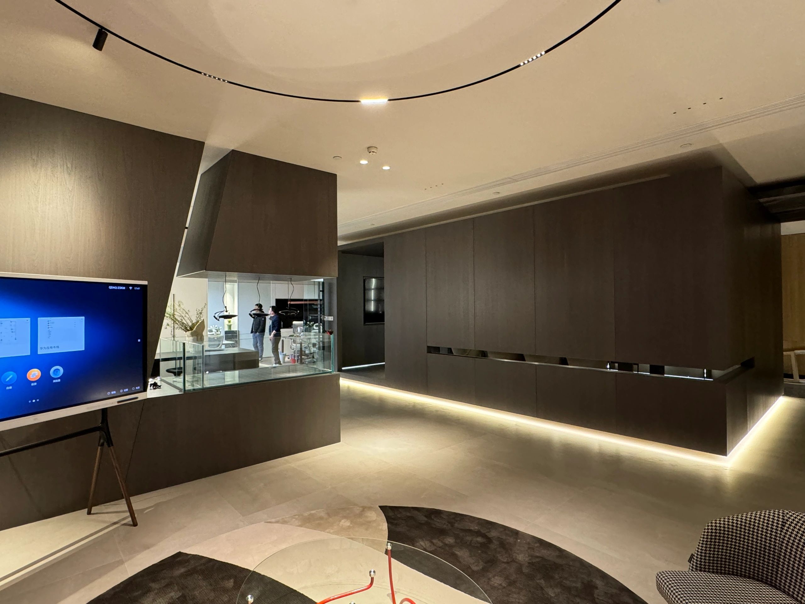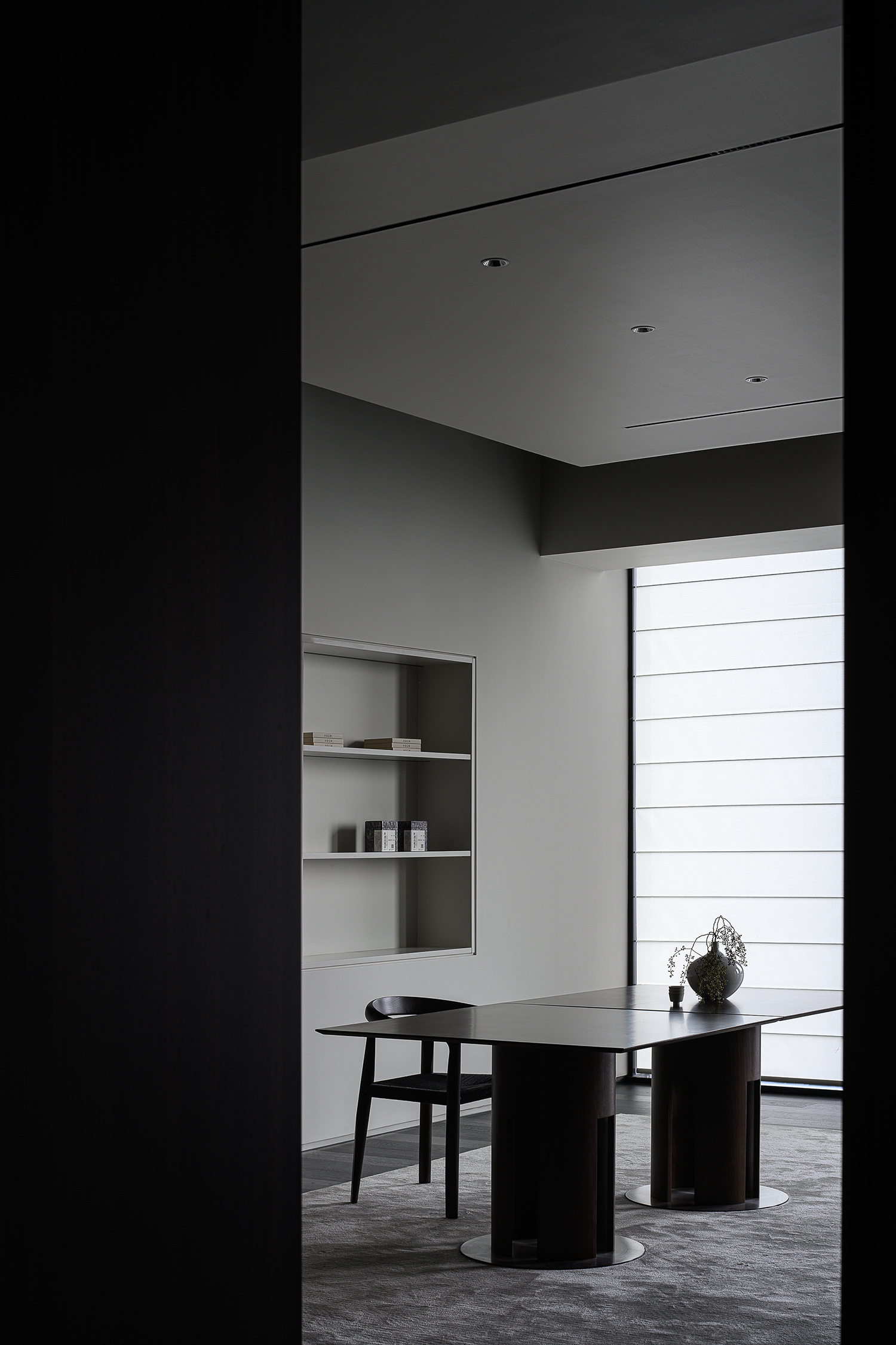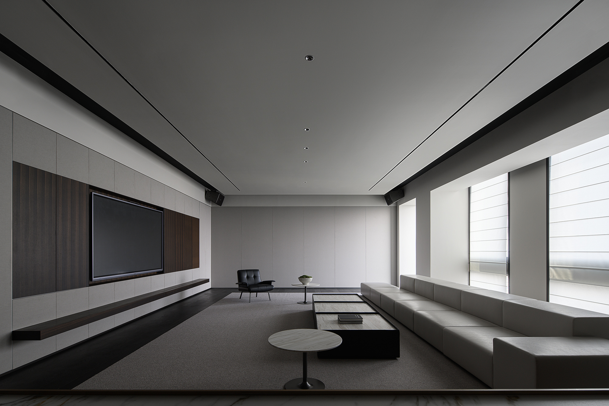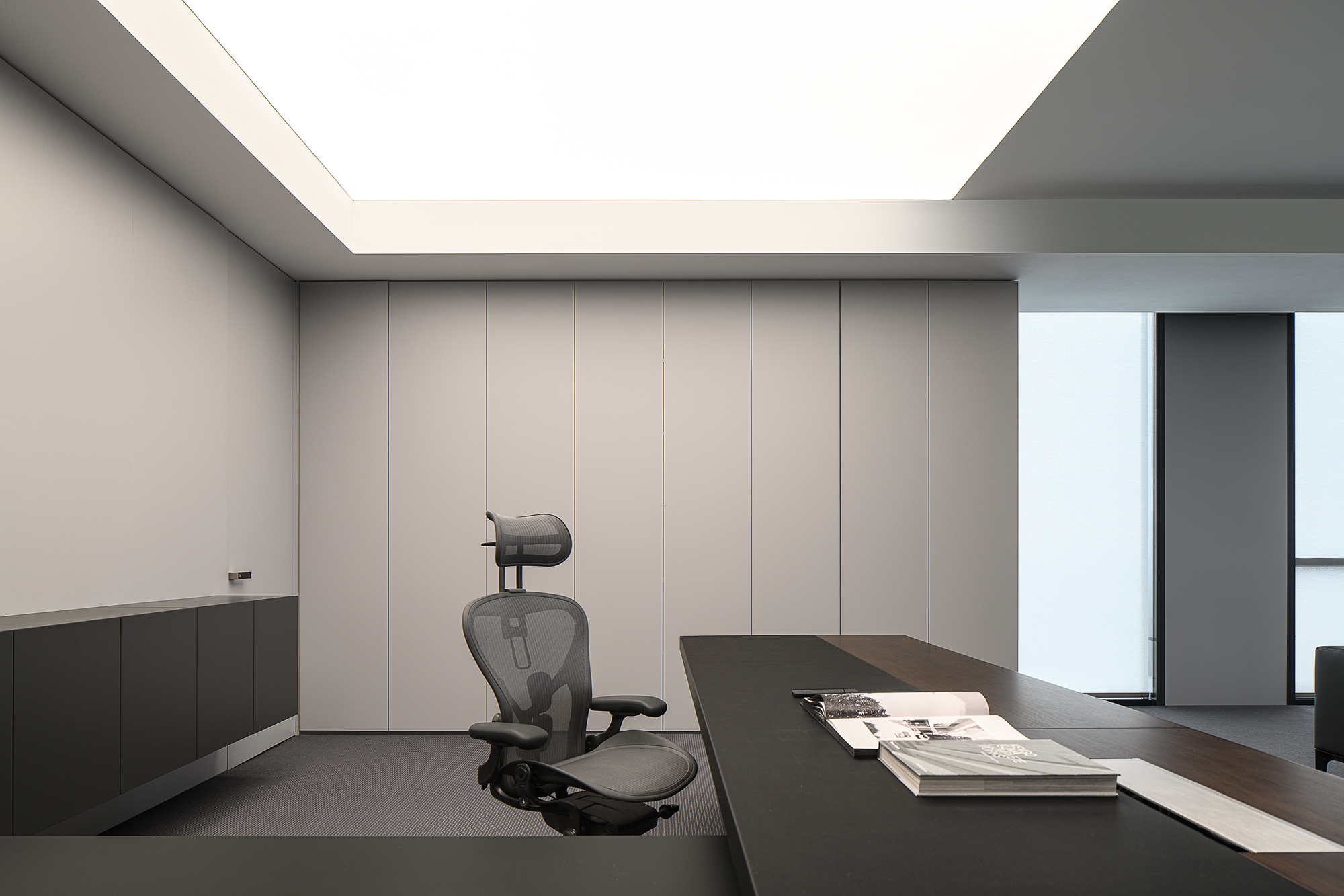 柜体以隐藏式蝴蝶门设计的方式嵌入必要的功能,打开则为吧台的提供补充;合上则可确保视觉的完整性。一体的木饰面,灵活的划分了会议室空间,开放的环形动线,让空间更加高效灵动。会议室通过简练的展示柜、色调、材质的组合搭配,考究细节与尺度,呈现理性与纯粹的气度。
