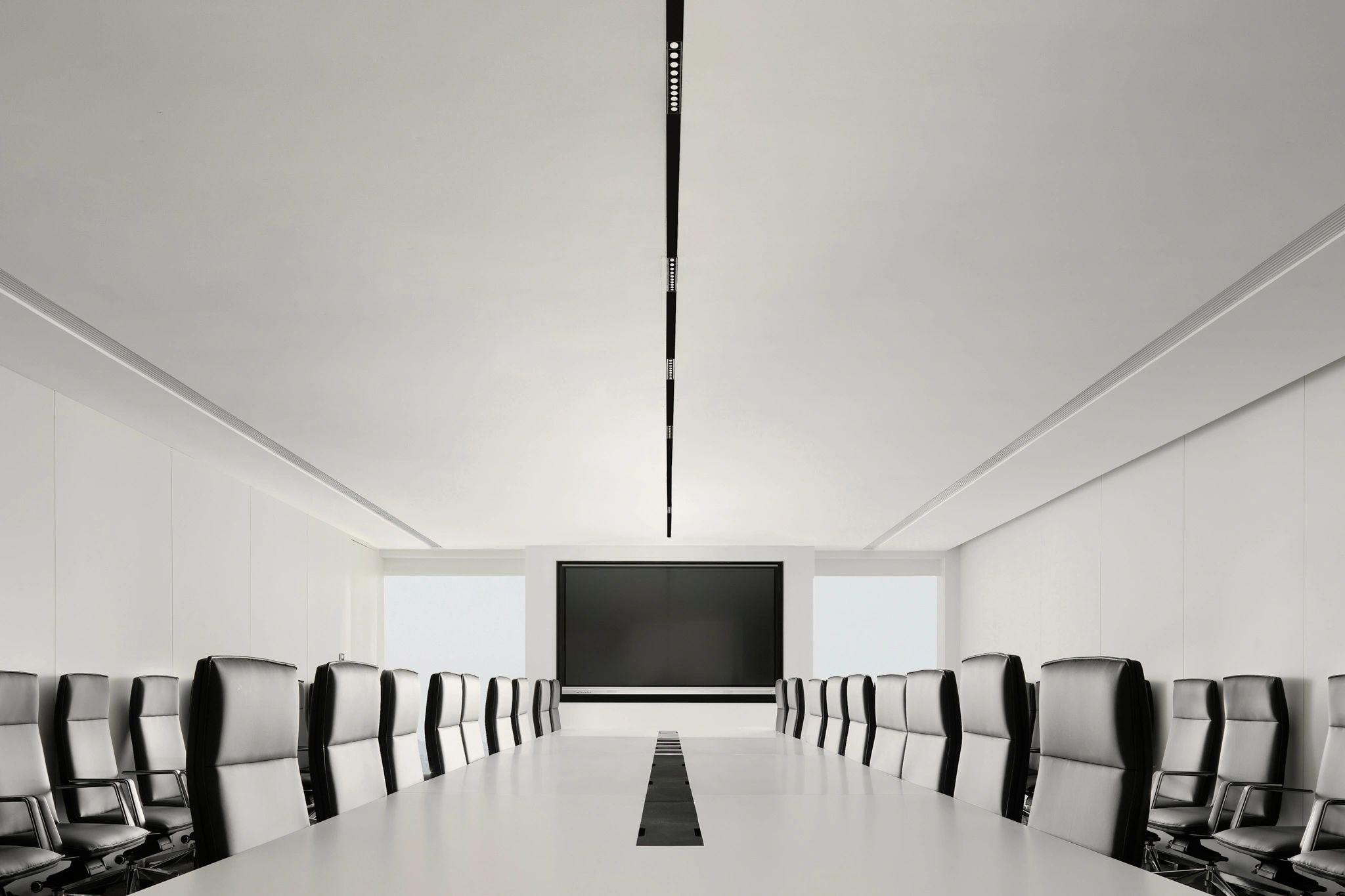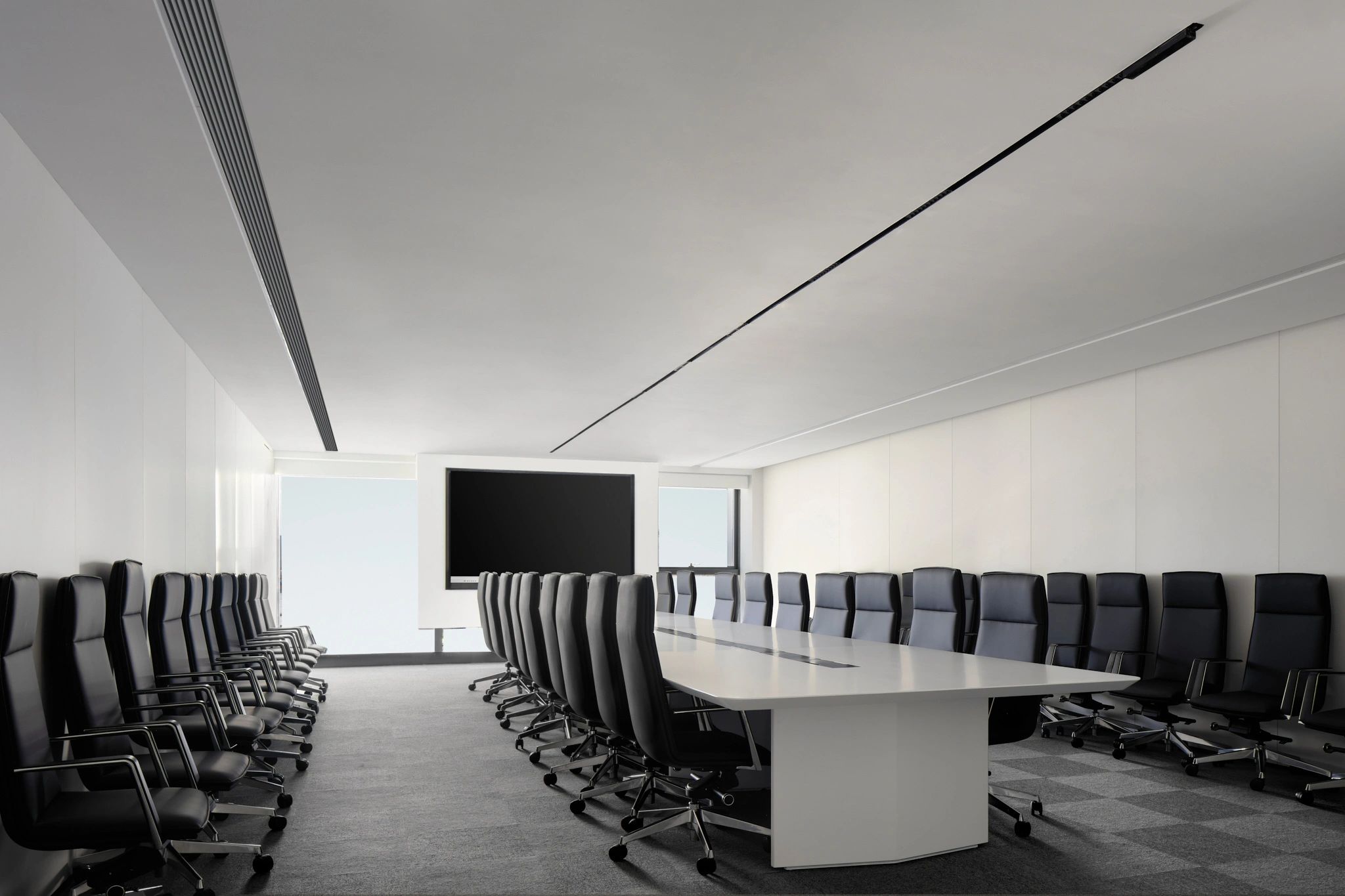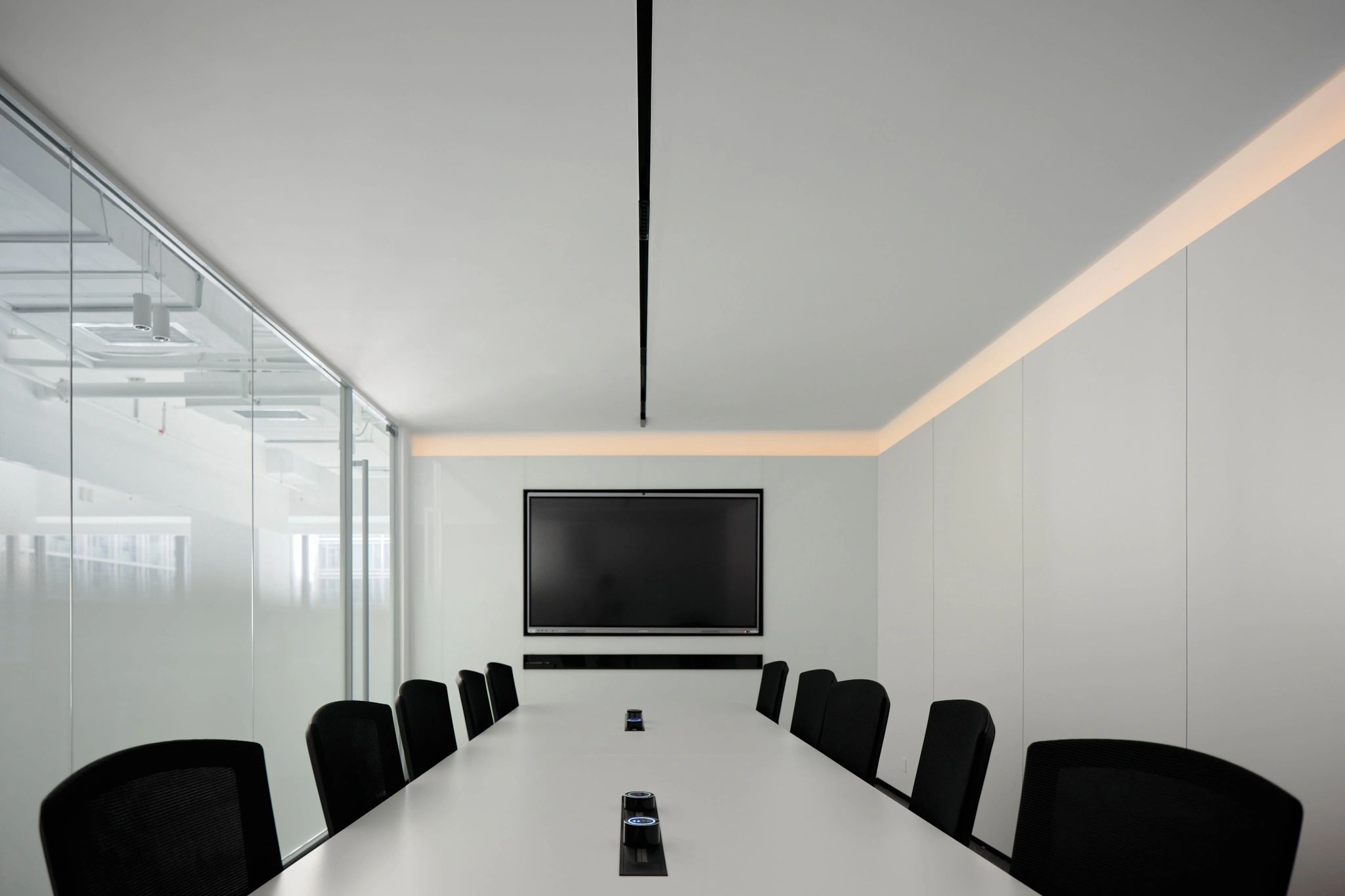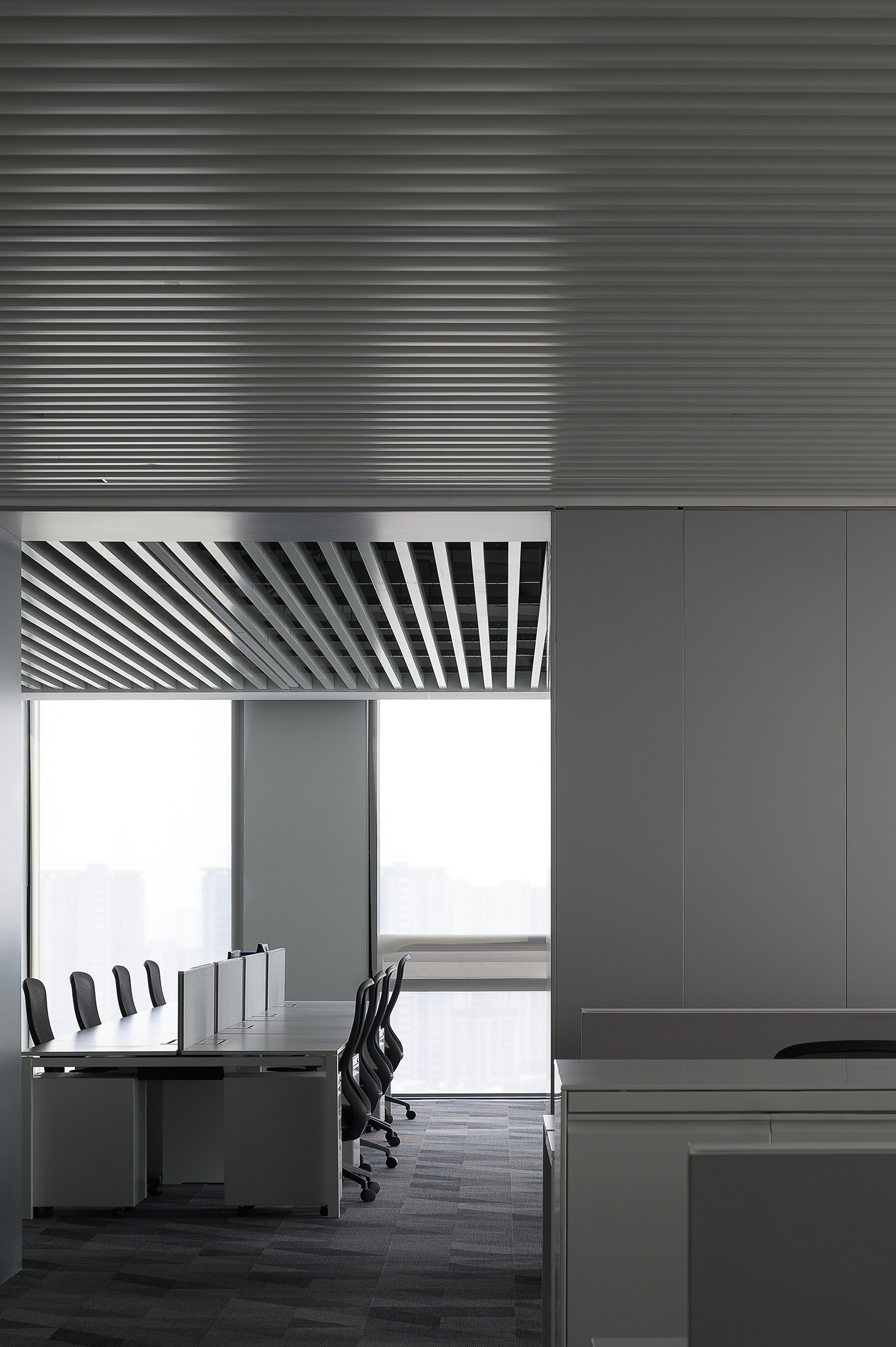 柜体以隐藏式蝴蝶门设计的方式嵌入必要的功能,打开则为吧台的提供补充;合上则可确保视觉的完整性。一体的木饰面,灵活的划分了会议室空间,开放的环形动线,让空间更加高效灵动。会议室通过简练的展示柜、色调、材质的组合搭配,考究细节与尺度,呈现理性与纯粹的气度。